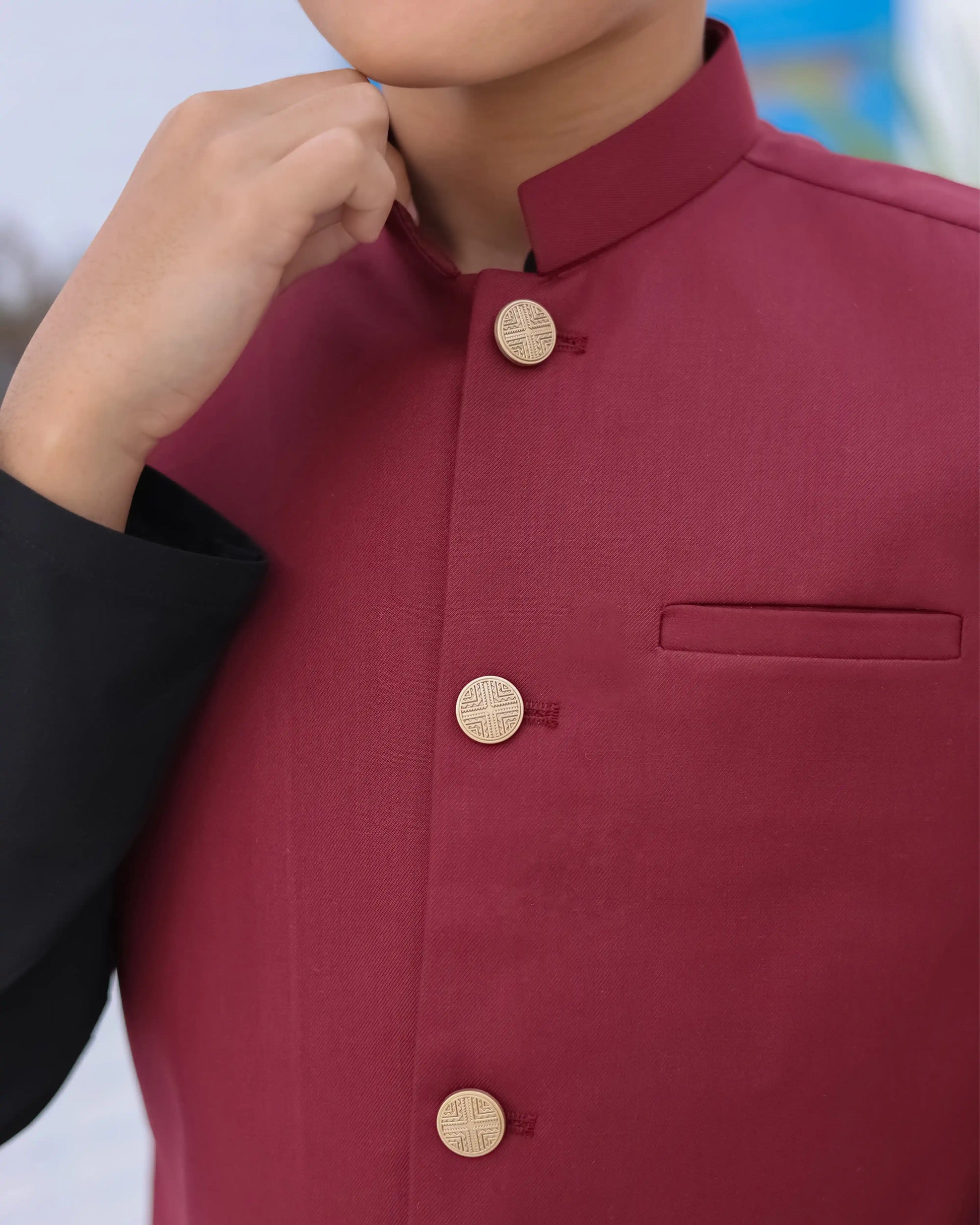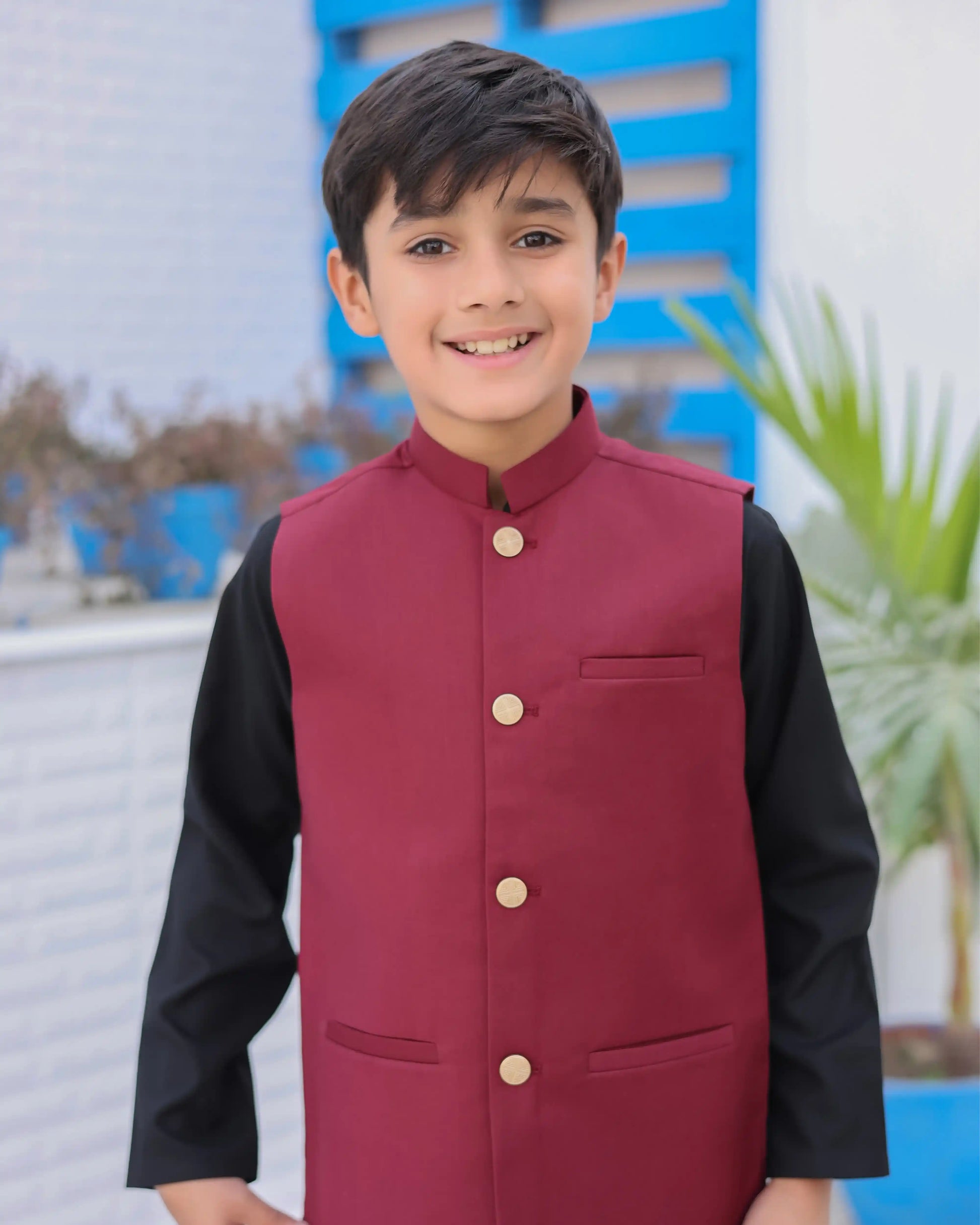 Dress Your Child in Classic Elegance with a Black Kurta and Trouser, Paired with a Maroon Waistcoat, Perfect for Formal Occasions with Timeless Style and Sophistication.
