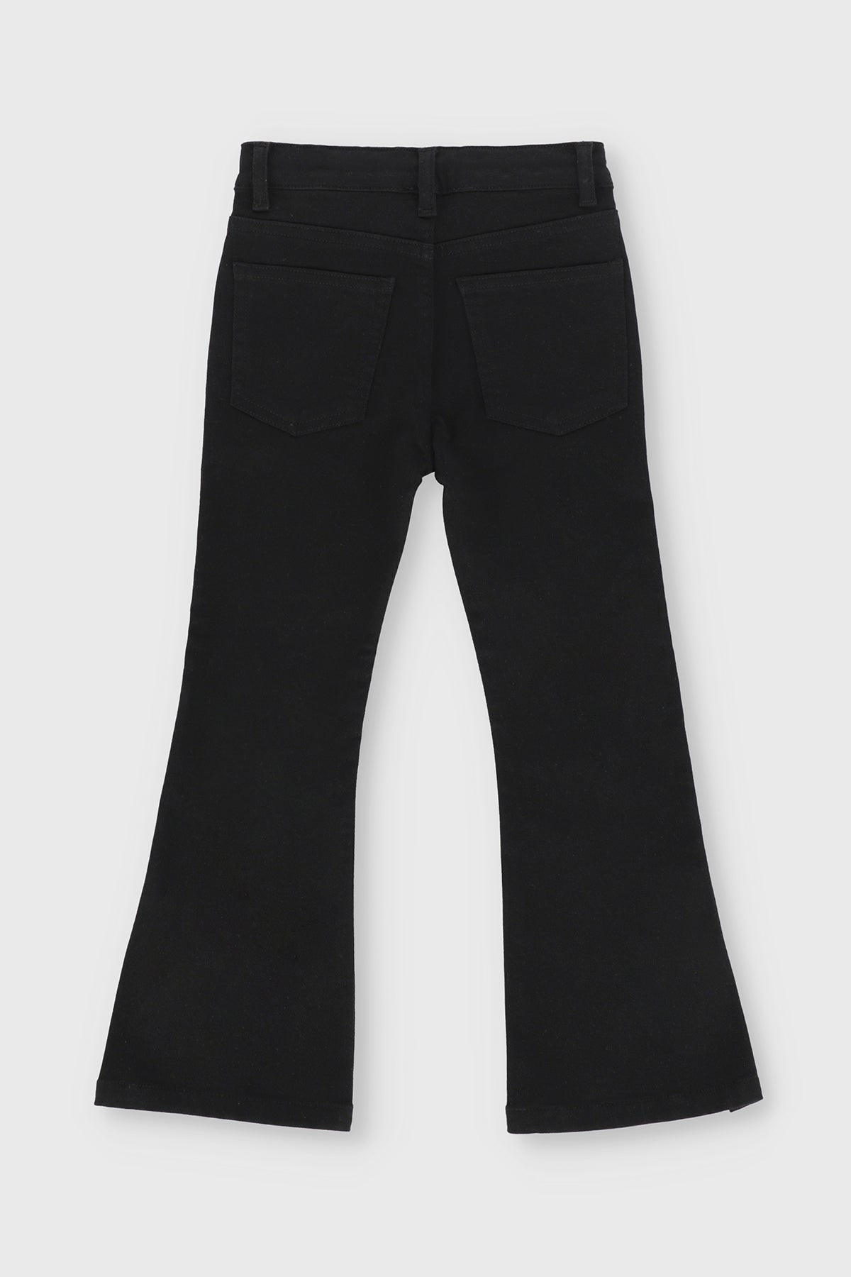 Denim Jeans With Regular Waist Band. Metal Rivets. Centre Front Button And Loops. Front Slash Pockets. Single Coin Pocket. Back Yoke And Patch Pockets. Wide Hem With Outseam Slit