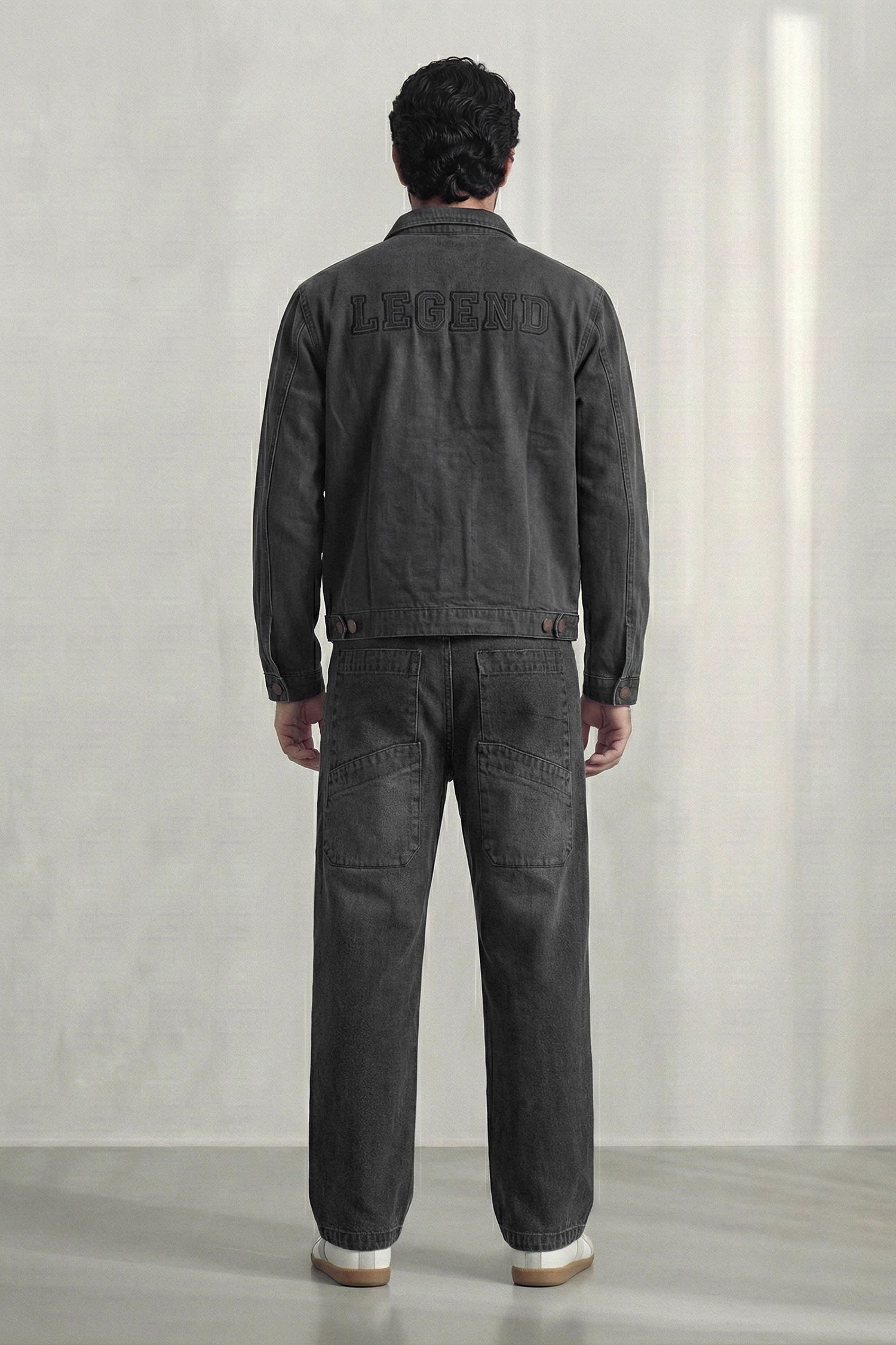 This denim jacket features a sleek zip-up front with a collar features the text "LEGEND" done in patchwork on the back and designed with slanted welt pockets and a zip chest pocket for added utility. A versatile layering piece that blends casual ease with workwear-inspired style.