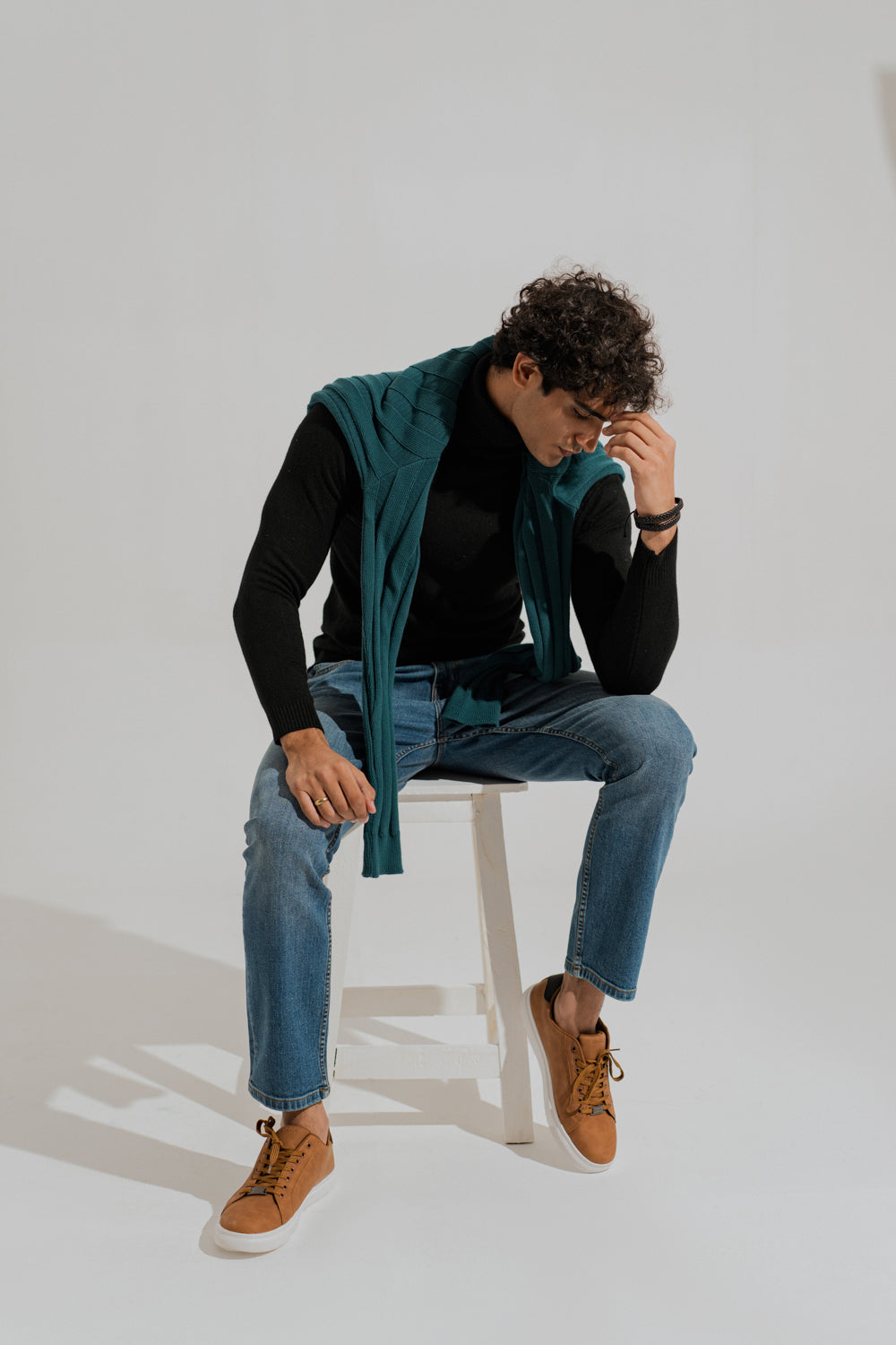 This slim fit high neck black sweater is composed of a mixed fabric blend for warmth and style. Perfect for both casual and formal settings.