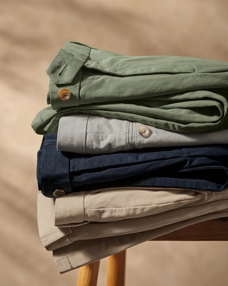 Introducing our new chino style, crafted from lighter weight cotton for a relaxed, versatile fit. The garment-dyed finish softens the colour and fabric for an ultra-soft feel, while the added stretch ensures comfort and freedom of movement. These chinos are smart enough for work but equally perfect for more casual occasions. Look closely; you’ll find fine details like buttoned welt pockets and a French bearer button, adding a tailored touch to this effortlessly stylish piece.