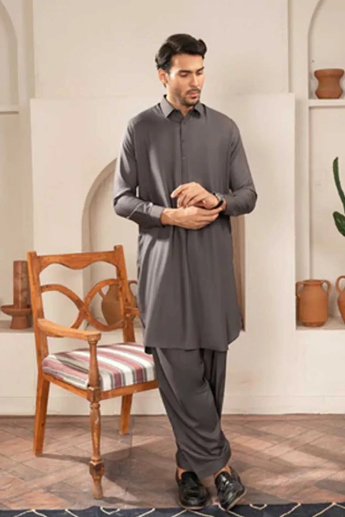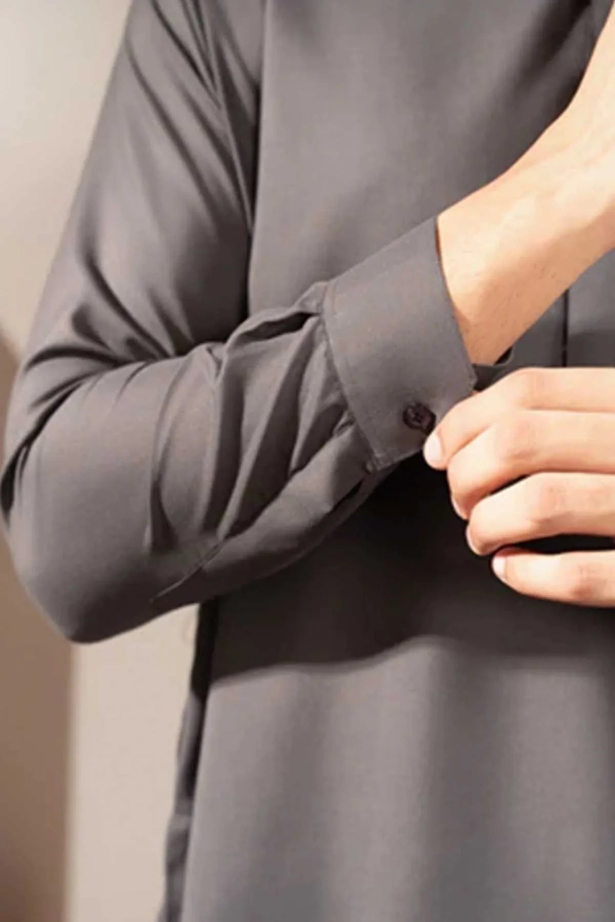 Mens 2 Piece Shalwar Kameez Set Features A Wash and Wear Fabric In A Sophisticated Grey Color. The Long Kurta Top With Straight Leg Bottom Offers A Daily Wear Staple Suitable For All Seasons. Elevate Your Eastern Wardrobe With This Timeless Ensemble.