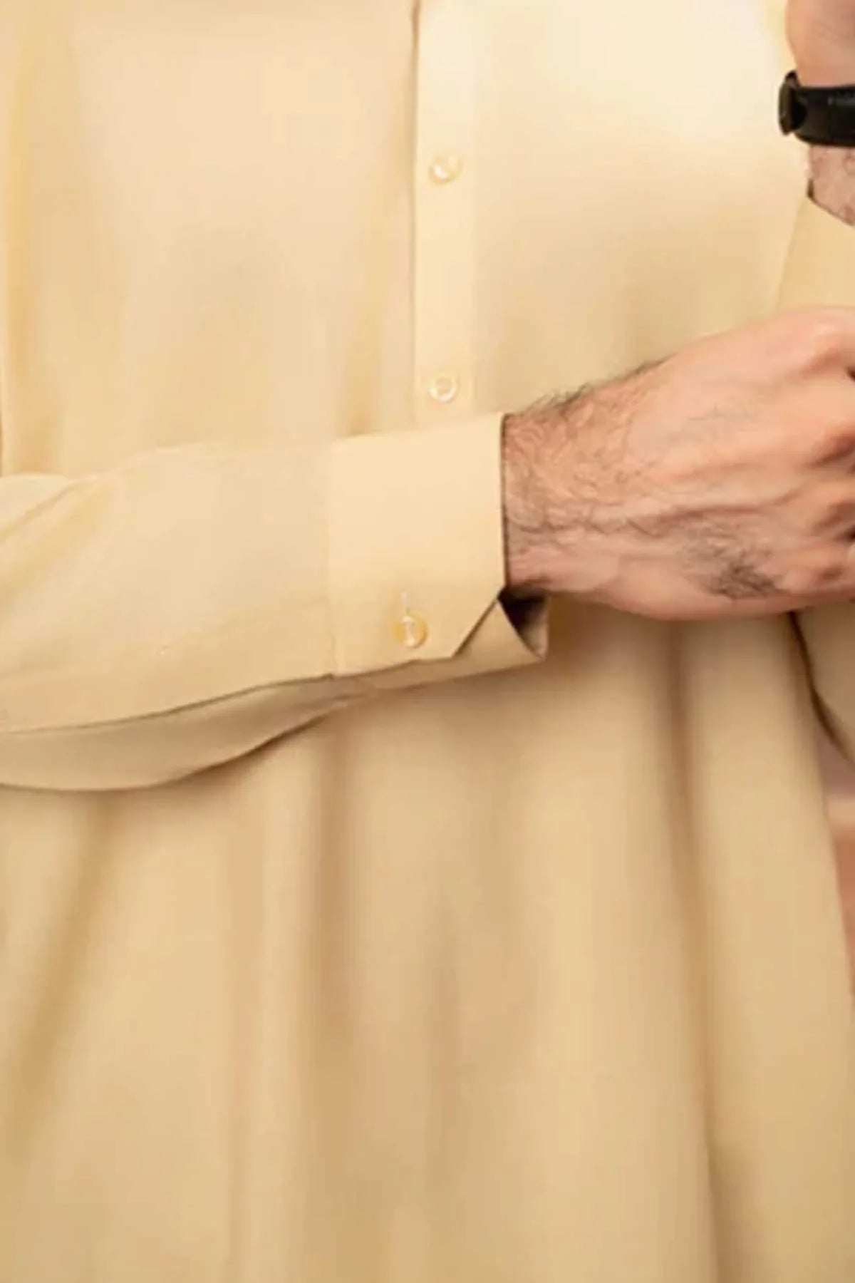 Mens Wash and Wear Shalwar Kameez In A Sophisticated Cream Color Is Perfect For Daily Wear. The Straight Cut Top And Straight Leg Bottom Offer A Classic Yet Comfortable Fit. The 2 Piece Set Is Versatile For All Seasons. Elevate Your Eastern Wardrobe With This Buraq
