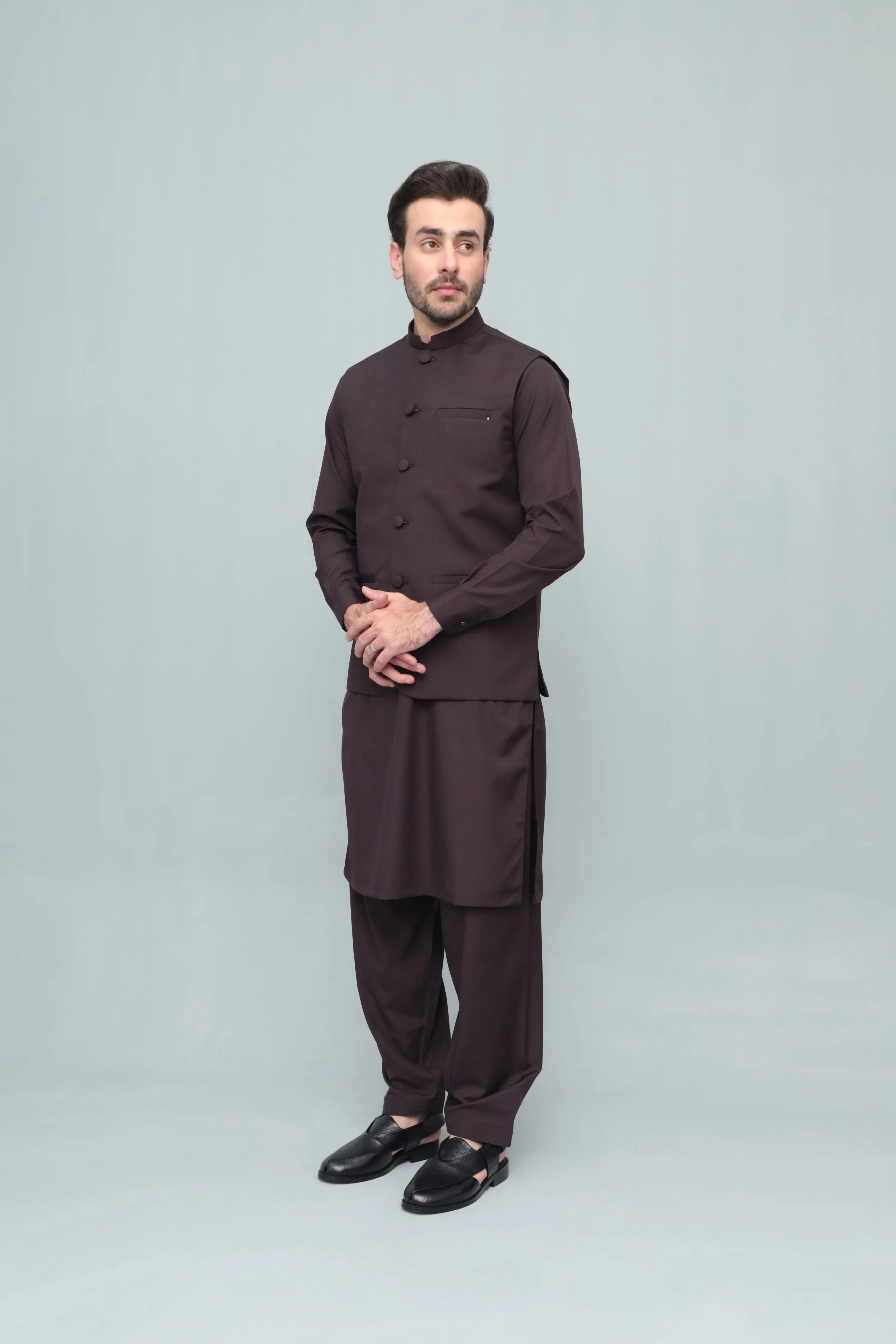 Chocolate Brown With Blended Waistcoat - Round Cut & Matching Fabric Buttons - Men