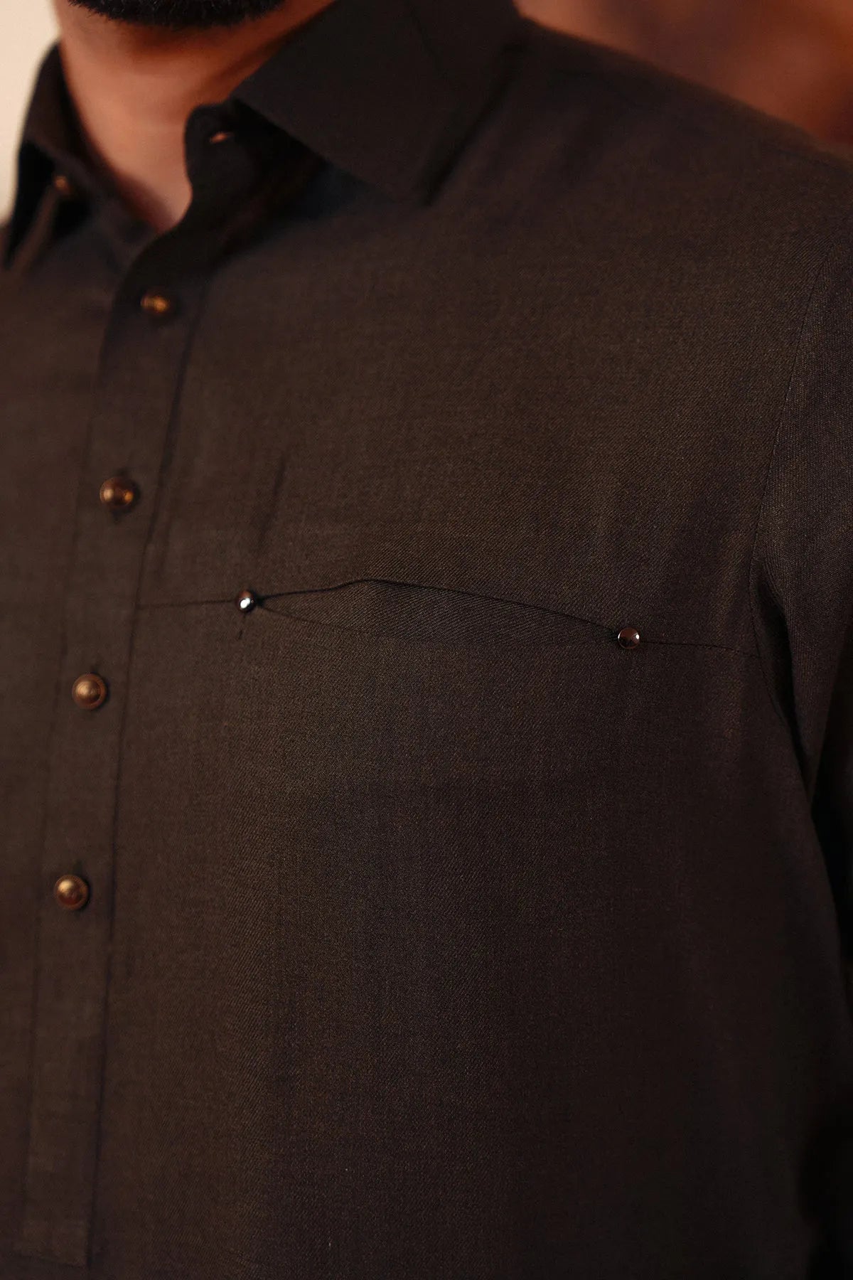 Metal pin accents on pocket and collar for a modern edge