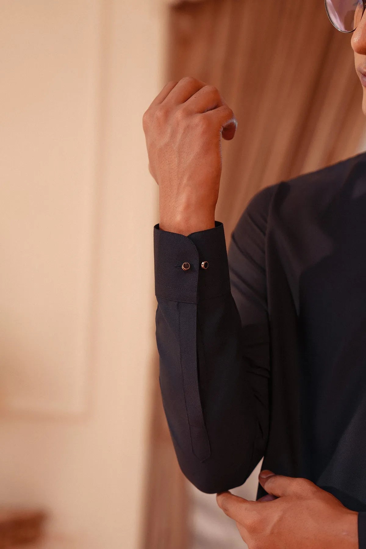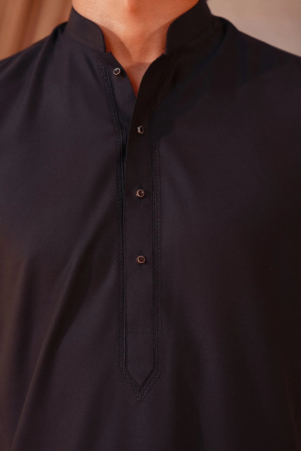 A timeless essential reimagined for the modern man — this black kurta set is tailored from smooth premium fabric that drapes effortlessly while maintaining structure. The band collar and concealed button placket highlight its clean aesthetic, while subtle tonal stitching adds a hint of depth. Paired with matching trousers, it’s designed for sophistication that transitions seamlessly from daywear to formal occasions.