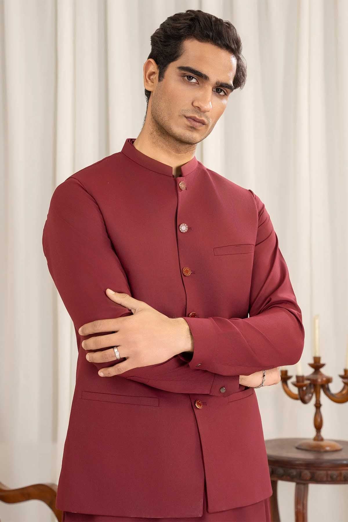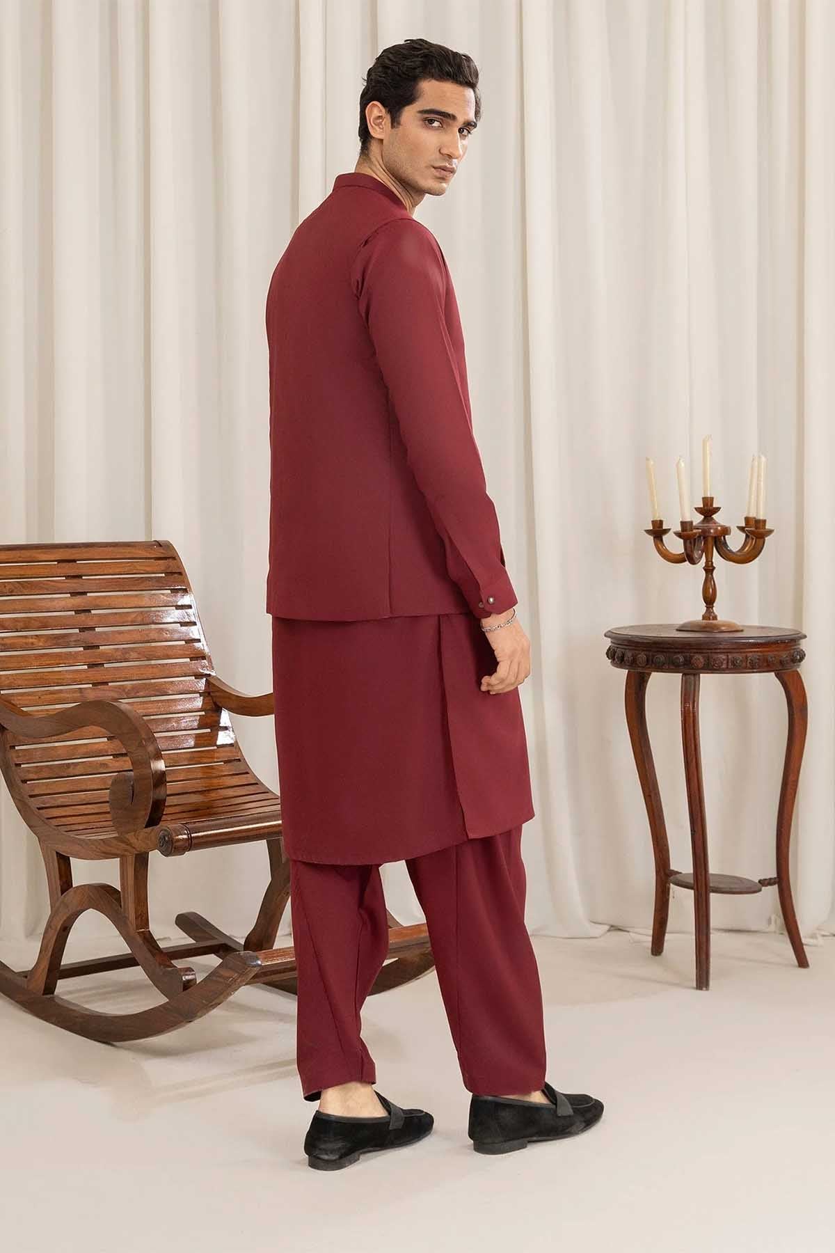 Men's Eastern 3 Piece Festive/Party Wear ensemble features a luxurious burgundy Wash & Wear fabric. The set includes a formal Kameez Shalwar paired with a blended waistcoat, adding elegance with its straight-cut design. Perfect for weddings and formal occasions, this outfit combines comfort and style effortlessly.