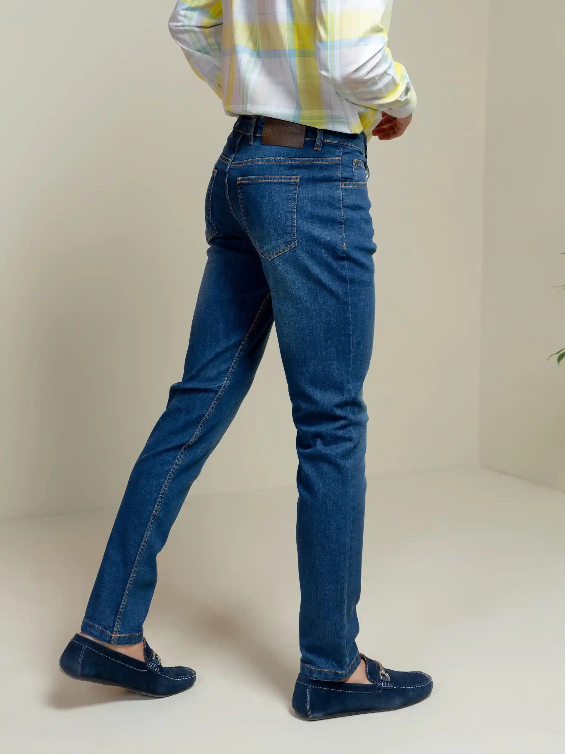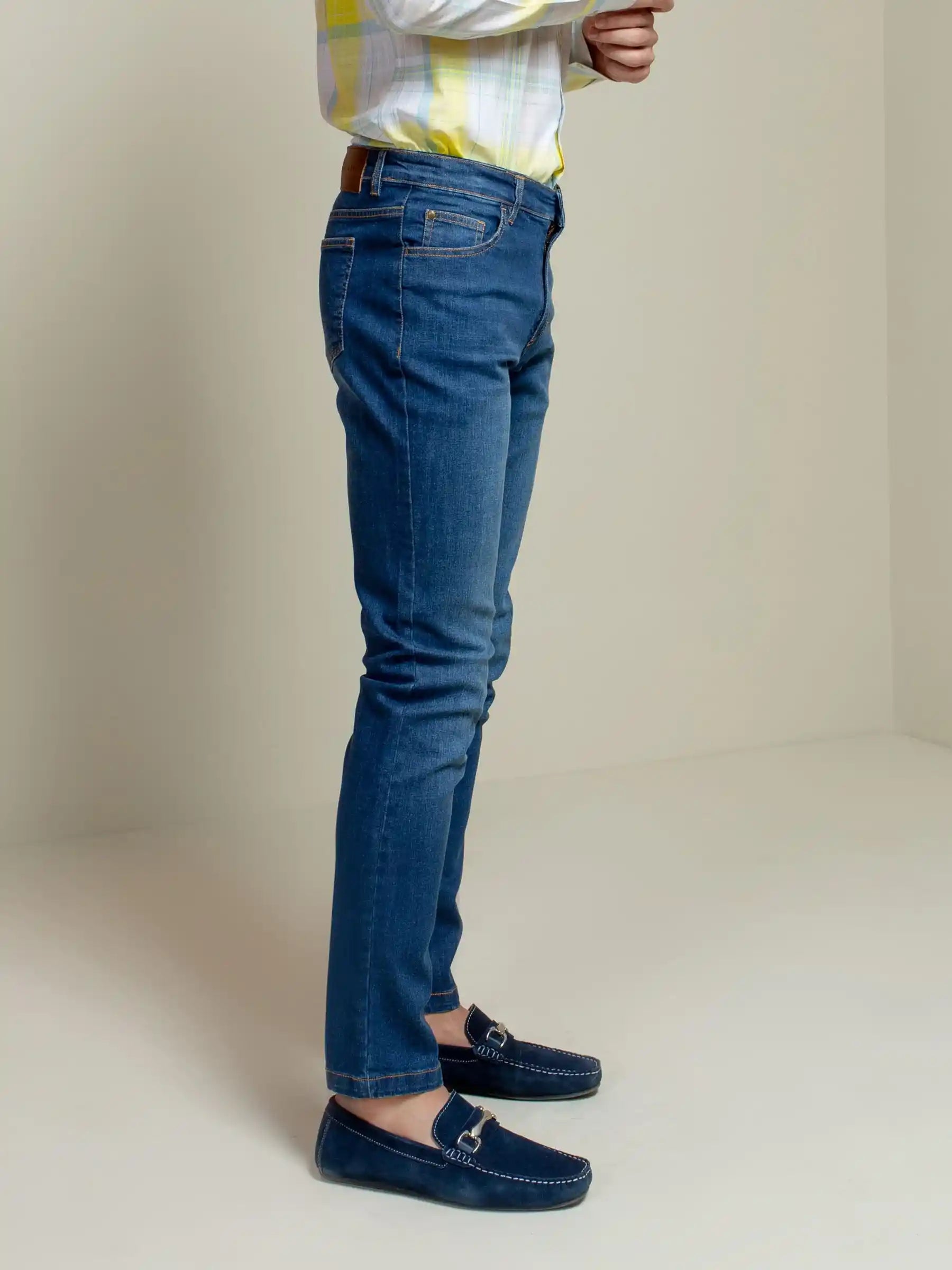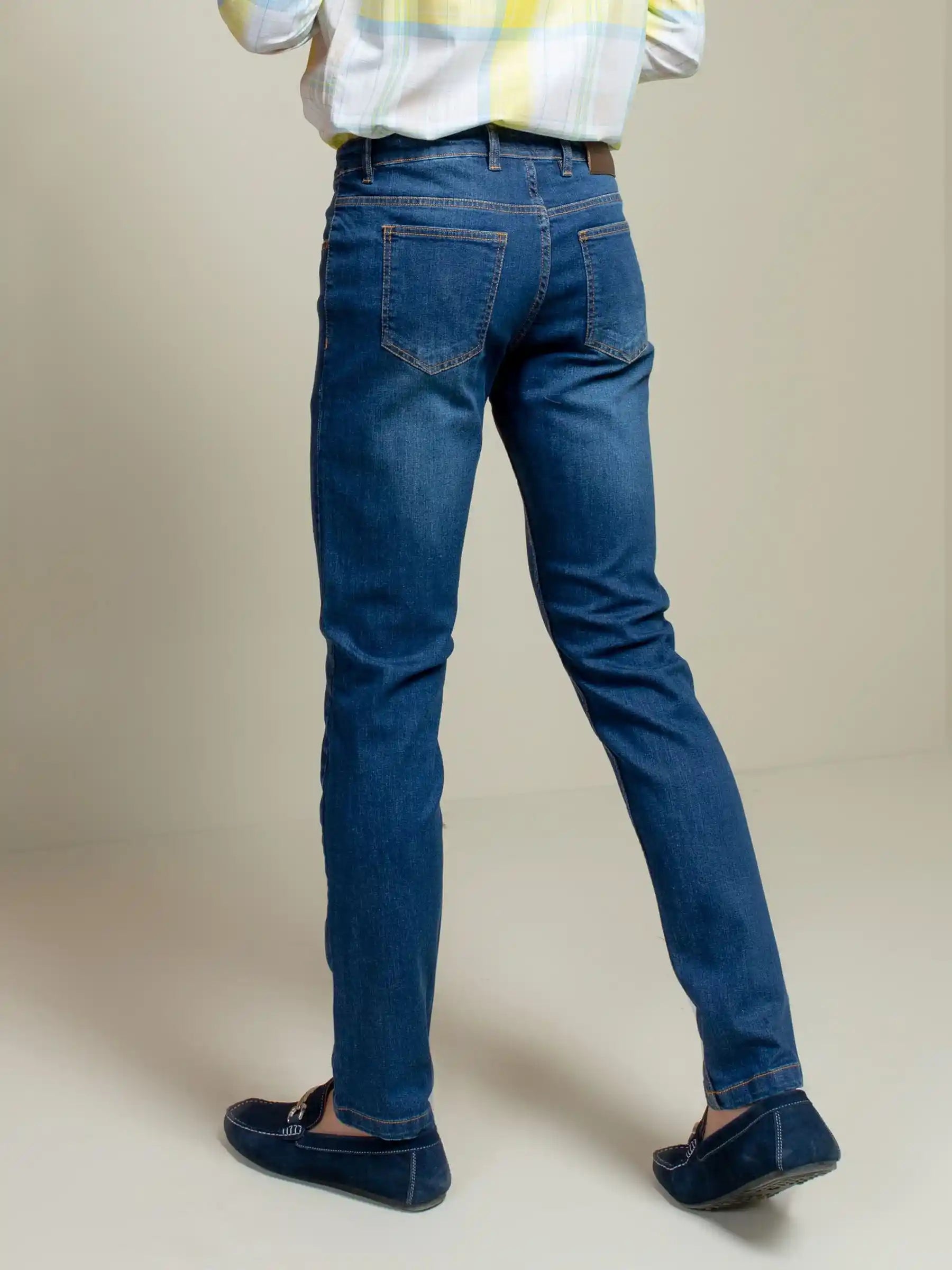 This blue denim jeans is super comfortable to wear. It's lightly washed for perfect indigo colour that will match any outfit finished with orange detailing & genuine pebble leather patch with embossed branding at the back