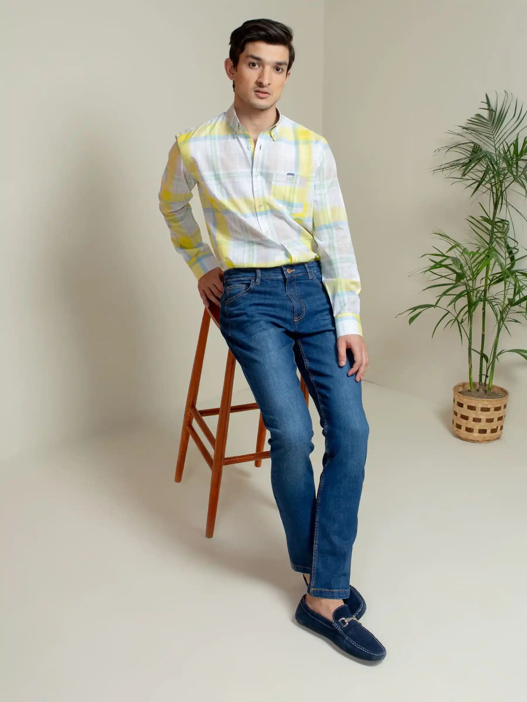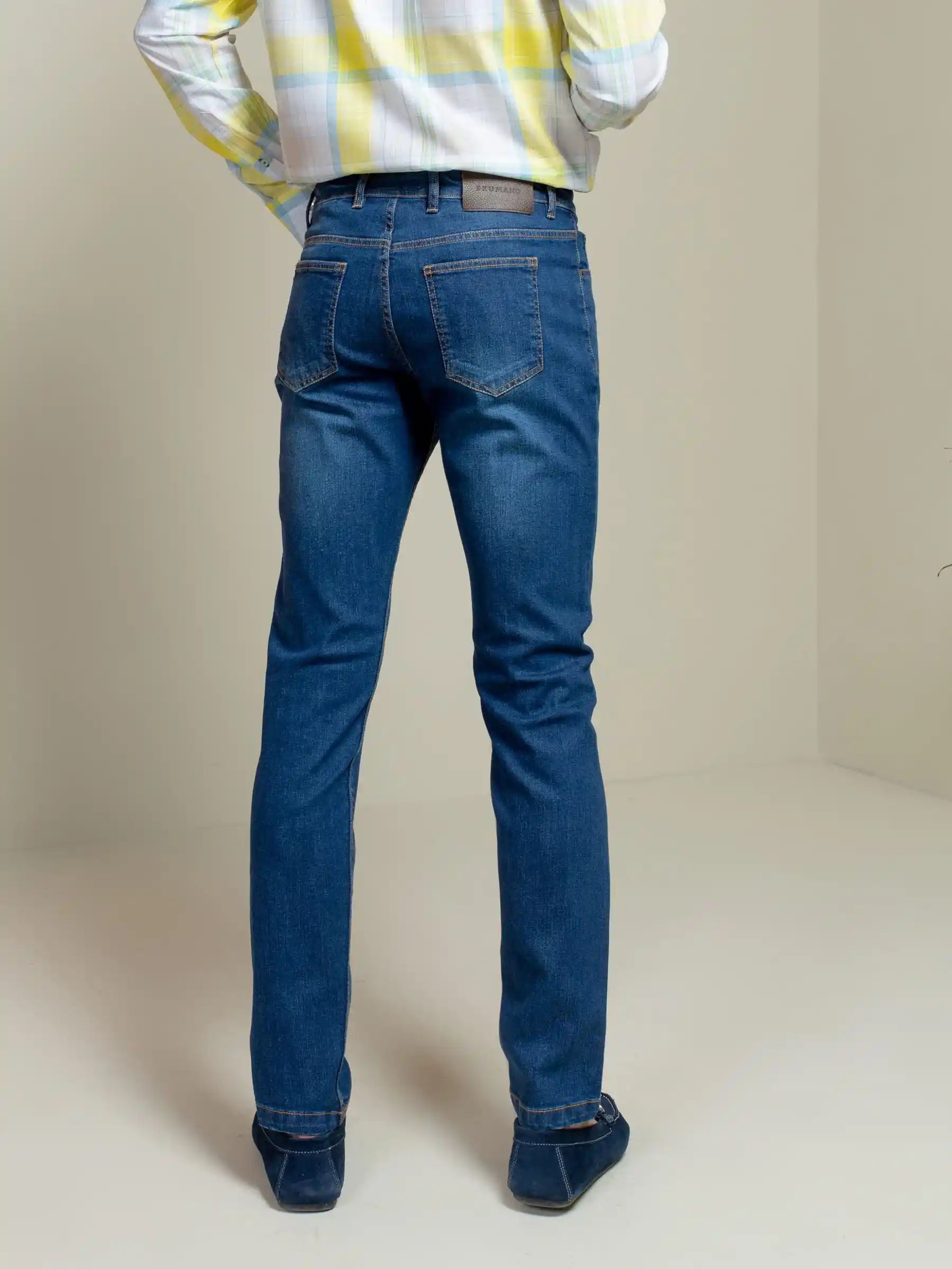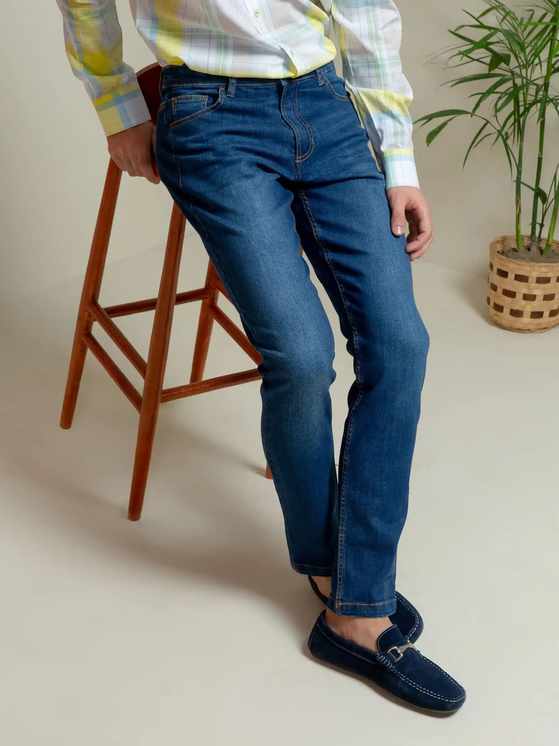 This blue denim jeans is super comfortable to wear. It's lightly washed for perfect indigo colour that will match any outfit finished with orange detailing & genuine pebble leather patch with embossed branding at the back