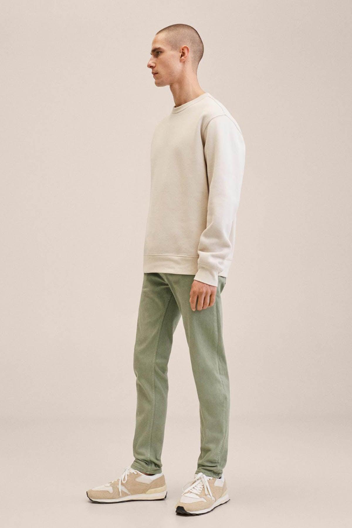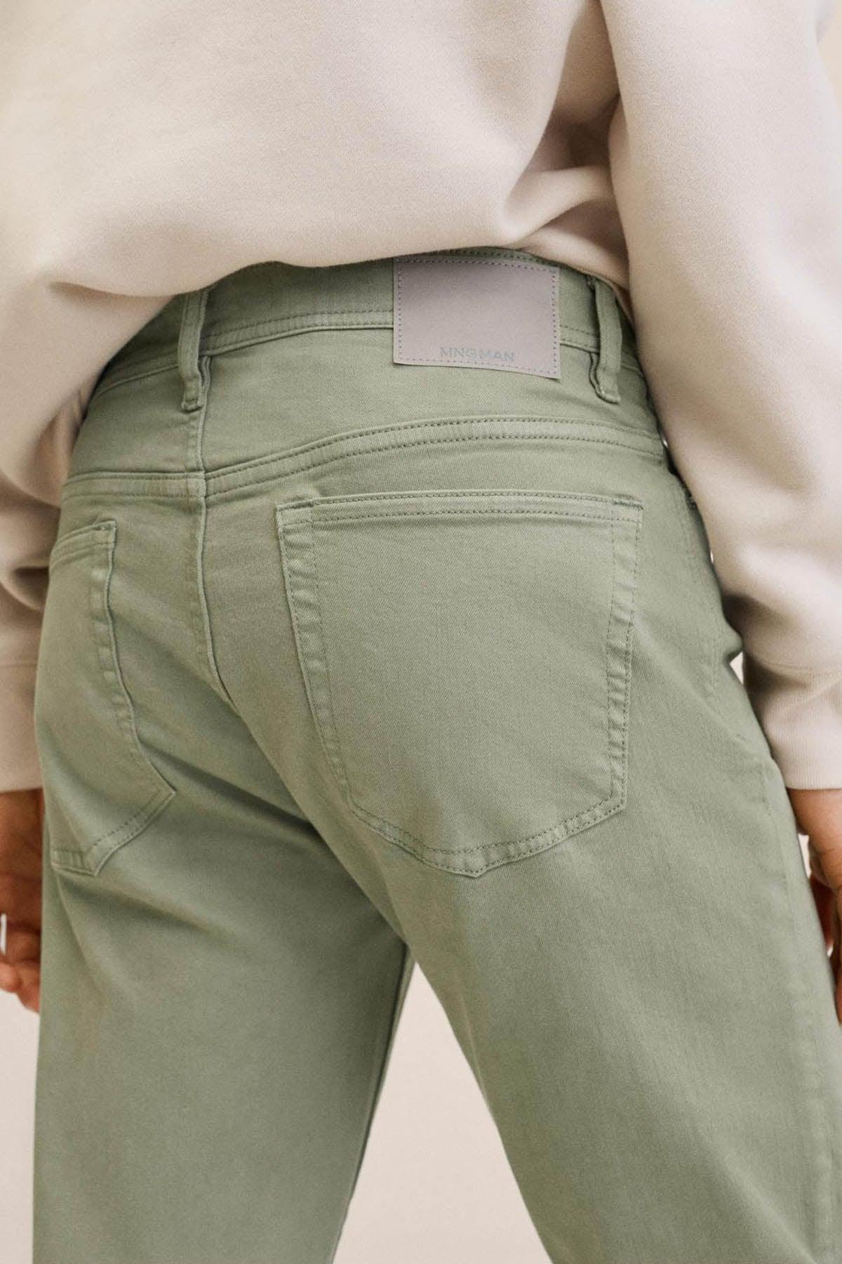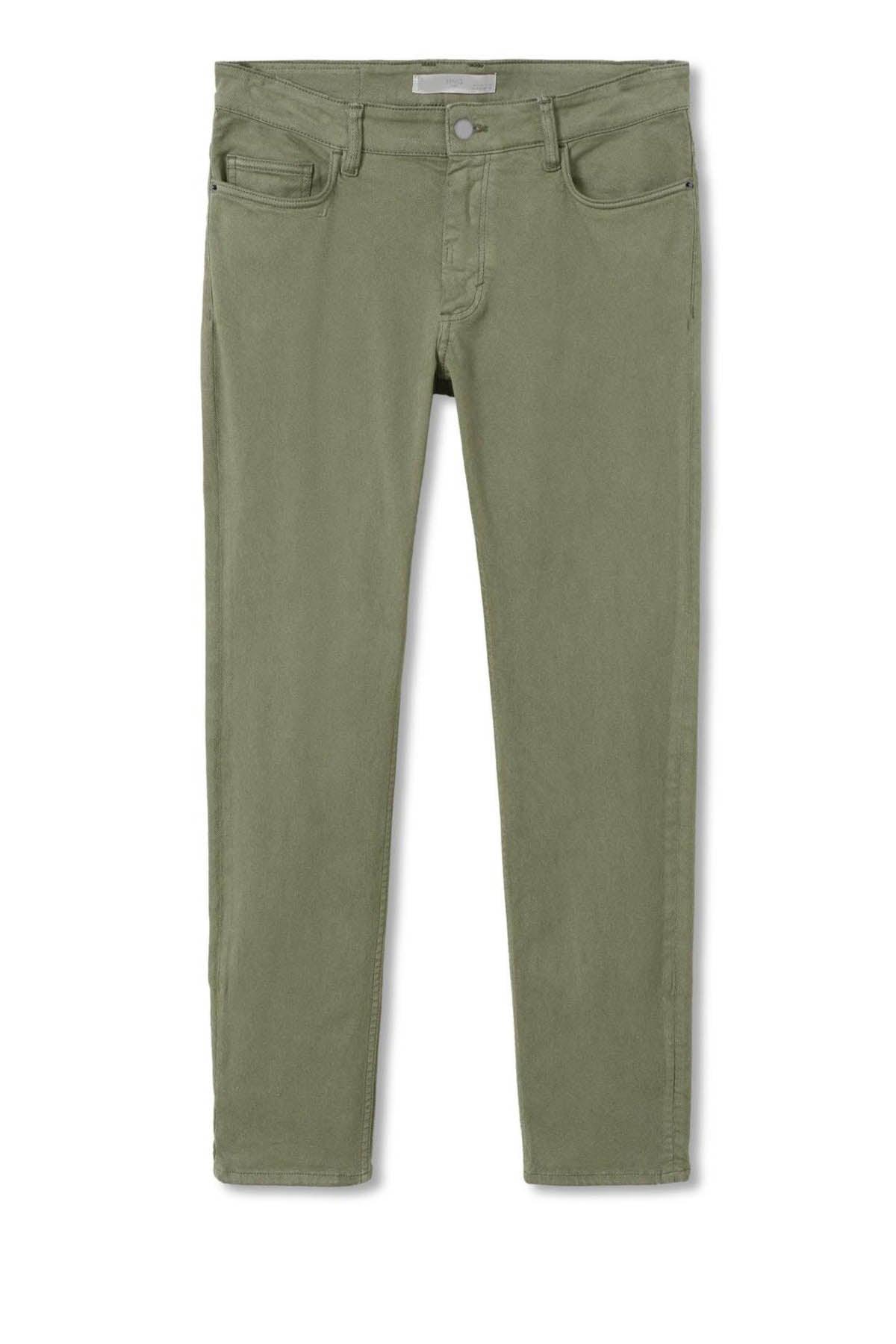 Slim fit. Denim design. Sustainable cotton blend fabric. Loops. Two side pockets. Coin pocket. Two patch pockets on the back. Zip and one button fastening. The model is 183cm and wears a size 42.