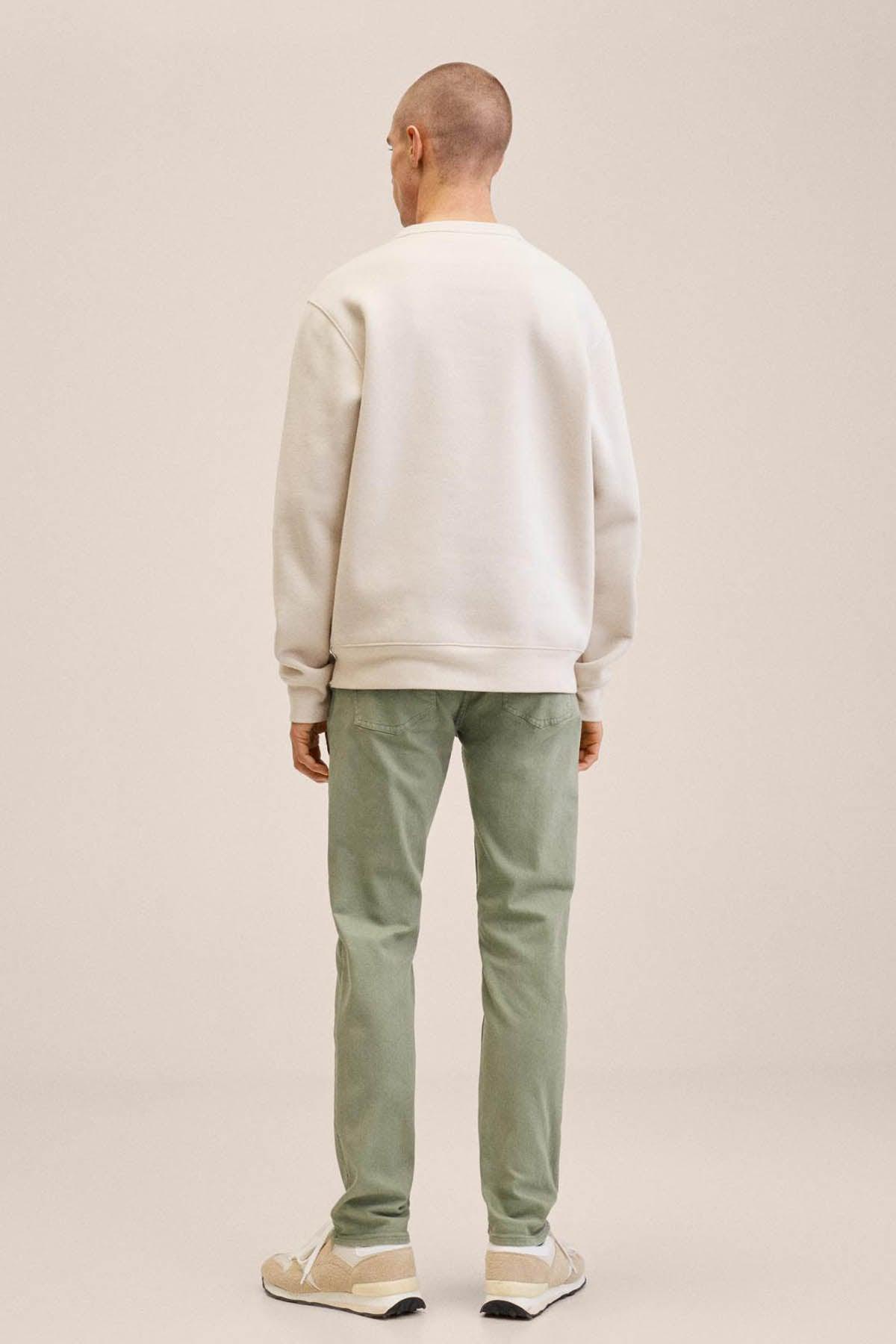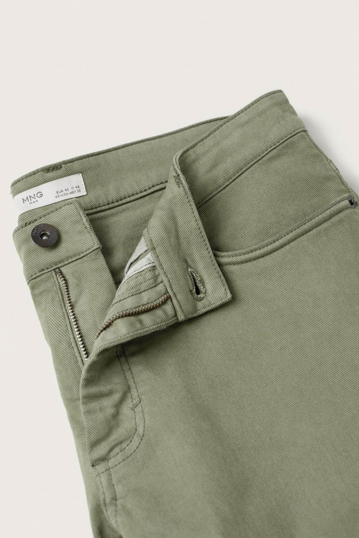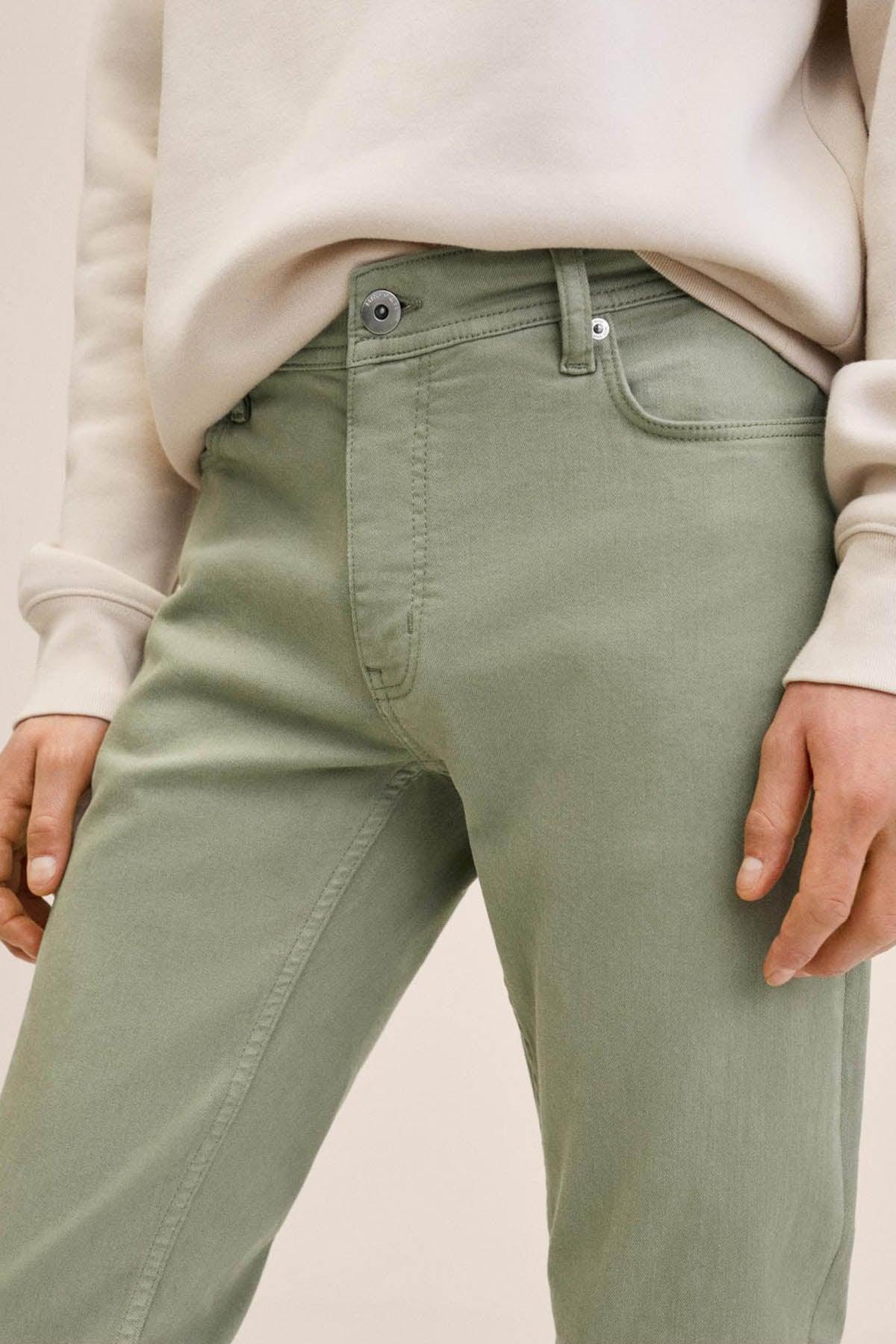 Slim fit. Denim design. Sustainable cotton blend fabric. Loops. Two side pockets. Coin pocket. Two patch pockets on the back. Zip and one button fastening. The model is 183cm and wears a size 42.