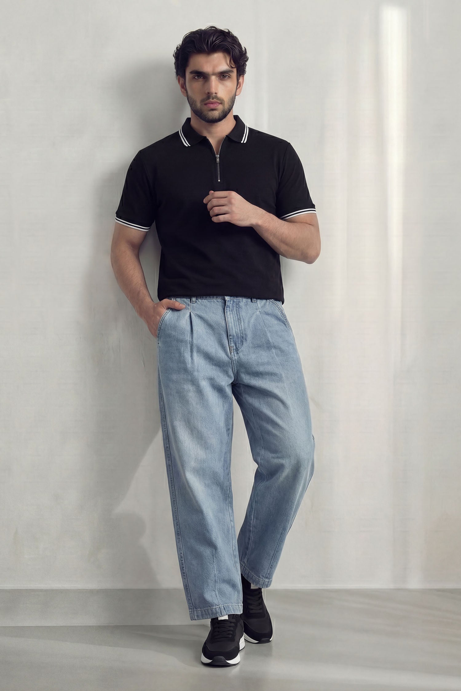 A straight-fit denim featuring soft front pleats and a clean light-wash finish. Designed for a relaxed yet refined streetwear look, offering comfort, structure, and everyday versatility