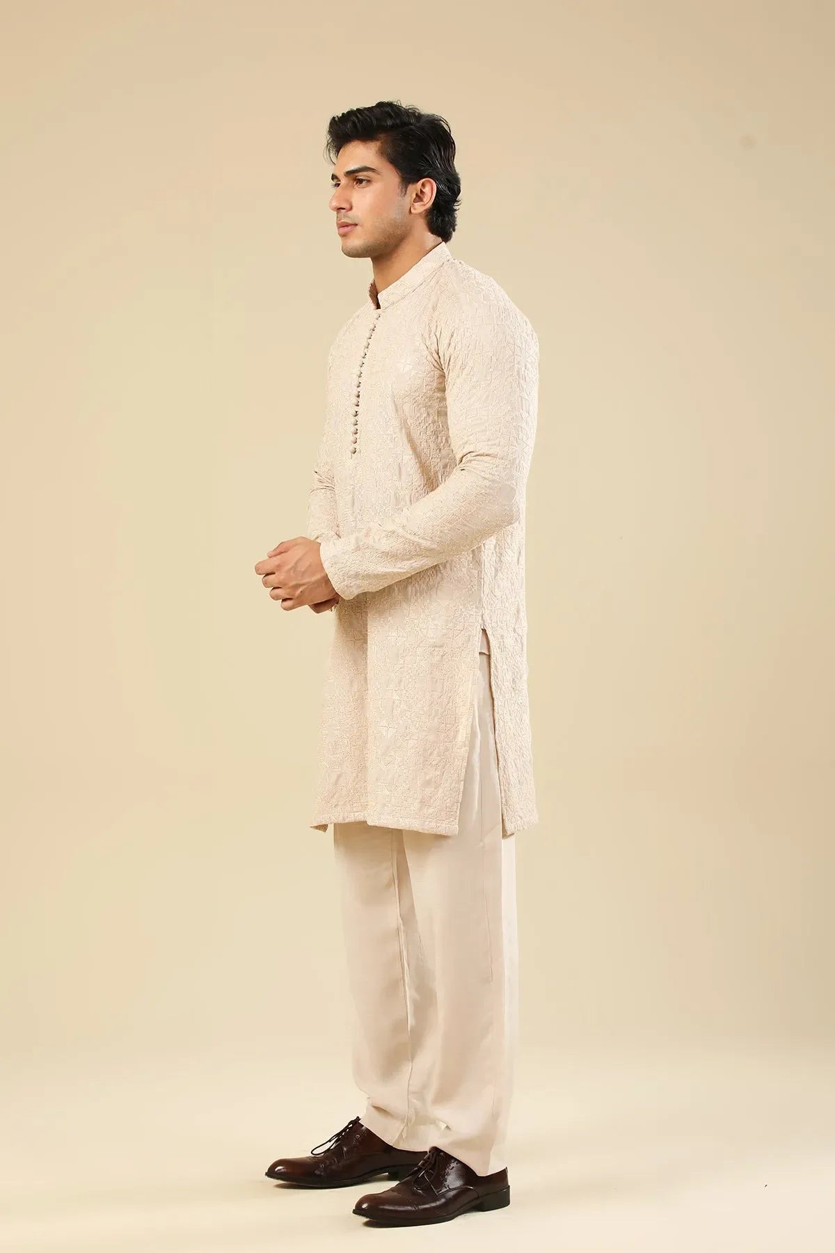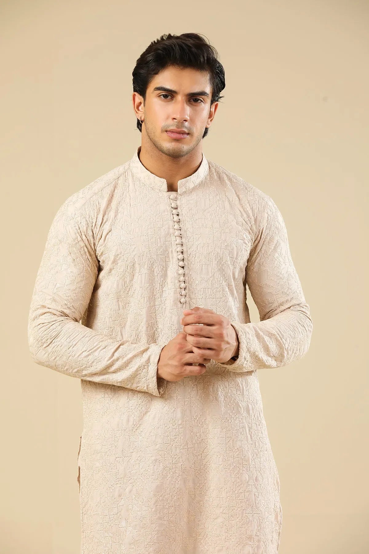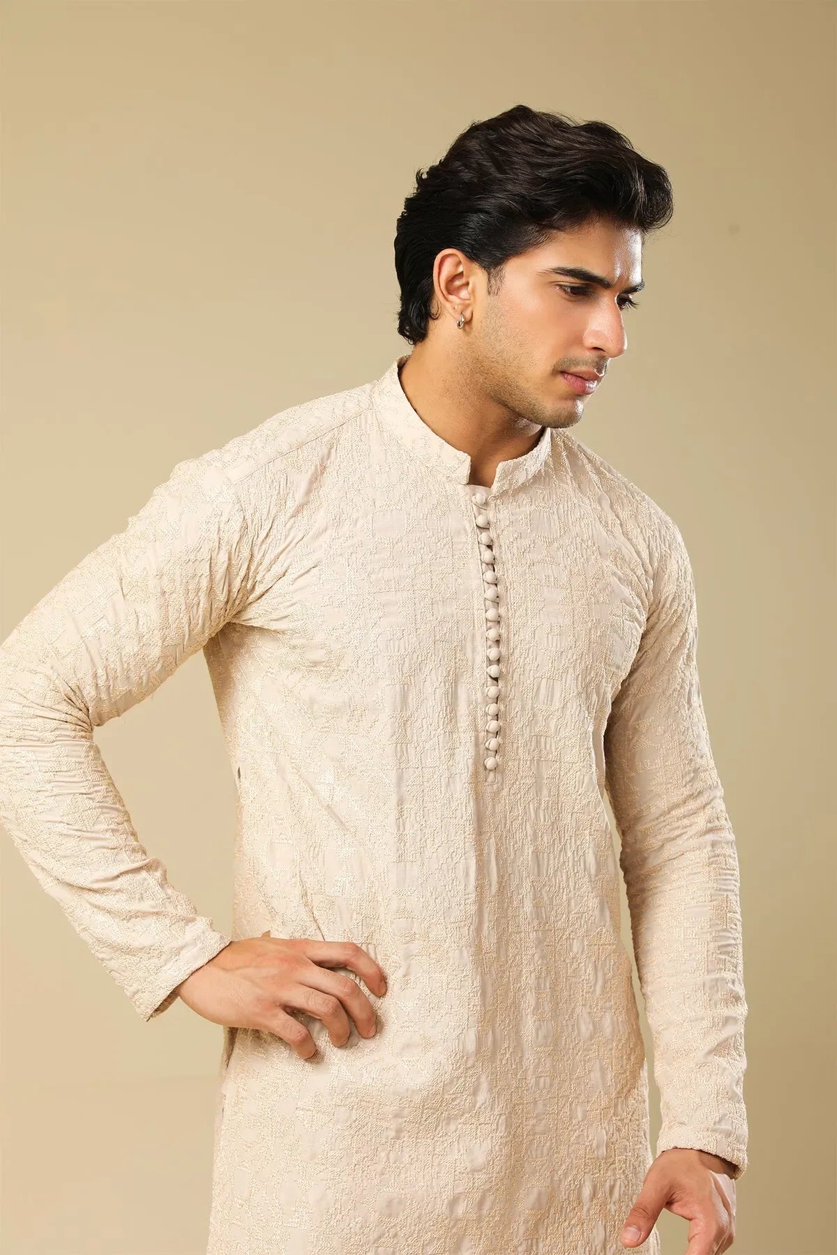 Tabir - Beige Raw Silk Embroidered Kurta Trouser - Men