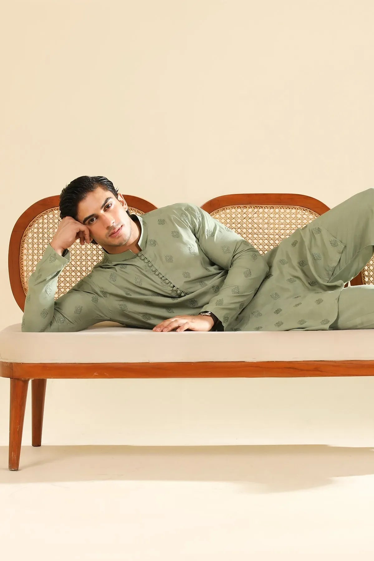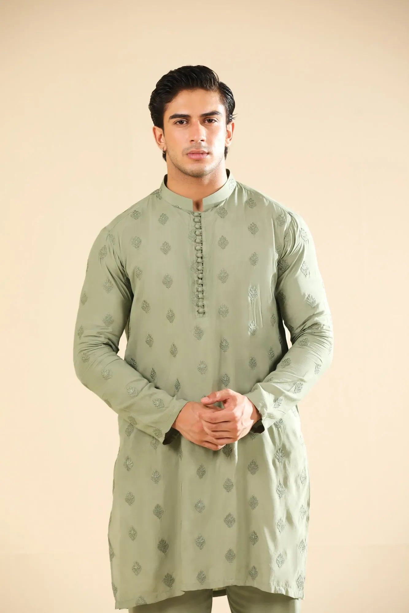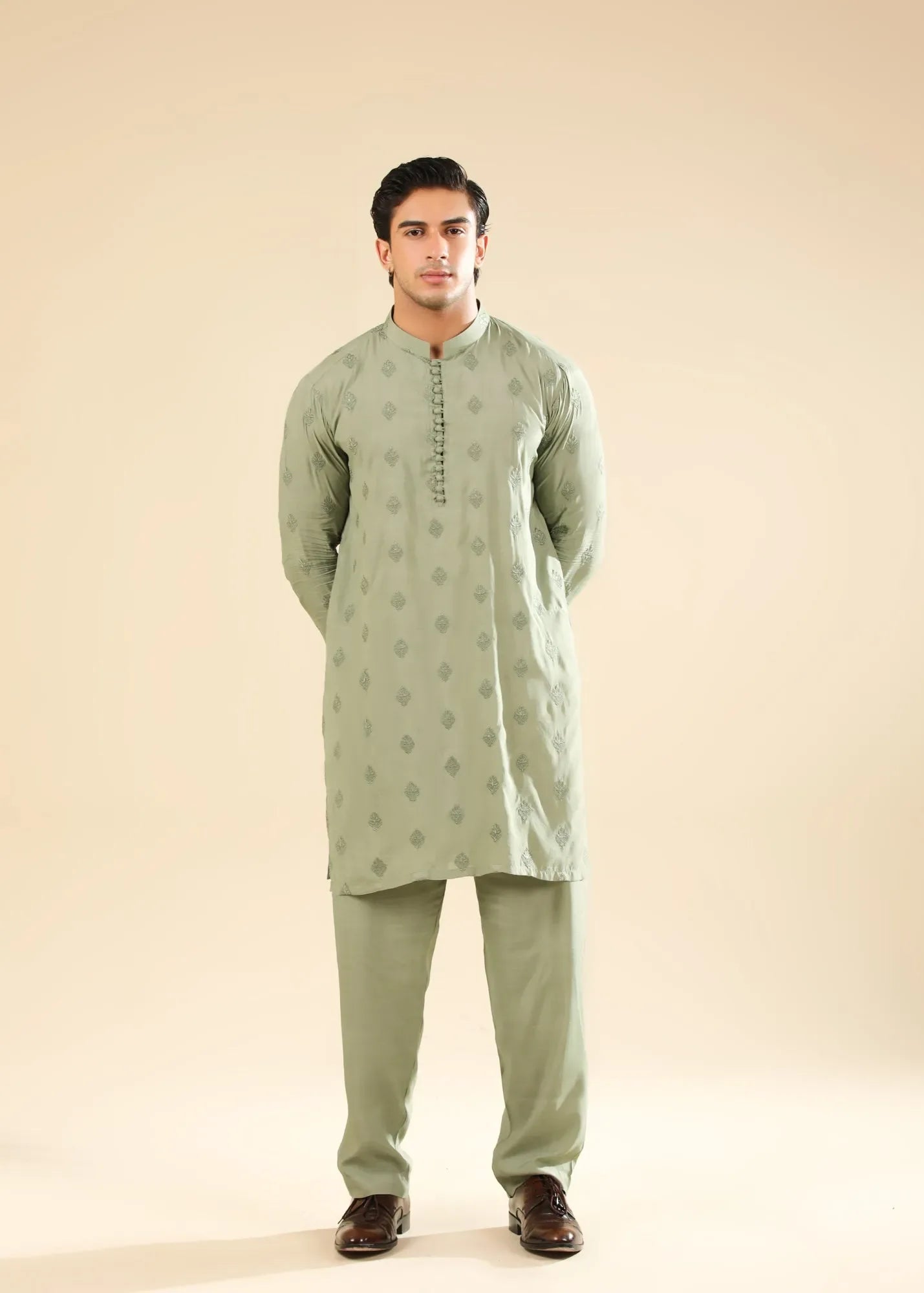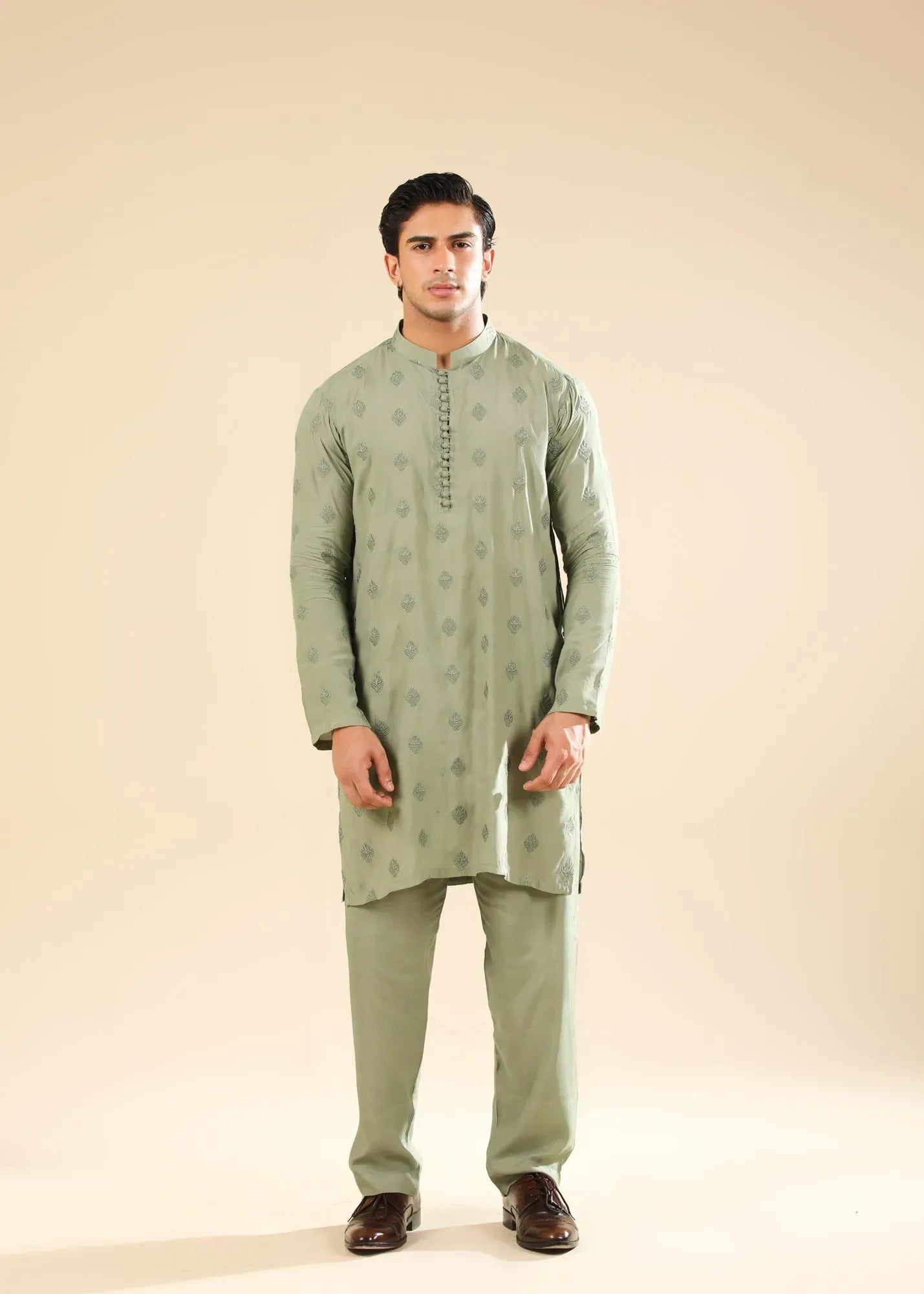 Bahaar - Mint Raw Silk Embroidered Kurta Trouser - Men