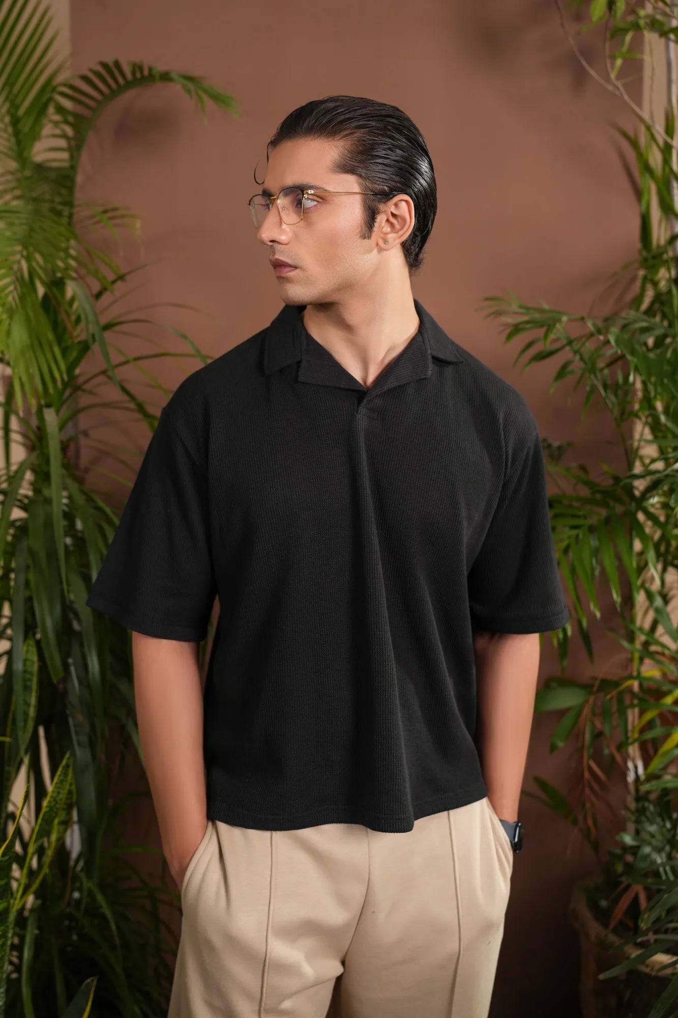Waffle Knit Polo Featuring A Boxy Fit And Revere Collar. Sleek Black Tone Adds A Modern, Minimal Aesthetic With Comfort Ideal For Winter Styling.