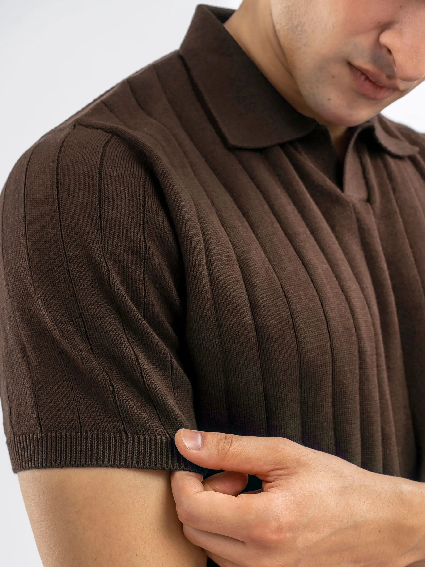 Elevate your everyday style with our dark brown flat knit polo. Crafted from fine 100% cotton yarn, this polo features a subtle drop needle texture that adds depth and sophistication. The flat knit collar and tailored fit offer a clean, modern look. Perfect for both casual and smart settings.