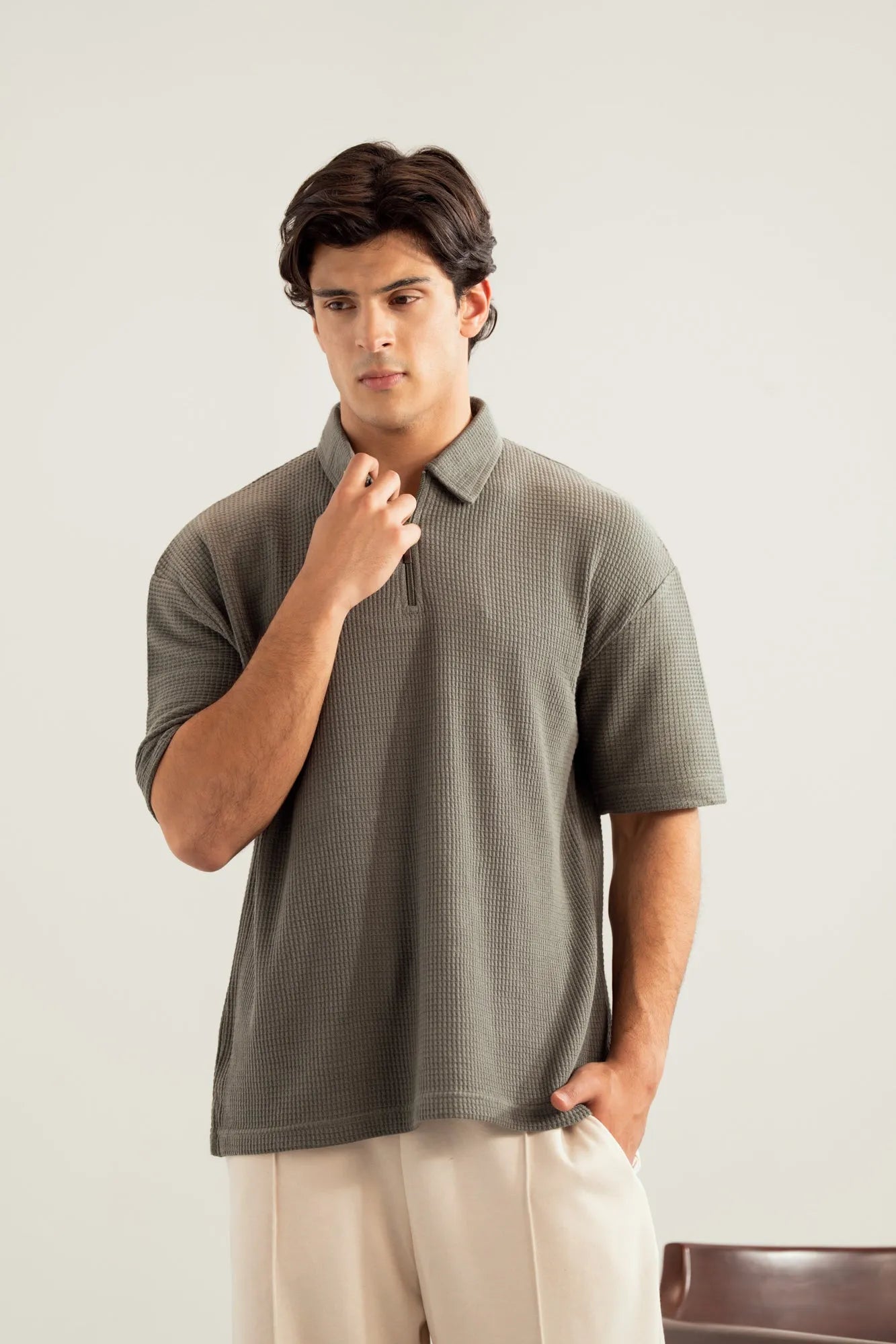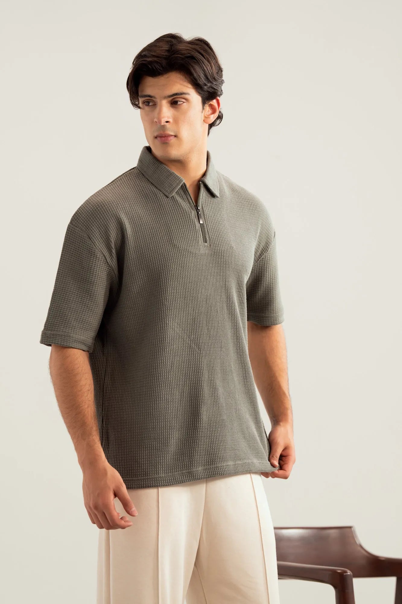 Olive Waffle Zipper Polo - Boxy Fit - Men
