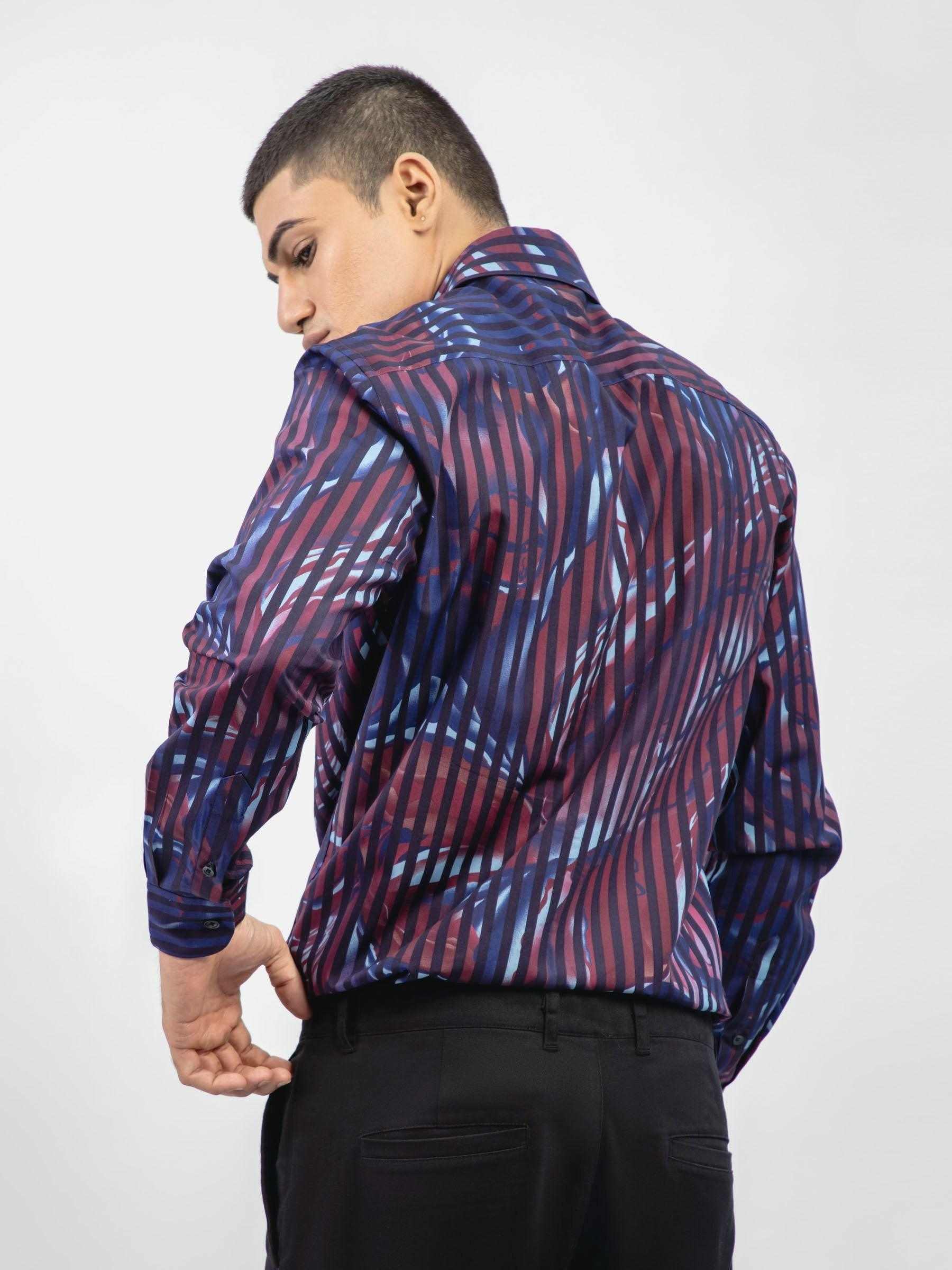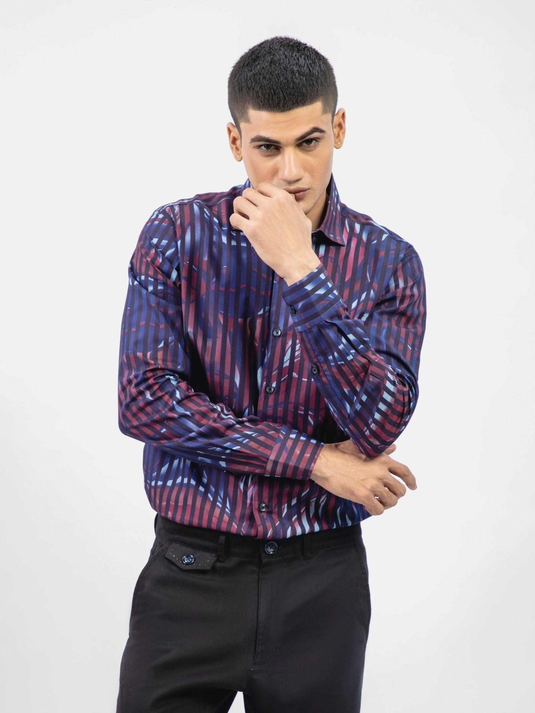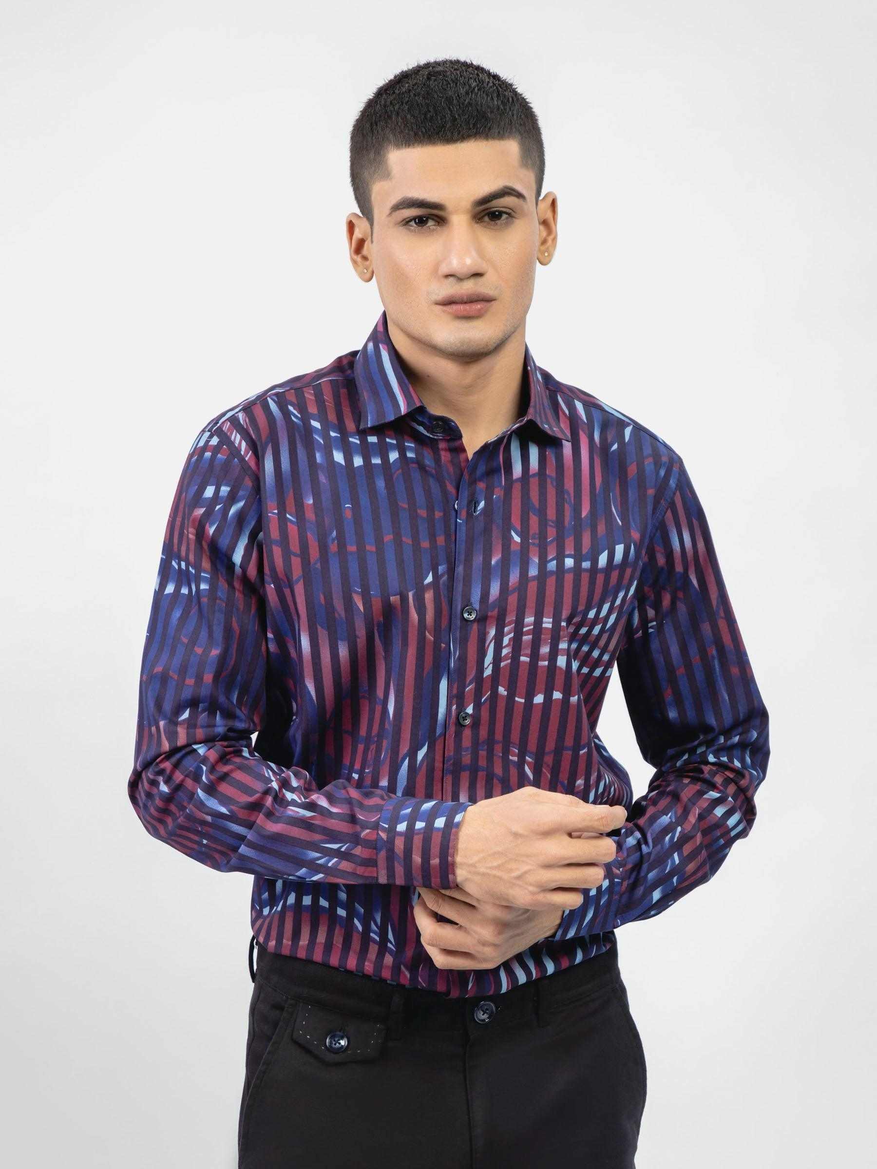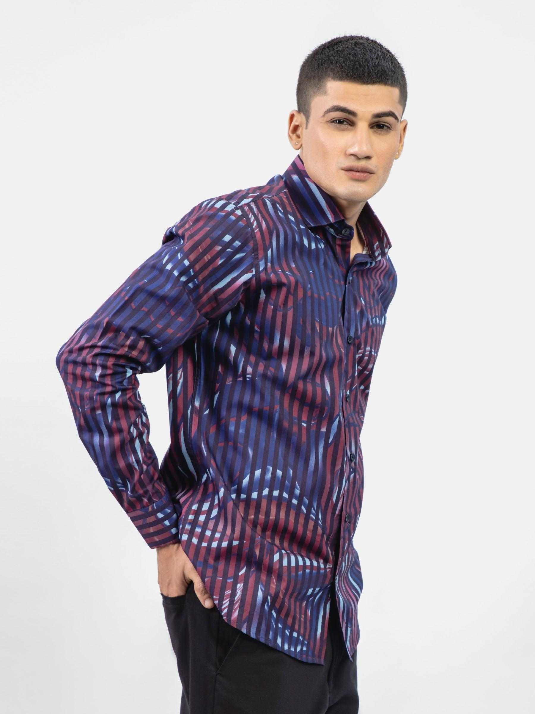 Fusion of style and sophistication, our black & burgundy floral printed shirt is a must-have this season. With its black striped base and unique burgundy and blue floral printed pattern, is ideal for making a bold statement. Finished with shallow collar, long sleeves & branded buttons