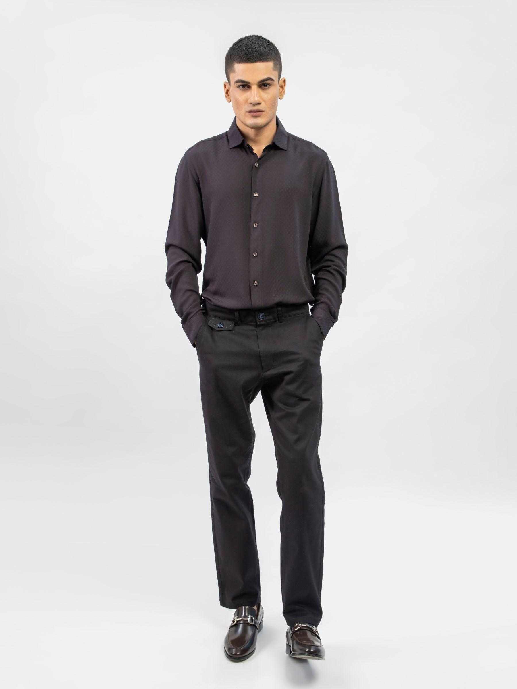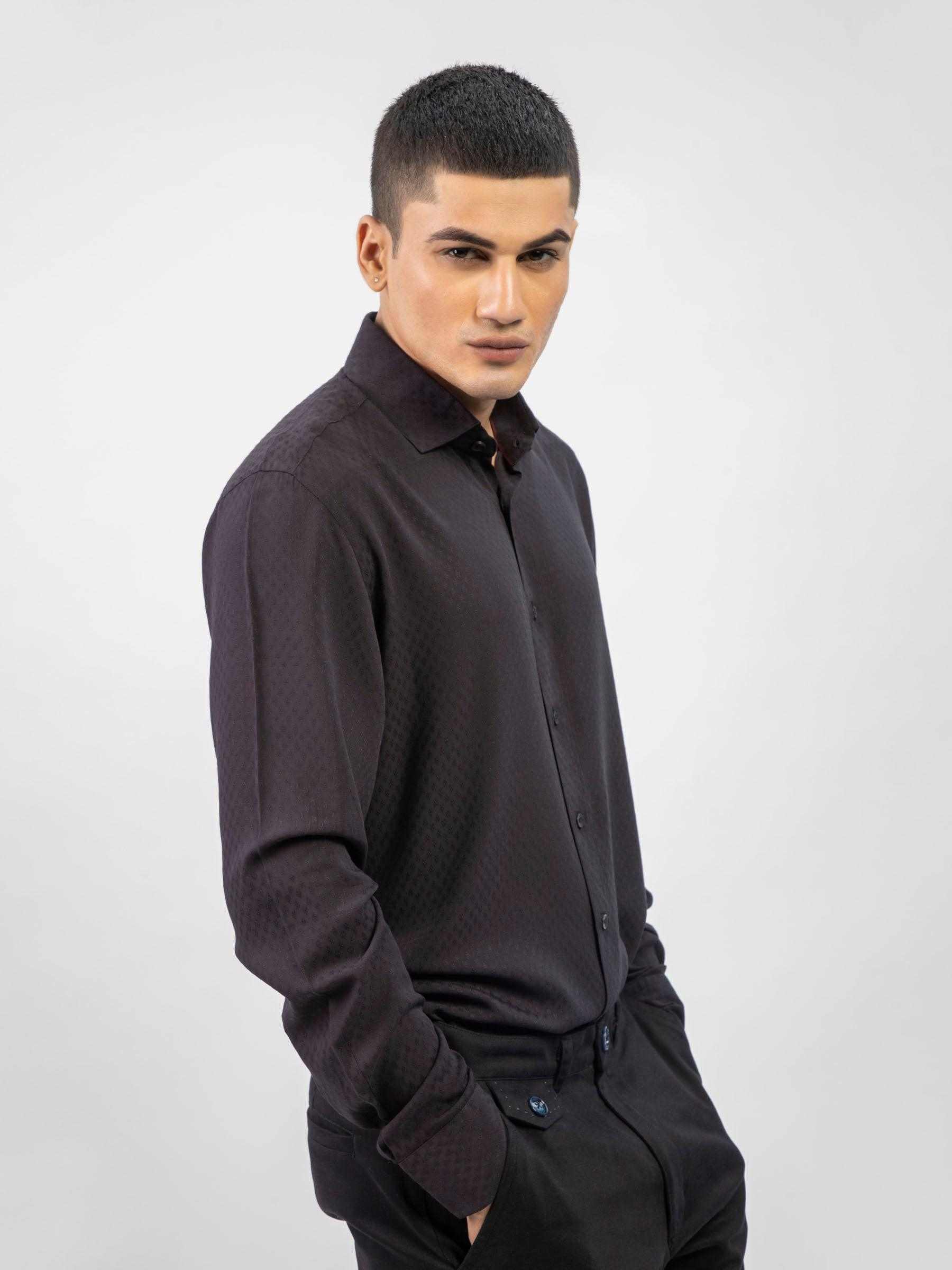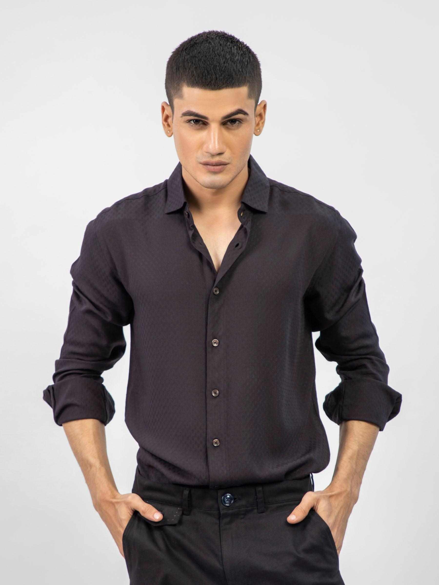 Perfect for summer evenings, our men's black dobby shirt offers a sophisticated touch with its striking pattern, making it an ideal choice for both casual and semi-formal events. Featuring shallow collar & inner collar ribbon detailing