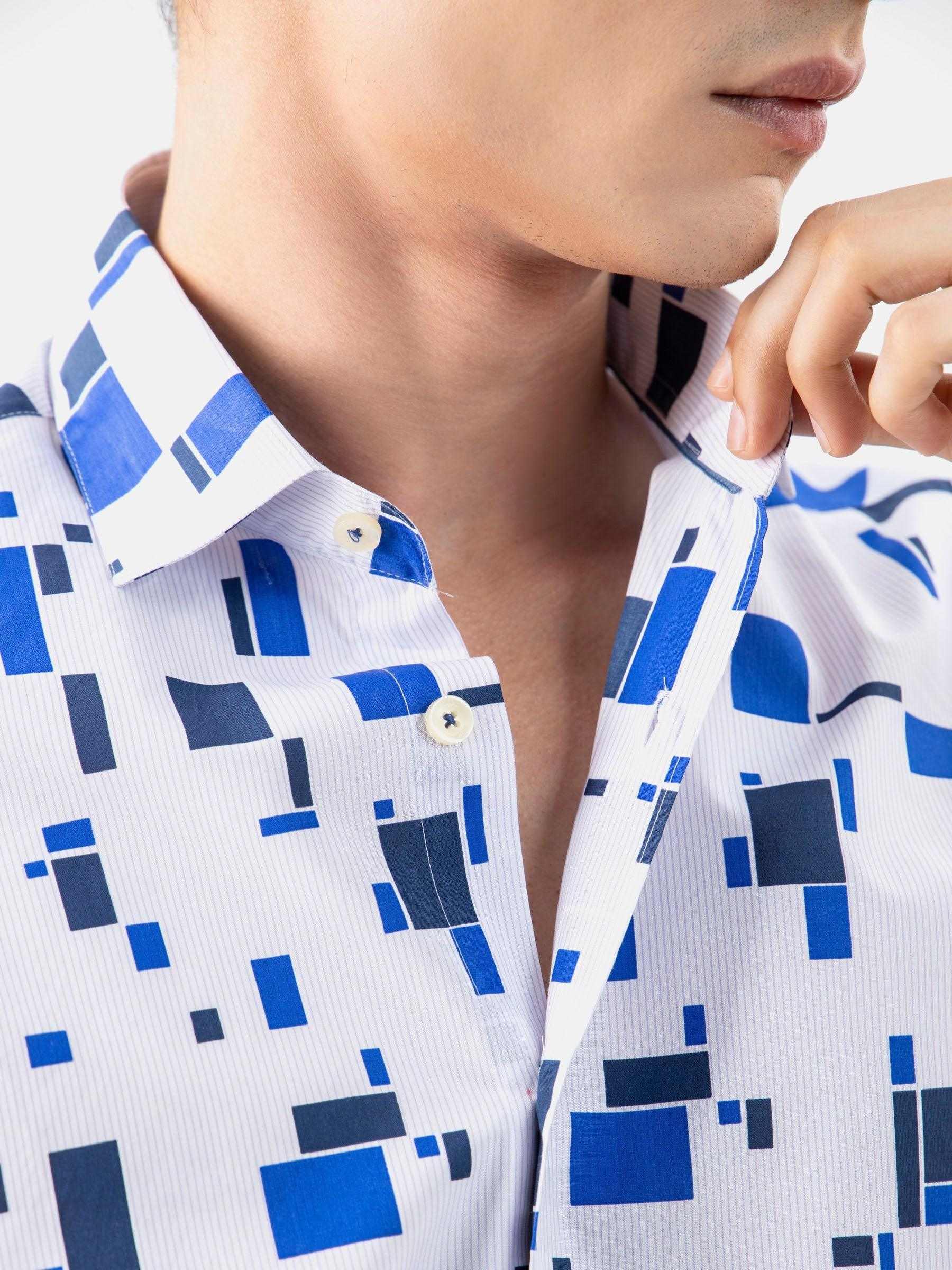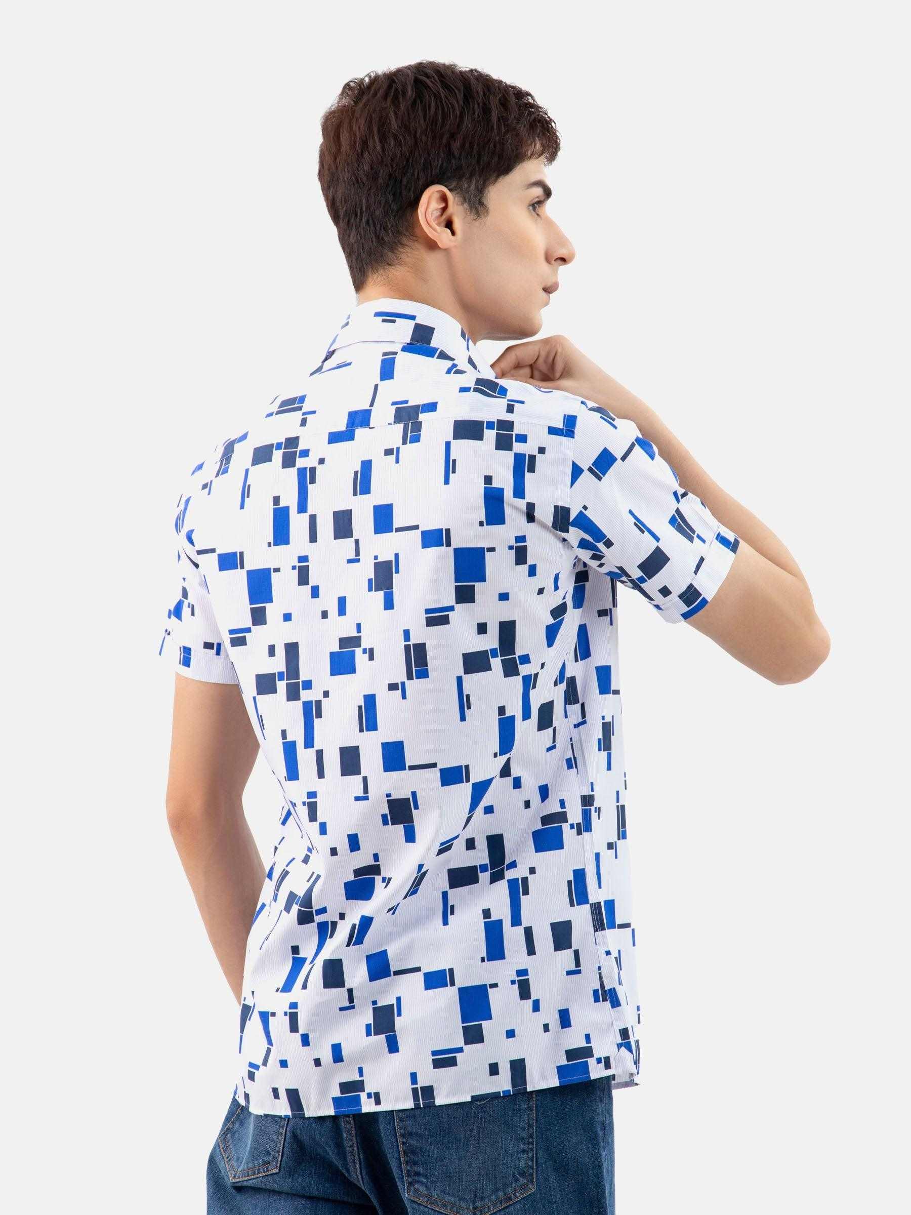 Experience the perfect blend of comfort and style with this men's half sleeve blue shirt, featuring a unique blue printed pattern and classic purple stripes, complete with a straight bottom hem.