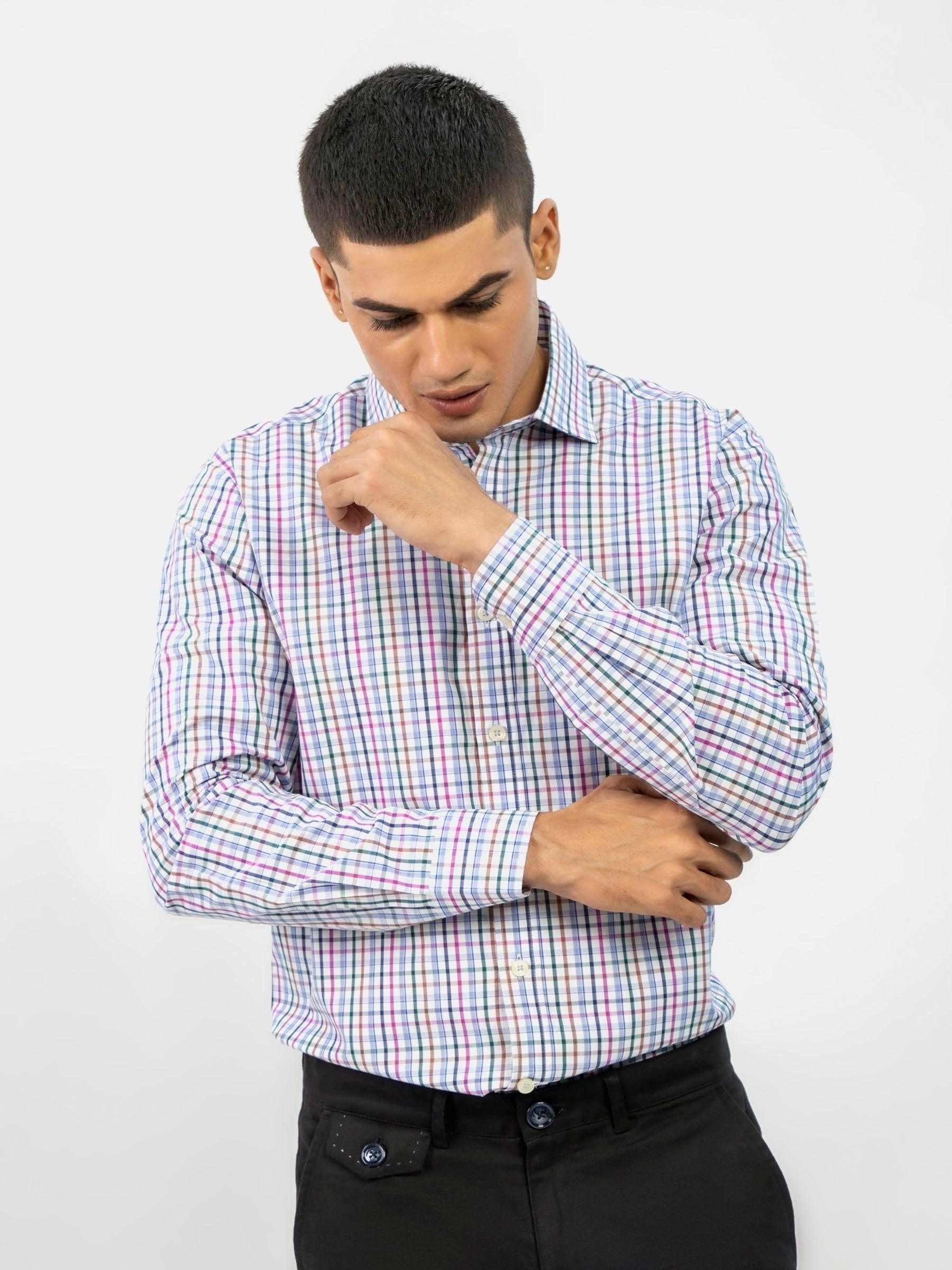 Elevate your office look with our blue multi checkered formal shirt, a vibrant addition to your wardrobe. Featuring classic collar with ribbon detailing, its made with 100% fine cotton fabric. Ideal for wearing it with khaki chinos