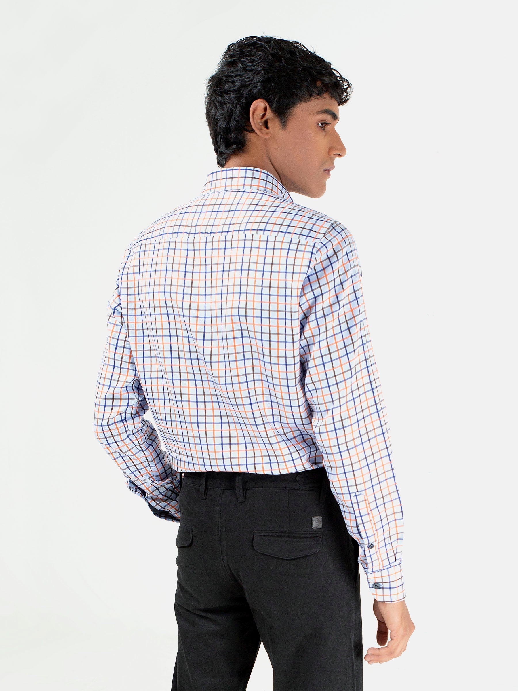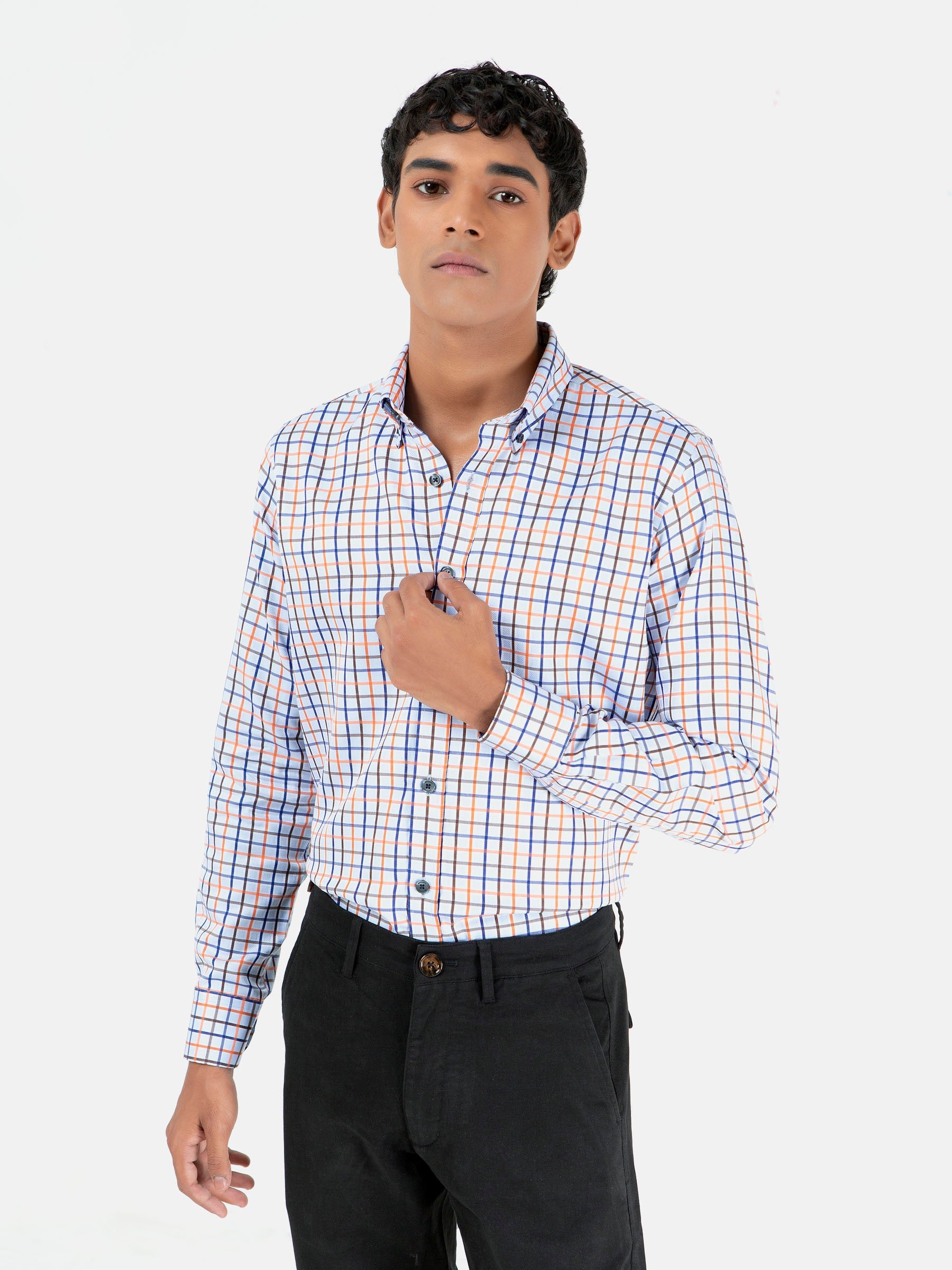 Sometimes, all it takes is a little bit of class and style to make an outfit complete. This blue & orange checkered shirt is a great addition to any office wardrobe. Made from 100% cotton, this shirt features windowpane checks that add an air of sophistication to whatever you decide to wear with it. Finished with button down collar