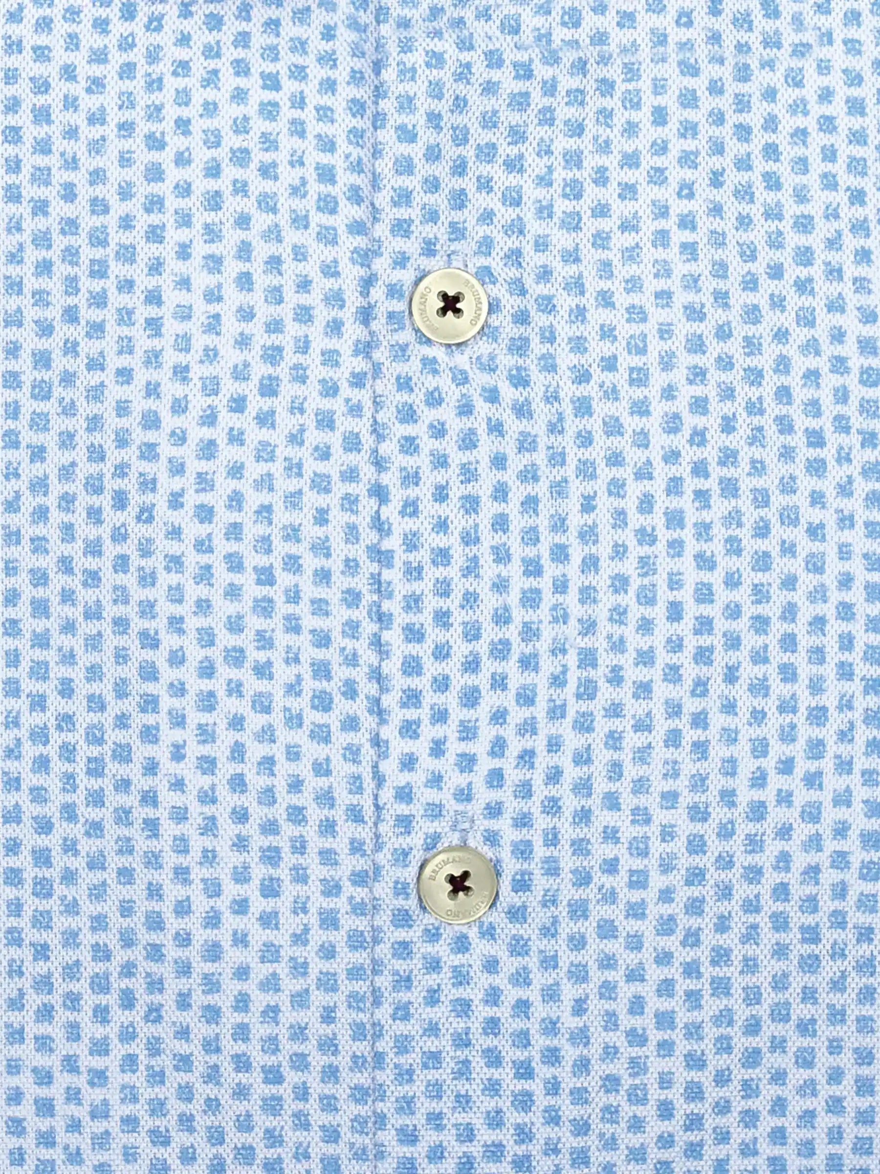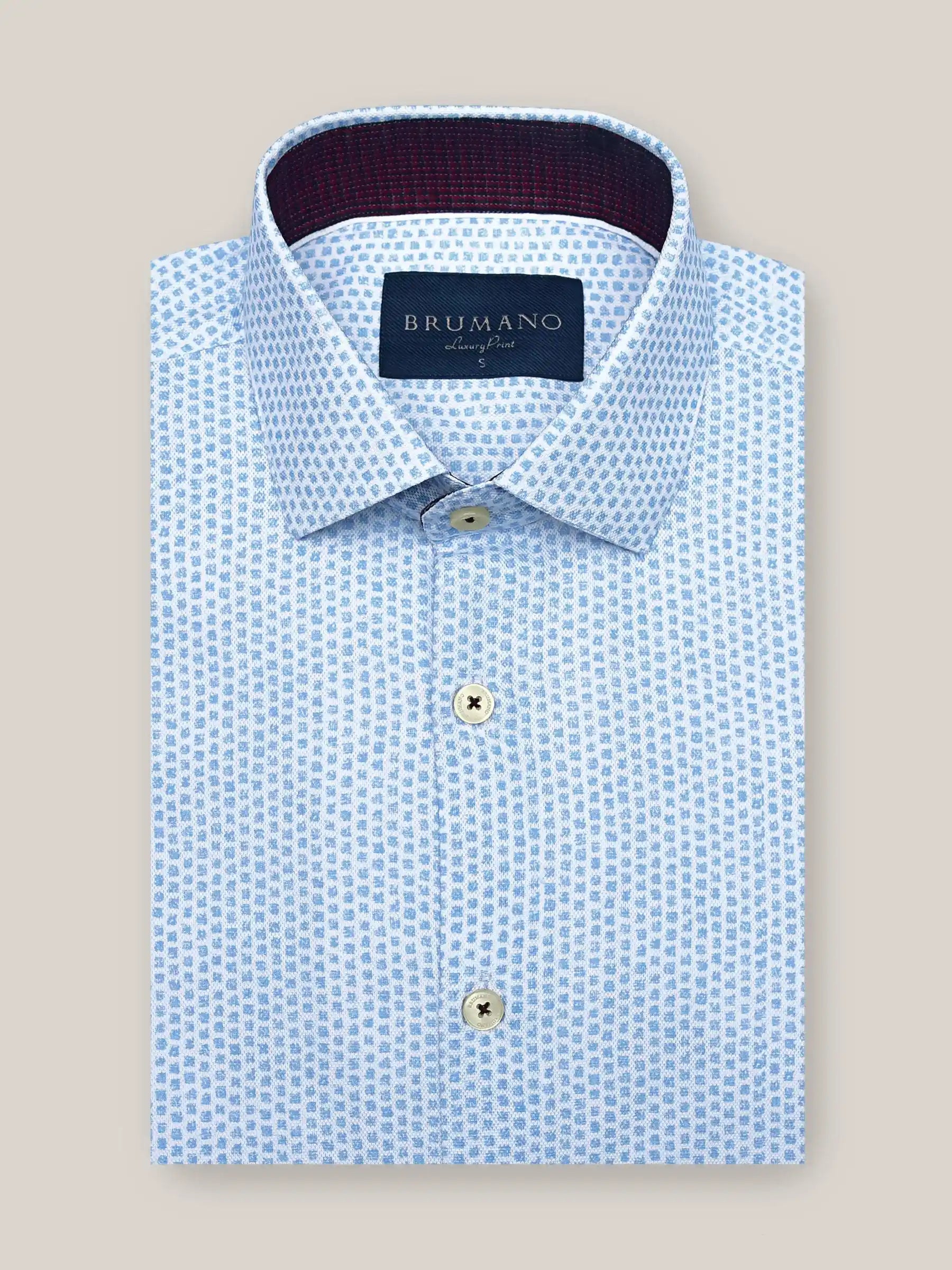 Blue geometric printed shirt on structured fabric is a summer essential and a go-to for any party or event! This piece is easy to dress up or down and will look great on everyone. Finished with collar detailing for that smart look