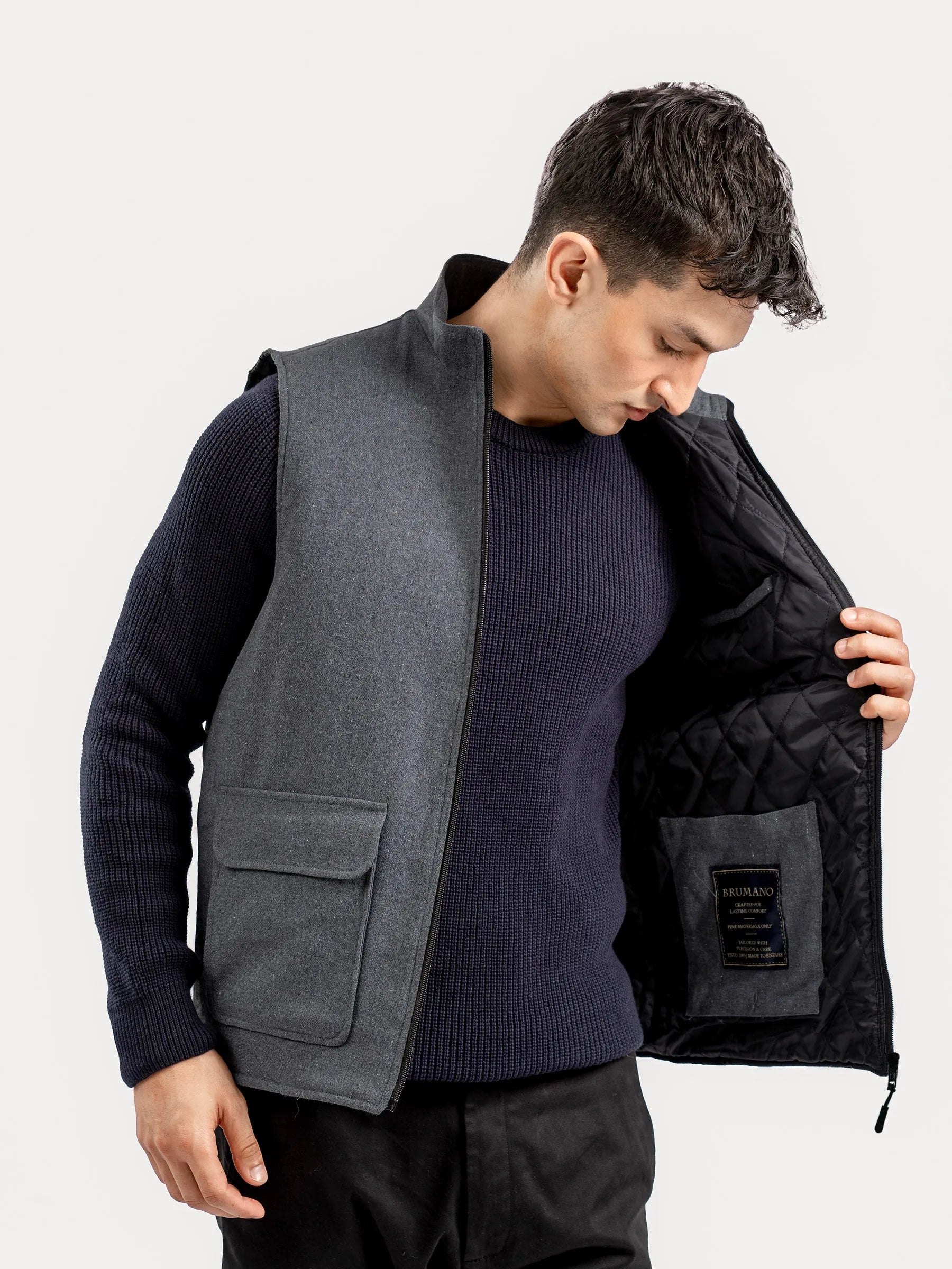 Upgrade your winter look with our dark grey quilted sleeveless jacket. Lightweight yet warm, it features a sleek inner quilted design with front zipper closure & brushed flannel fabric for warmth. Perfect for outdoor adventures or casual everyday wear.