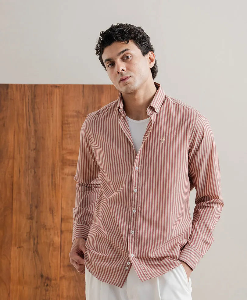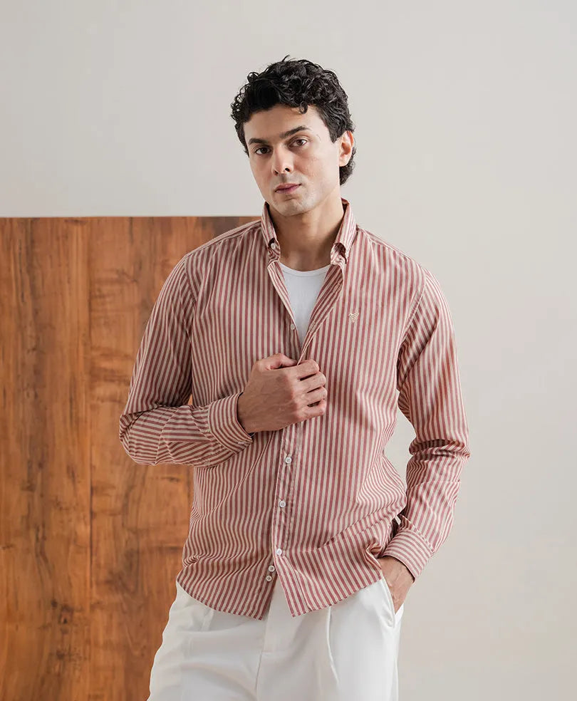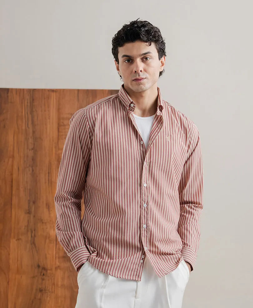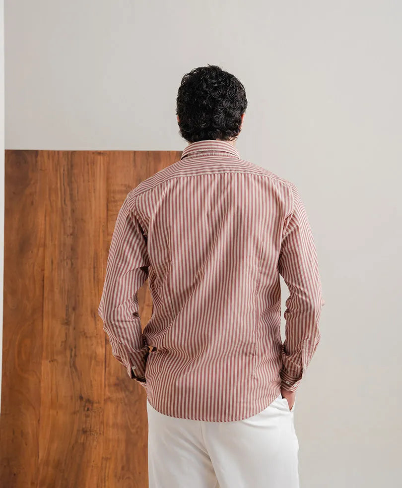A refined balance of warmth and elegance, this stripe button-down shirt in rust and ivory is crafted from premium cotton for a soft, breathable feel. Designed with a clean silhouette and timeless stripe pattern, it transitions effortlessly from office polish to relaxed weekend styling.