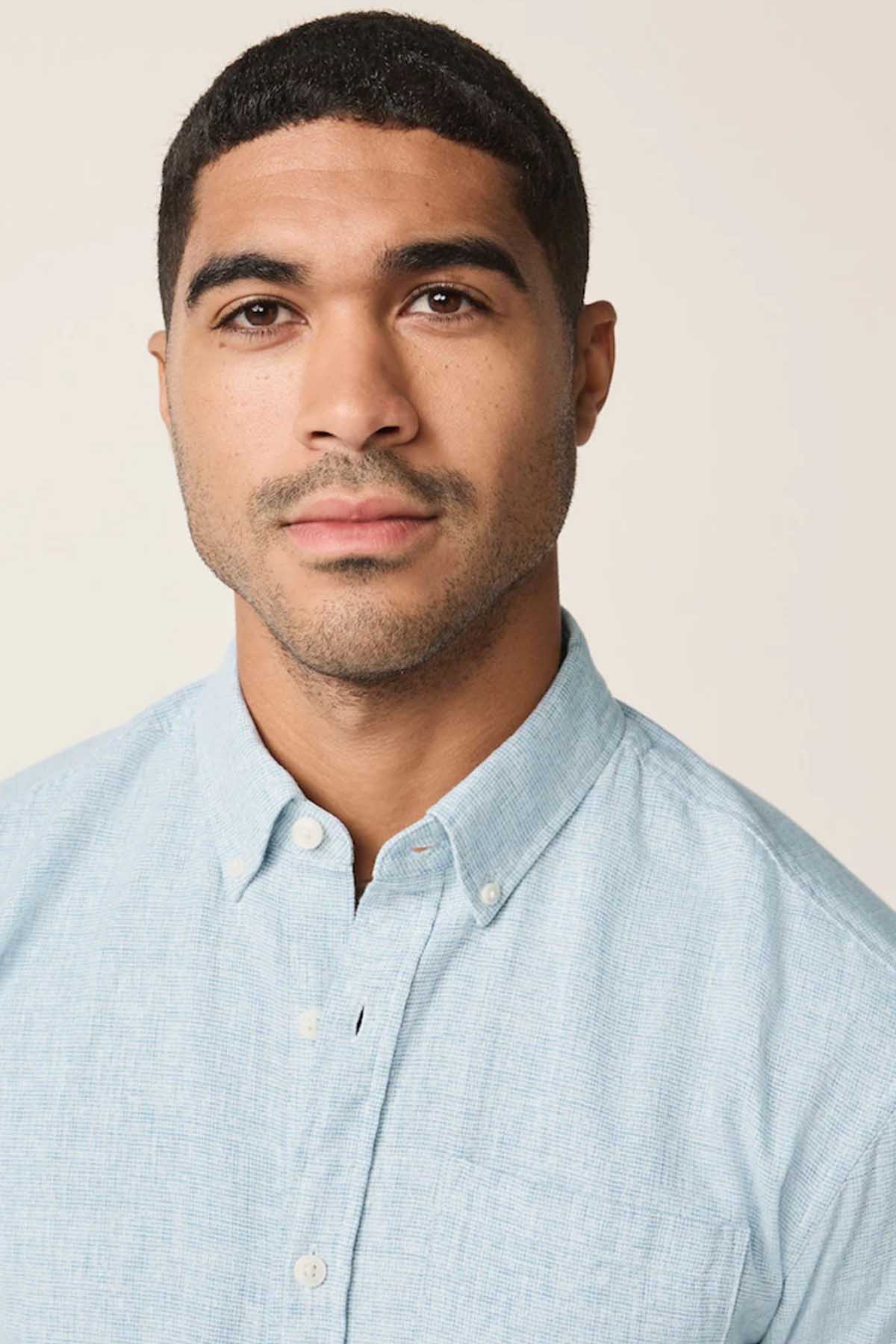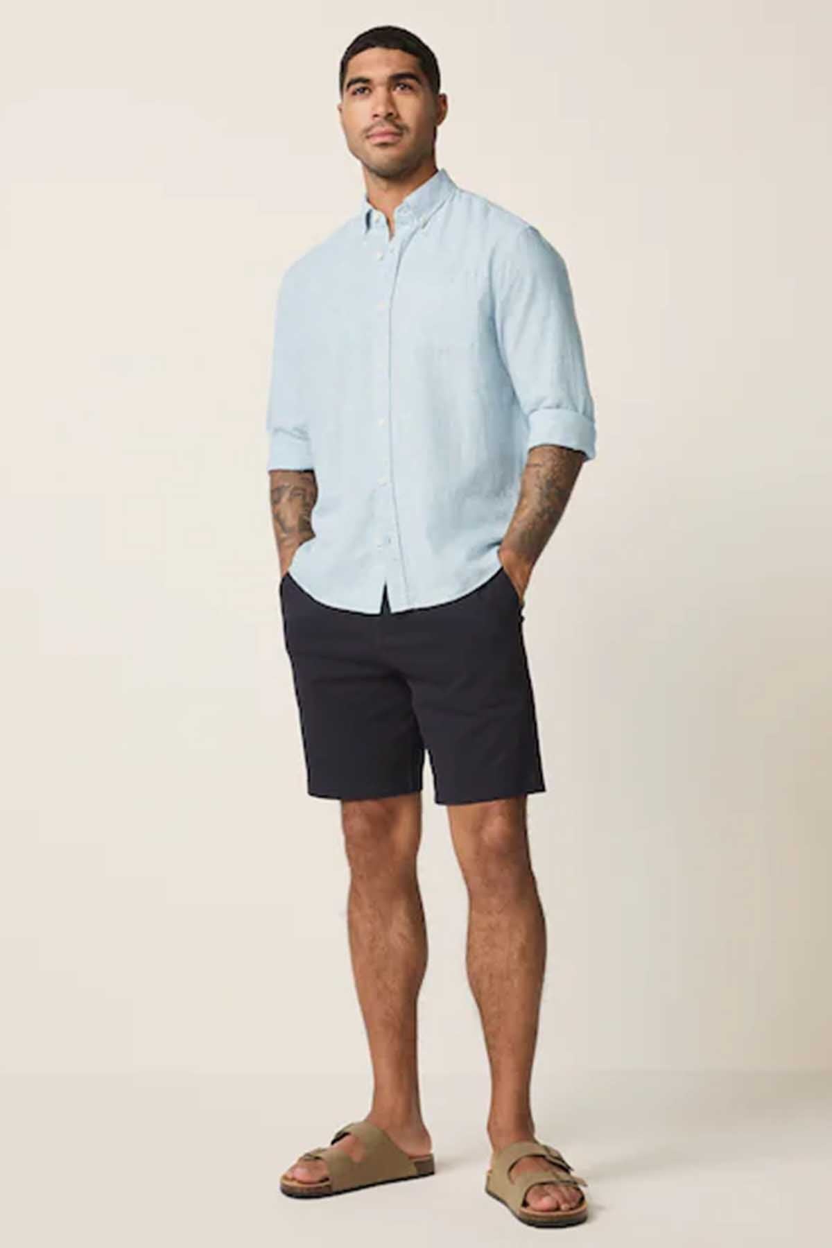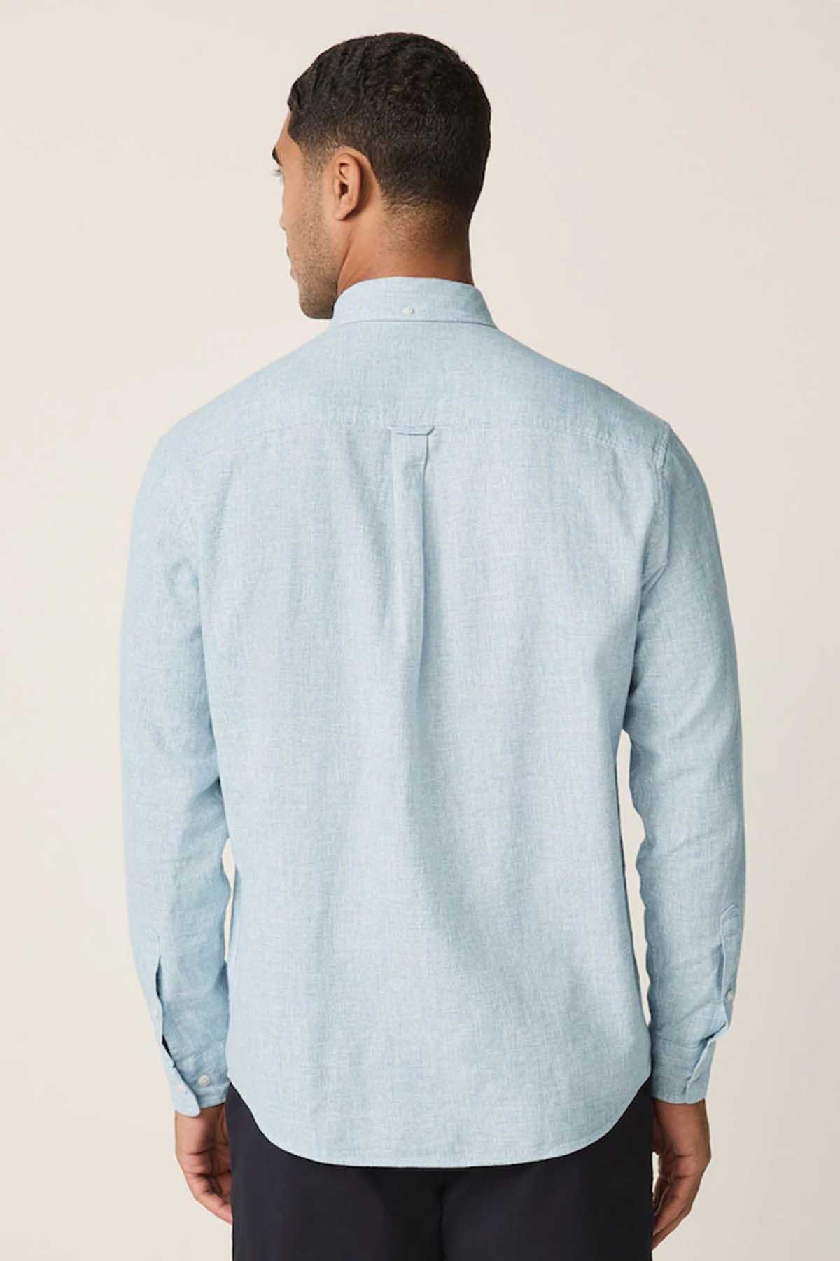 Light Blue Standard Collar Cotton Linen Blend Long Sleeve Shirt