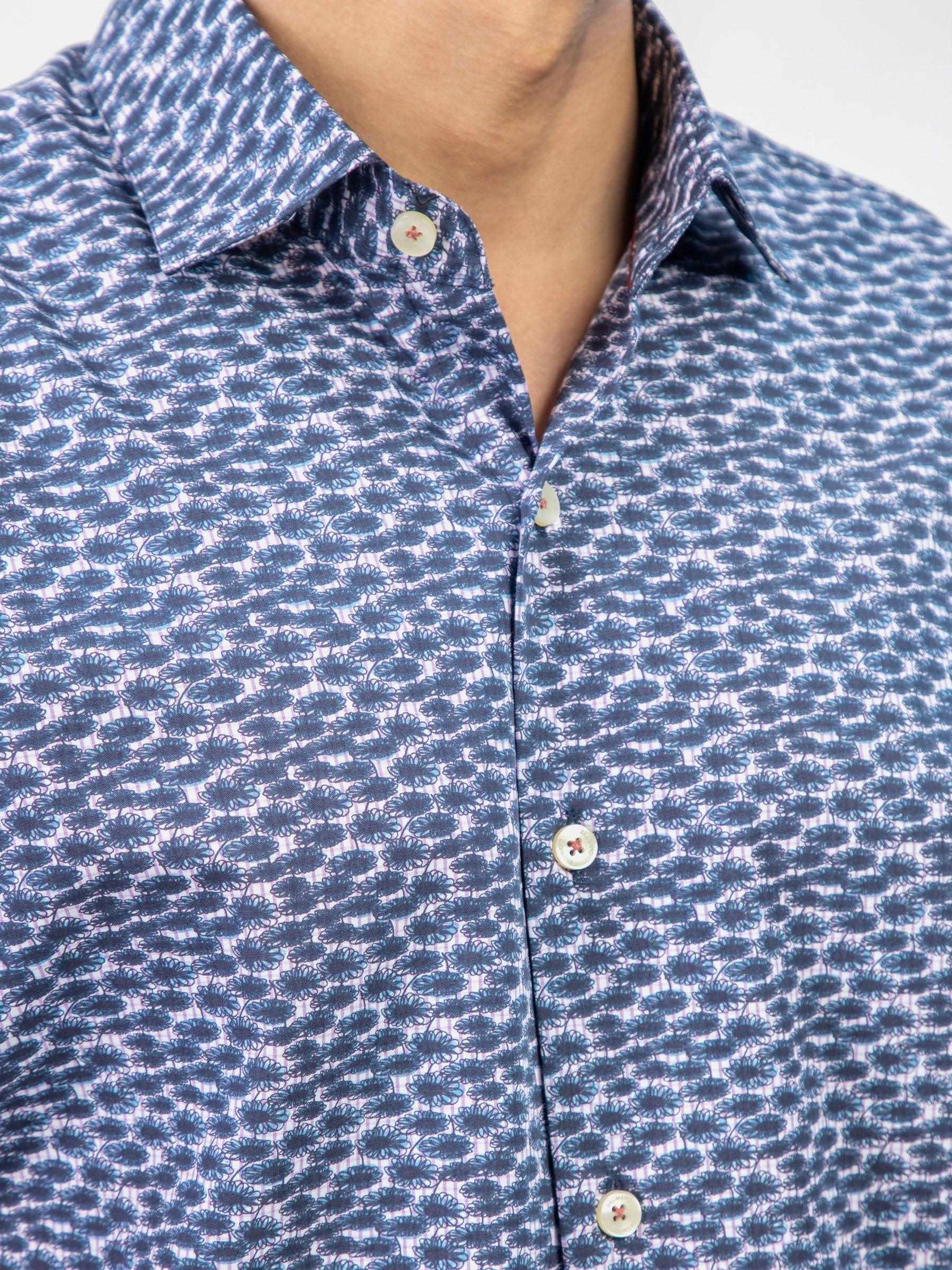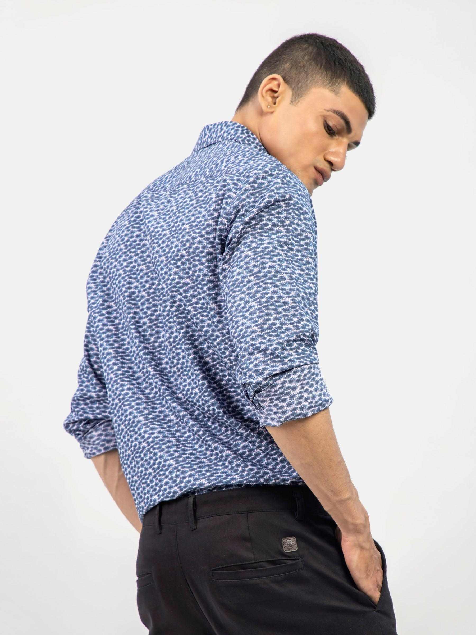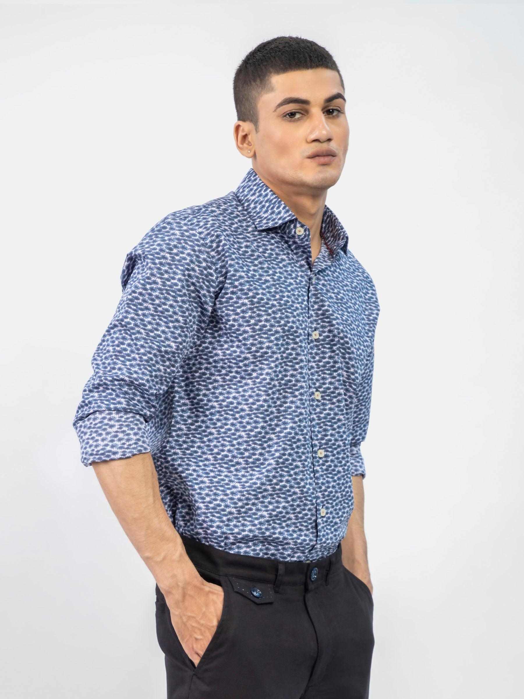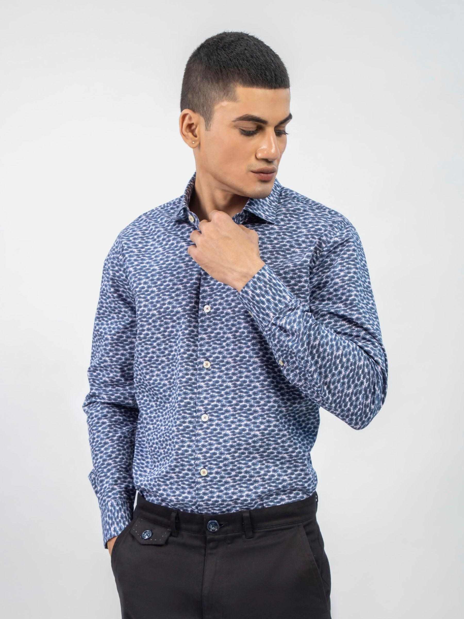 Add a pop of color to your summer wardrobe with our blue printed shirt, featuring a subtle abstract print. Full sleeves, classic collar & inner collar ribbon detailing completes the look of this smart casual shirt. Pair it with navy blue or black chinos to pull off a dapper look