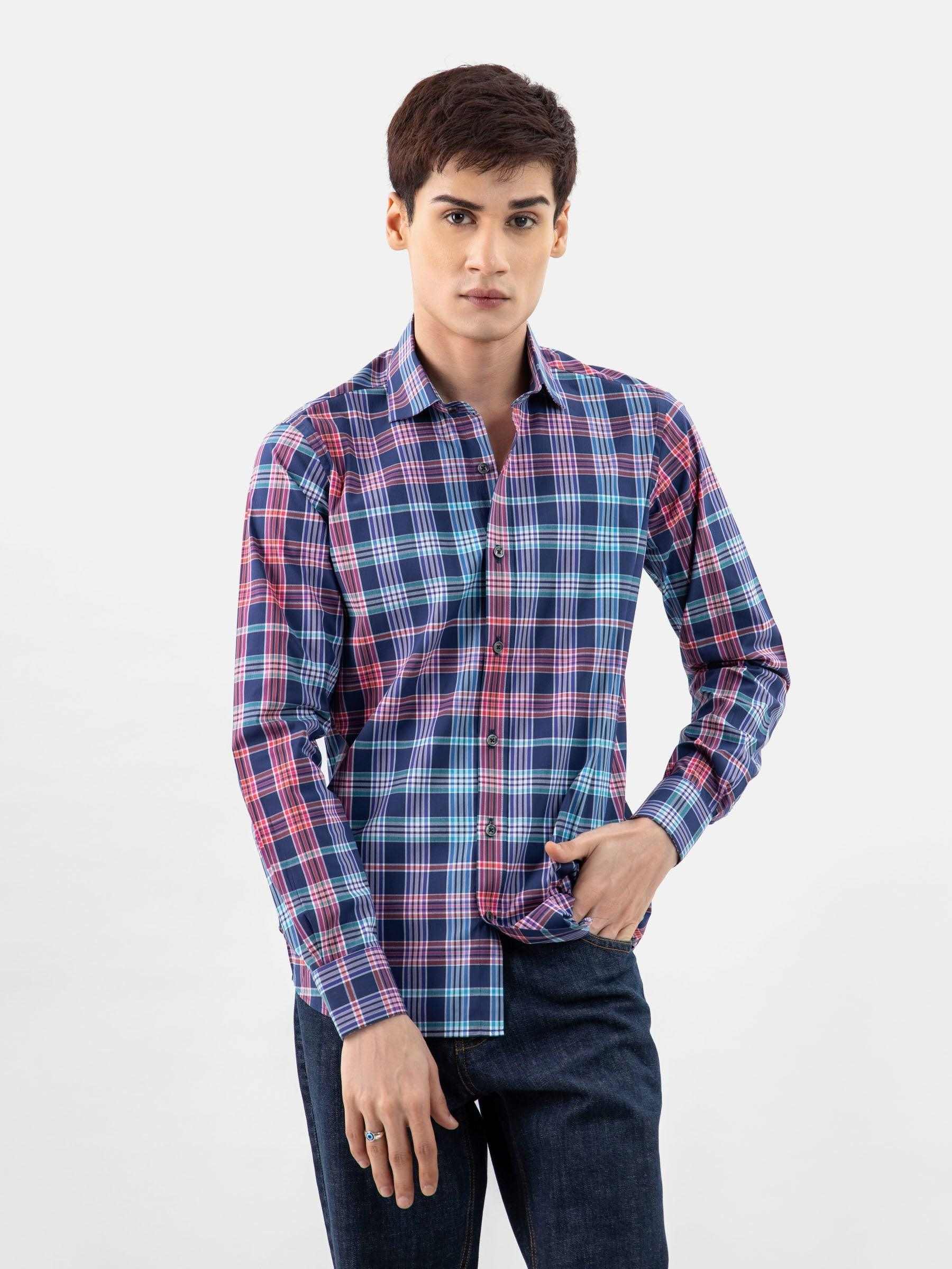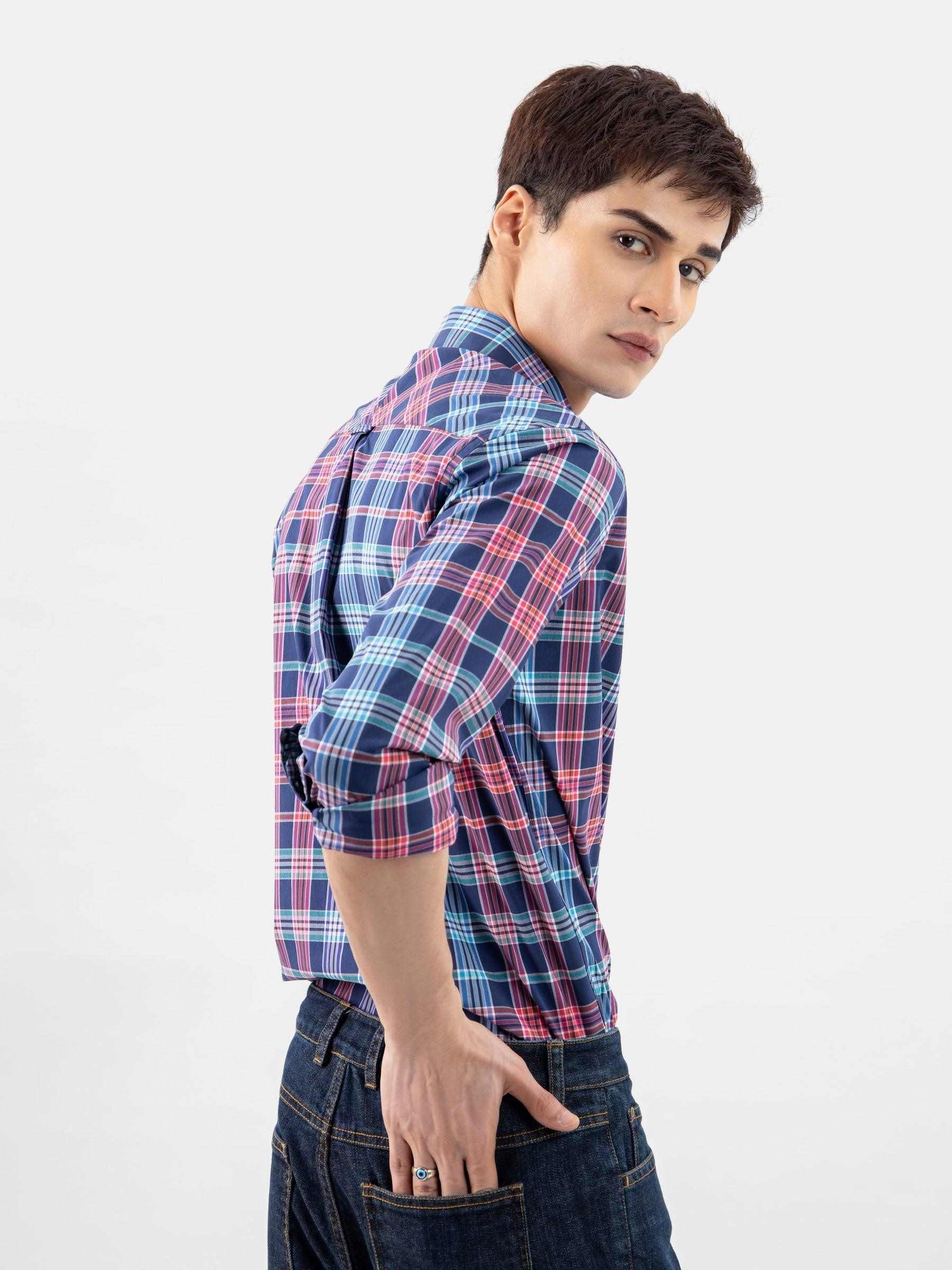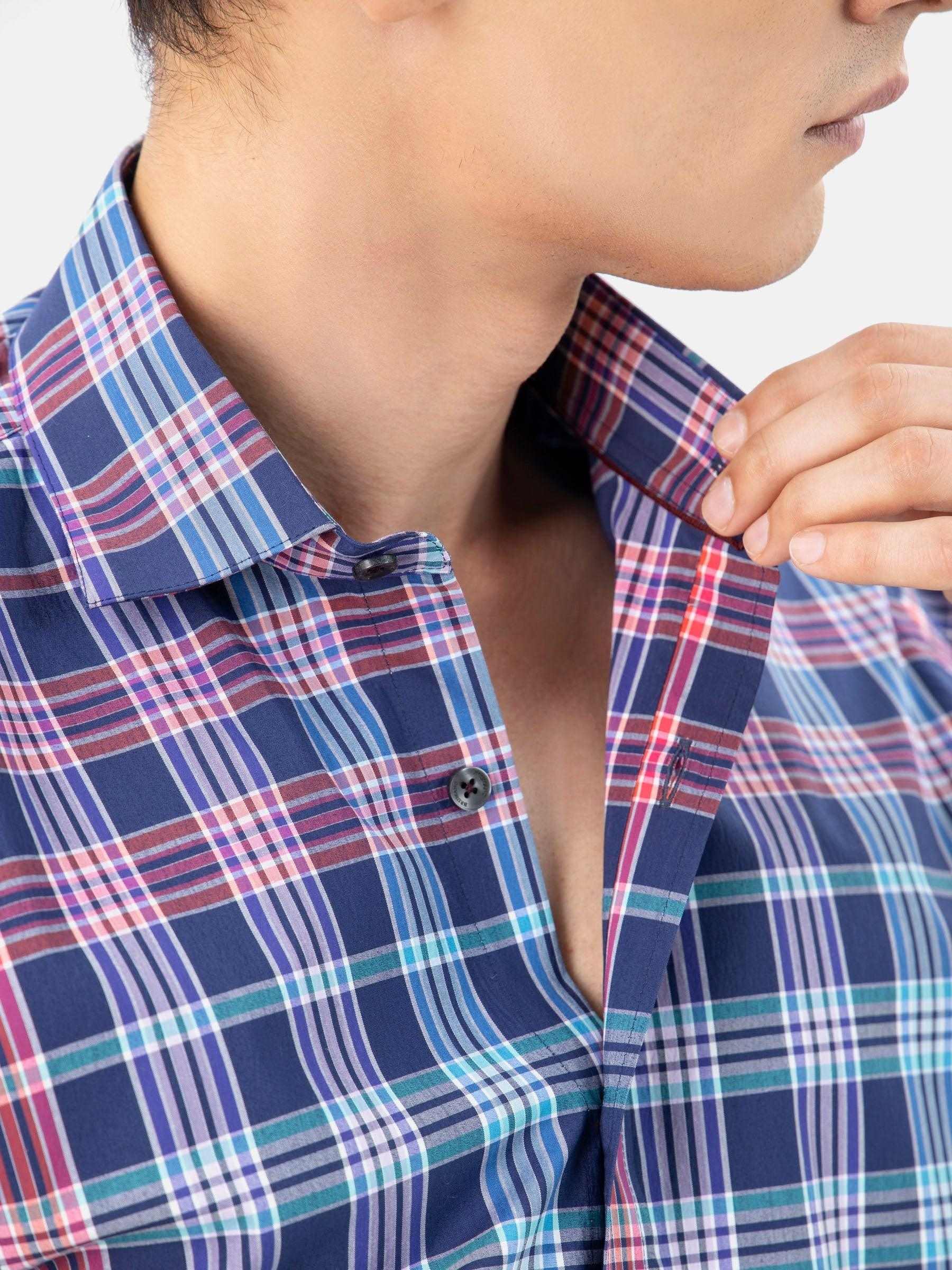 Upgrade your summer wardrobe with our men's navy blue multicolor checkered shirt. Perfect for summer season, this formal shirt adds a touch of sophistication, while the combination of navy blue & multi color checkered pattern exudes a fresh and vibrant appeal. Ideal for office wear