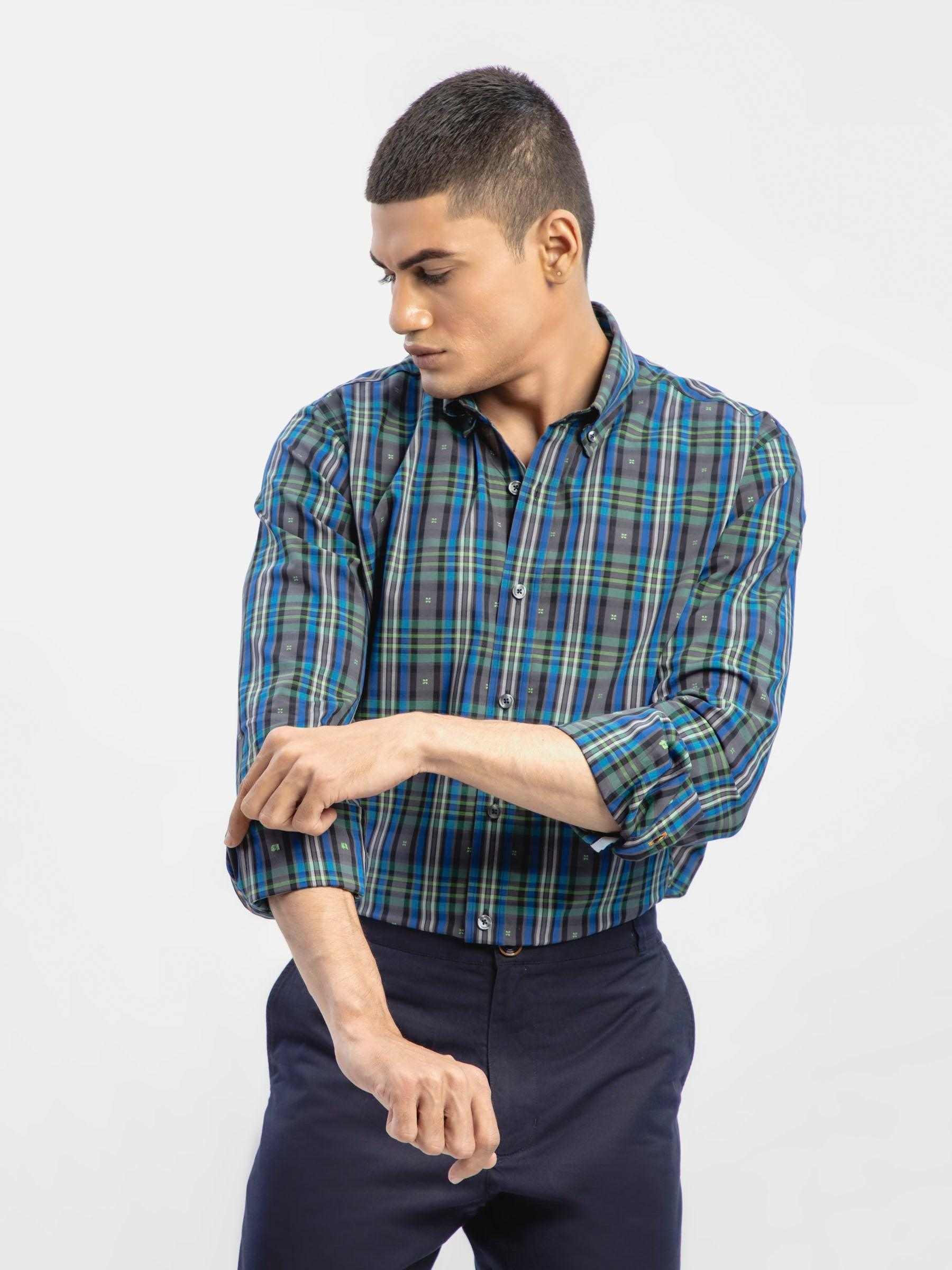 Elevate your summer look with our mens navy blue & green checkered shirt, featuring a classic tartan plaid pattern in refreshing blue and green hues. Perfect for casual outings or beachside gatherings, it offers a relaxed yet polished vibe. Finished with button down collar & inner collar detailing