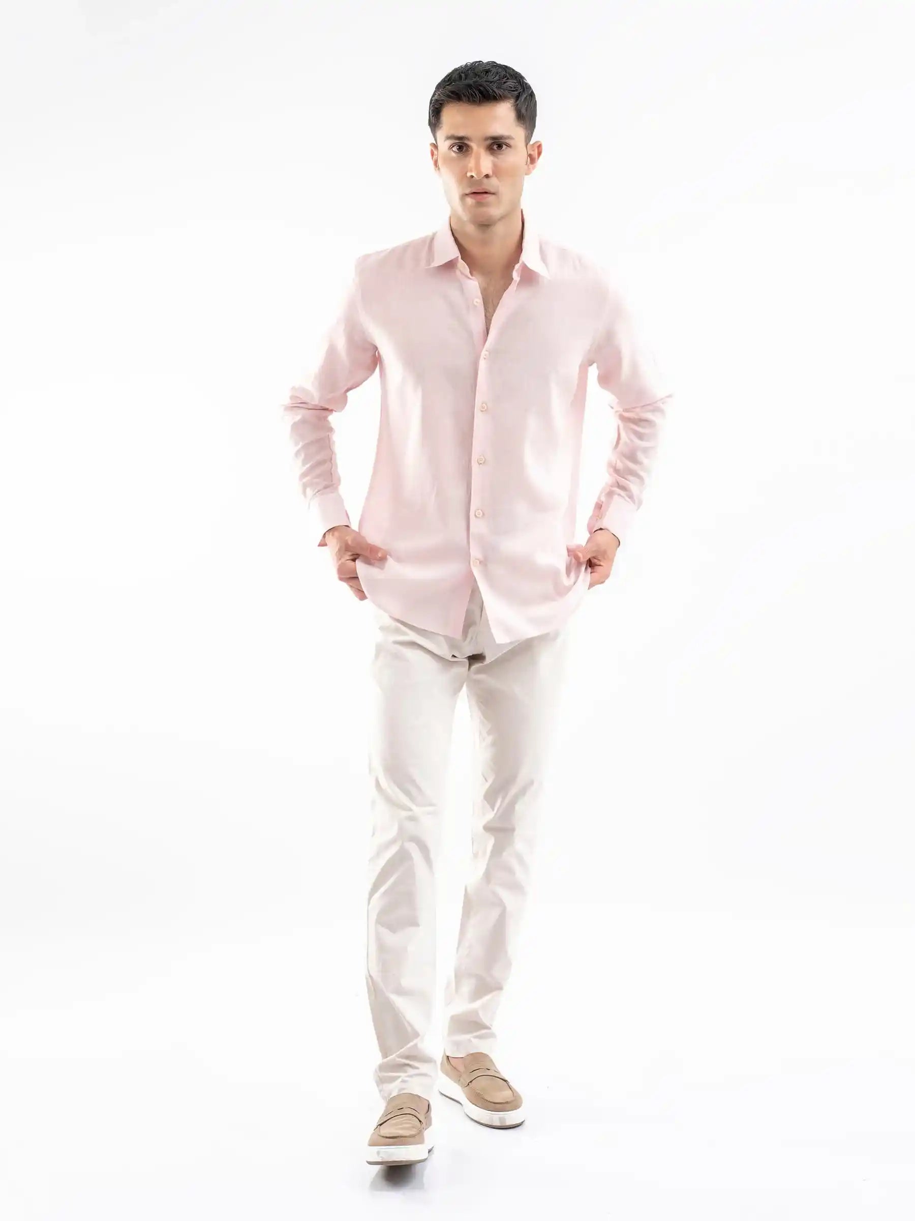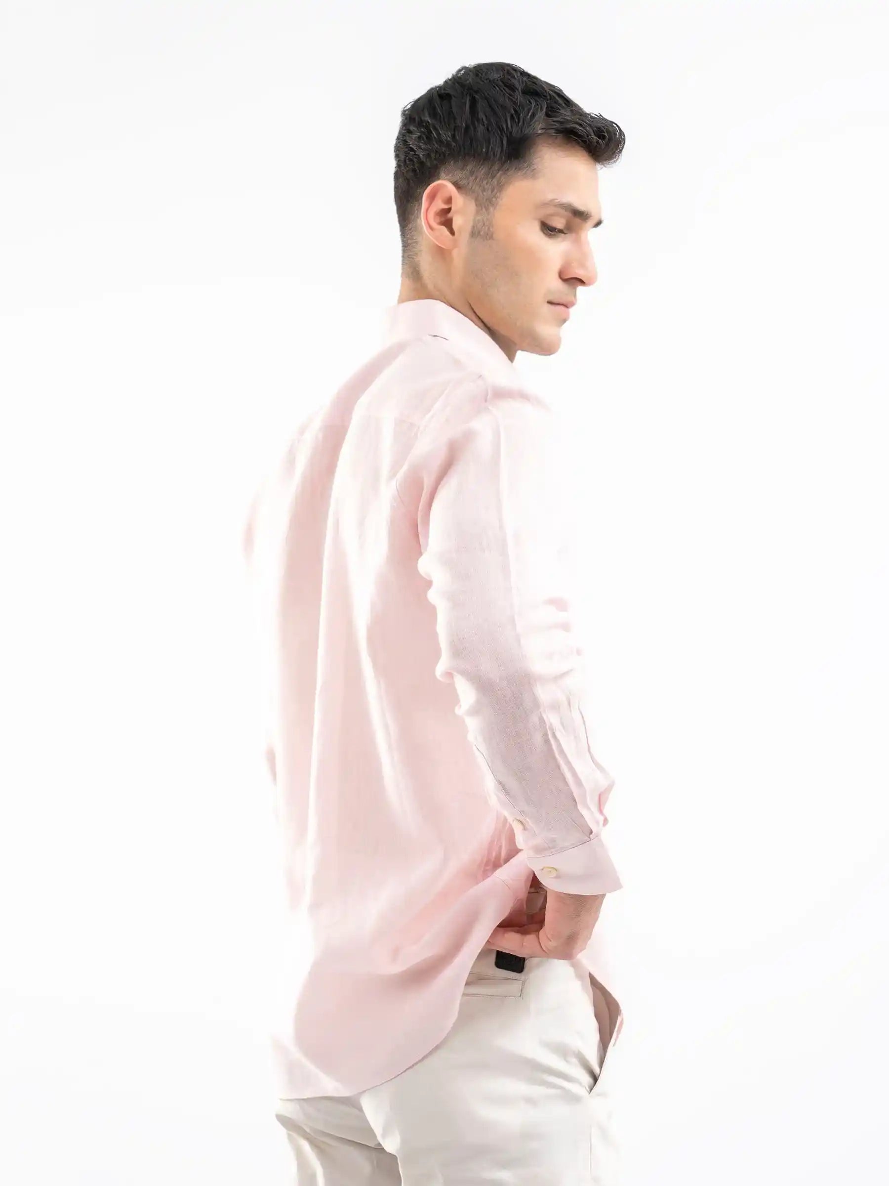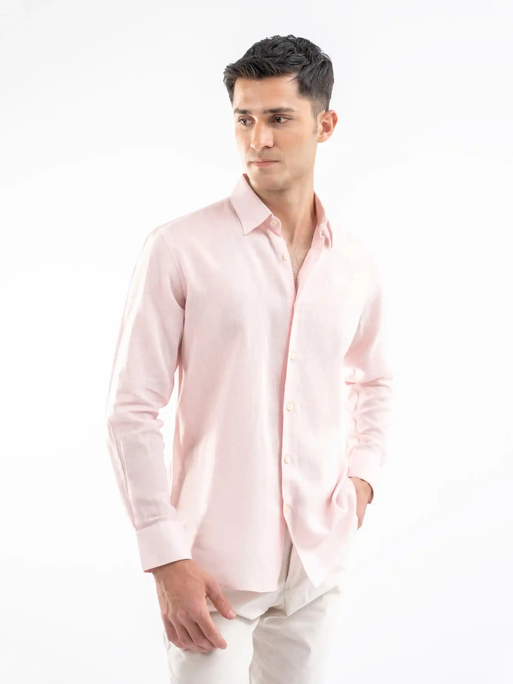 Stay cool and stylish with this pink airy linen blended shirt. Designed for breathability and comfort, its lightweight fabric offers a relaxed yet refined look. Perfect for casual outings or semi-formal occasions, pair it with chinos or jeans for effortless elegance.