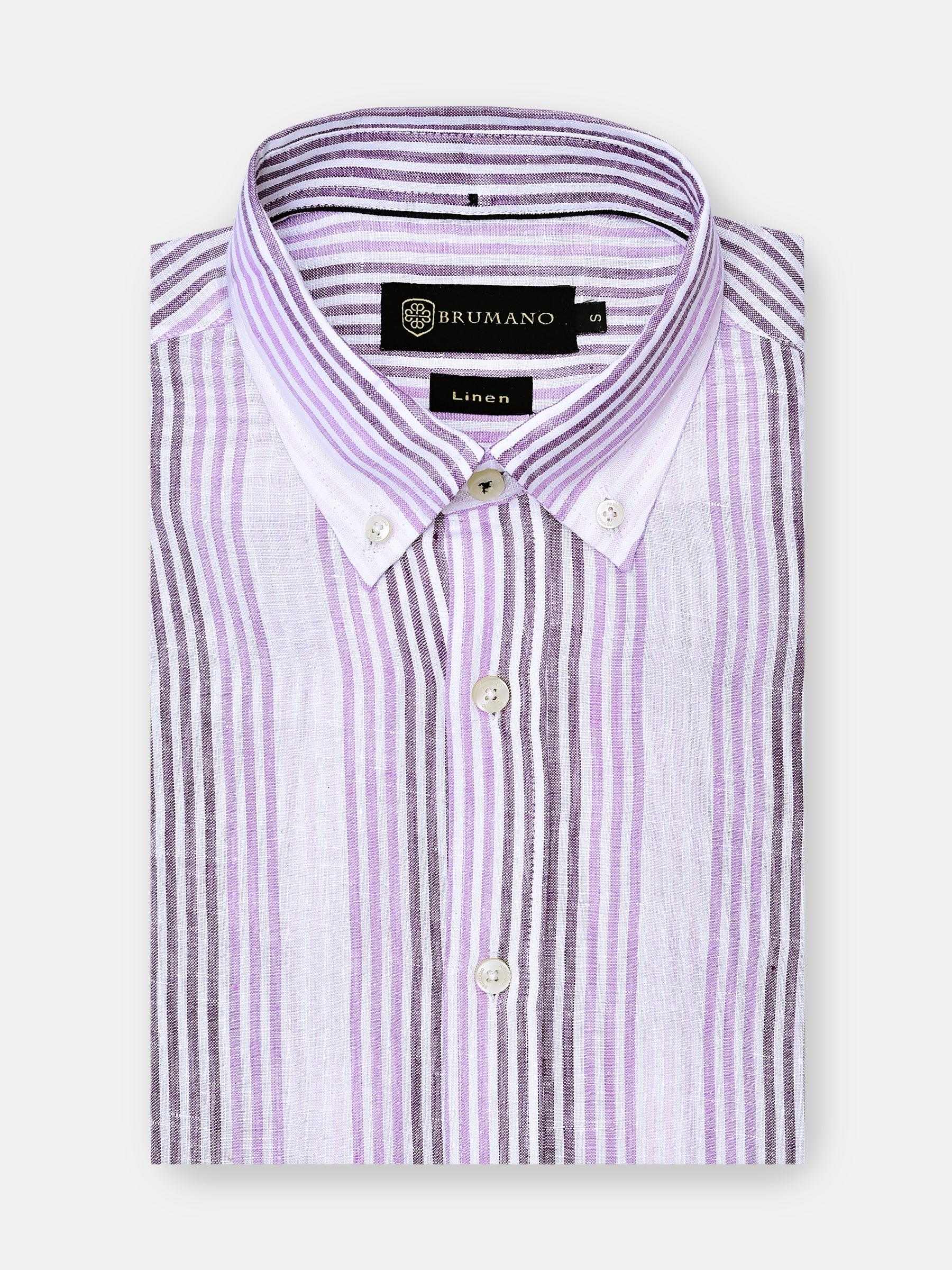 Elevate your summer wardrobe with our pink & purple 100% linen striped shirt, crafted from breathable linen fabric for all-day comfort. Its timeless striped pattern adds a touch of sophistication to any casual ensemble.