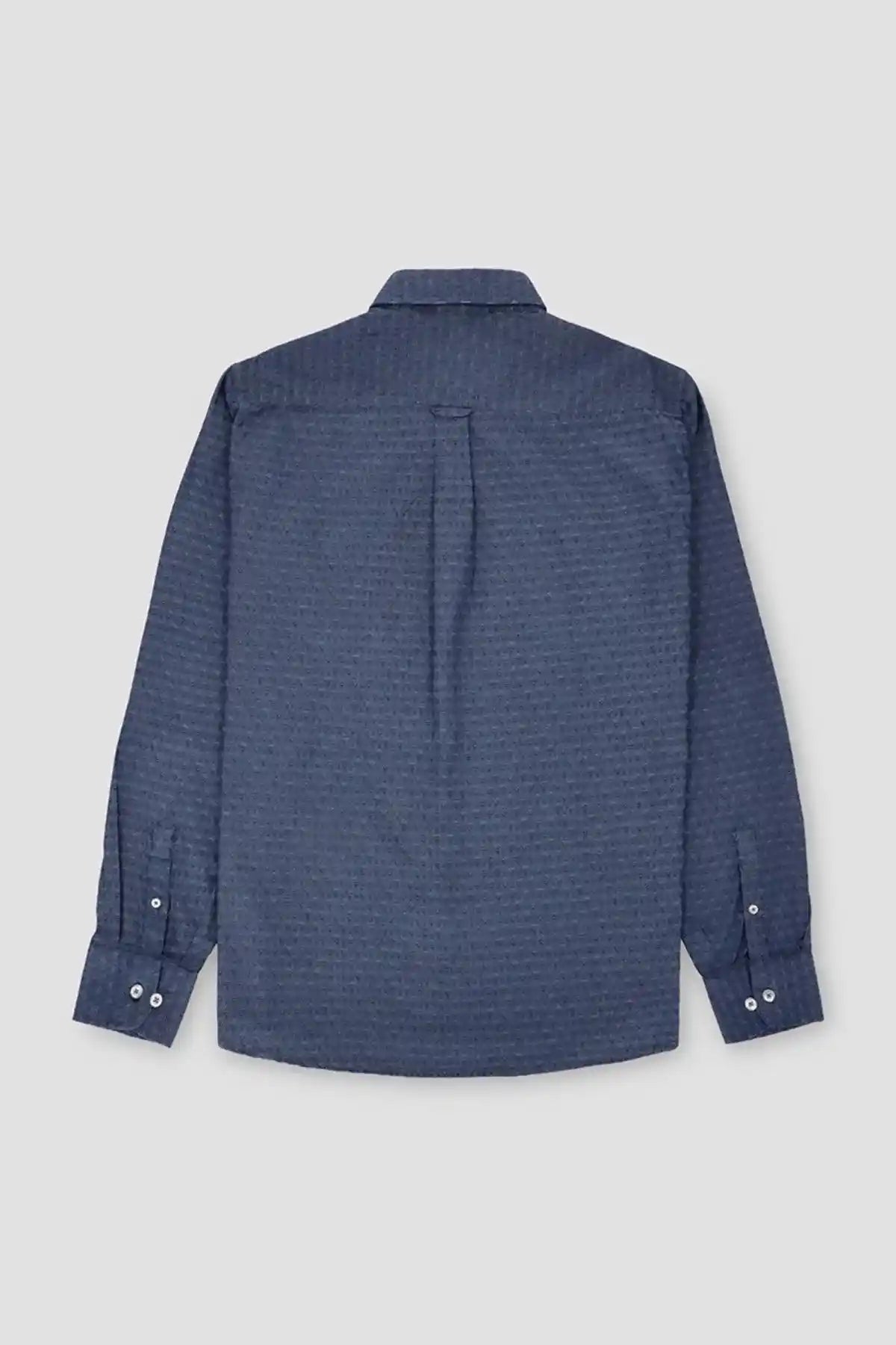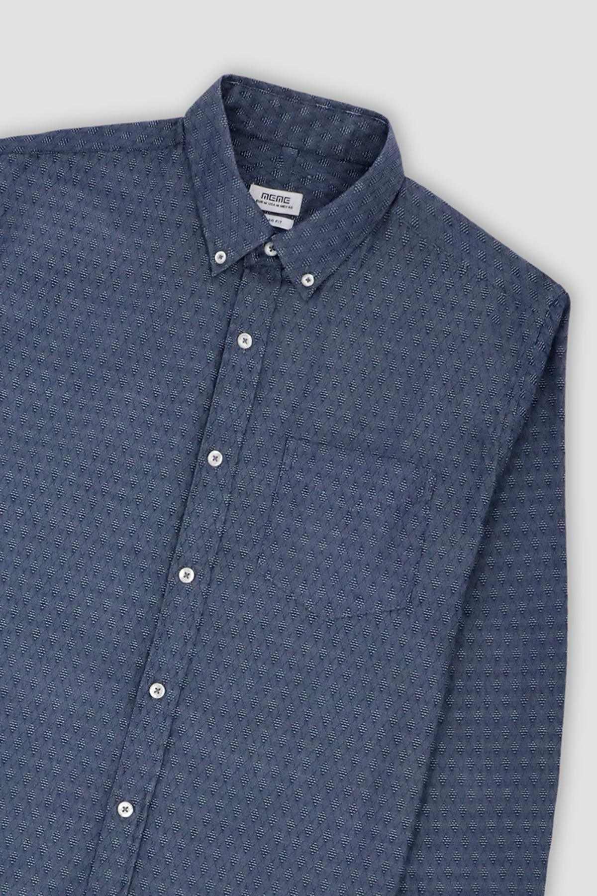 100% Blended. Self Textured Button Down Shirt With Regular Collar And Full Sleeves. Contrast Button Down Closure. Chest Patch Pocket. Rear Yoke With Inverted Pleat. Curved Hem