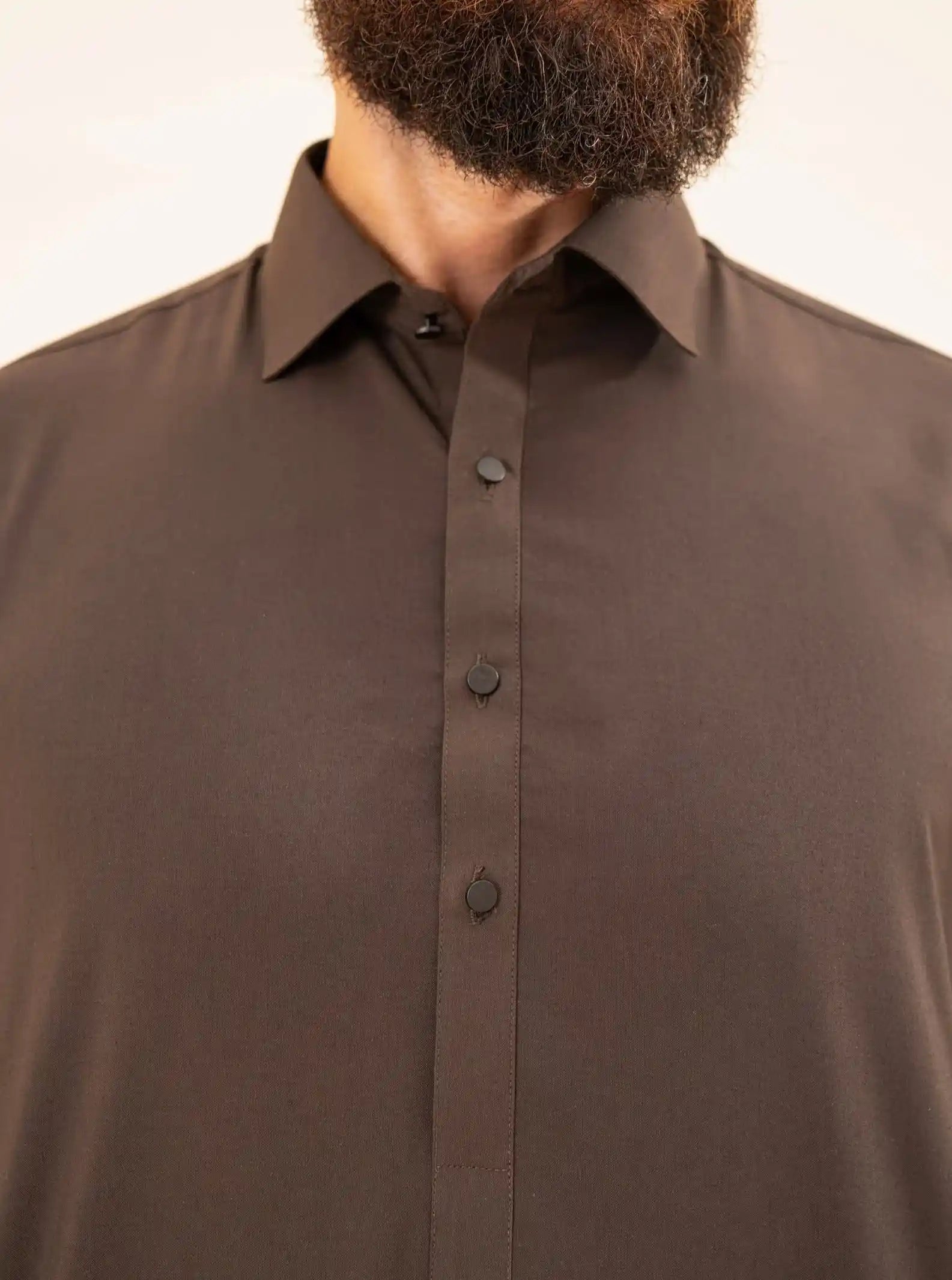 Experience The Richness Of The Dark Brown French Collar Shalwar Kameez, Crafted For A Classic Fit And Timeless Elegance.
