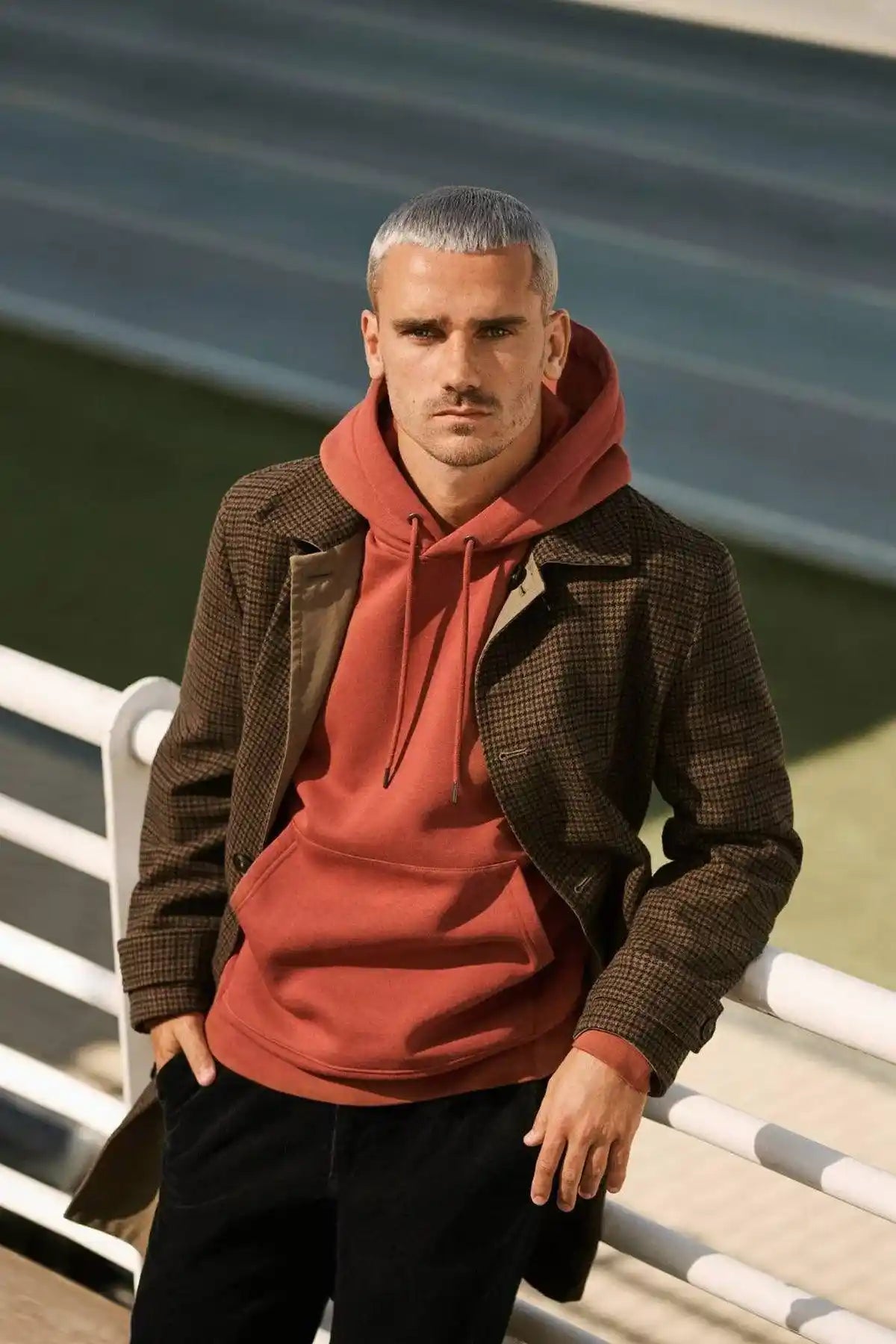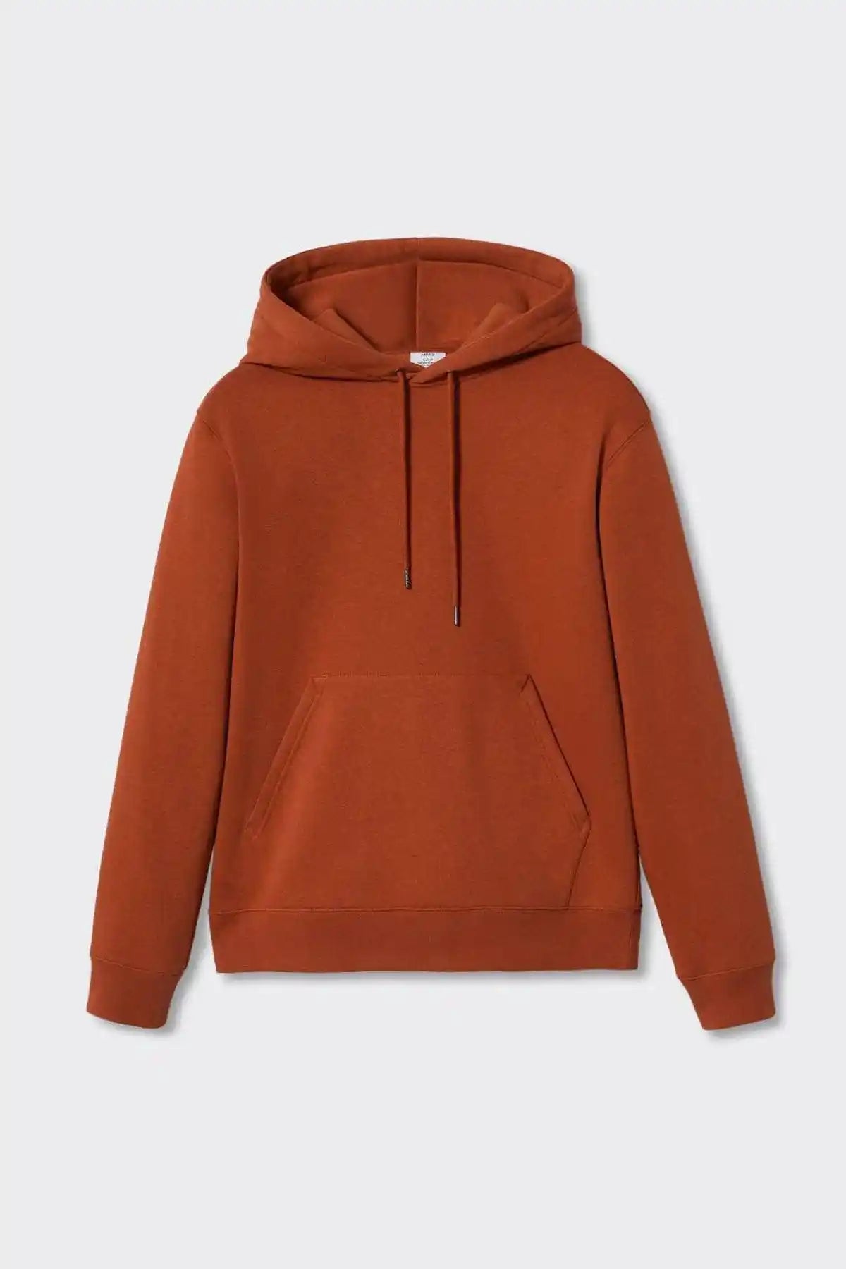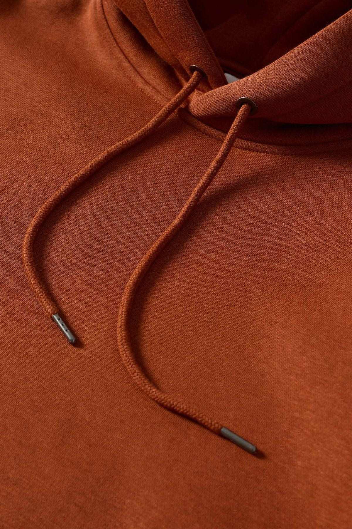 Basics Collection. Regular fit. Sustainable cotton blend fabric. Drawstring hood. Long sleeve. Pouch pocket. Elastic finish. The model is wearing a size M.