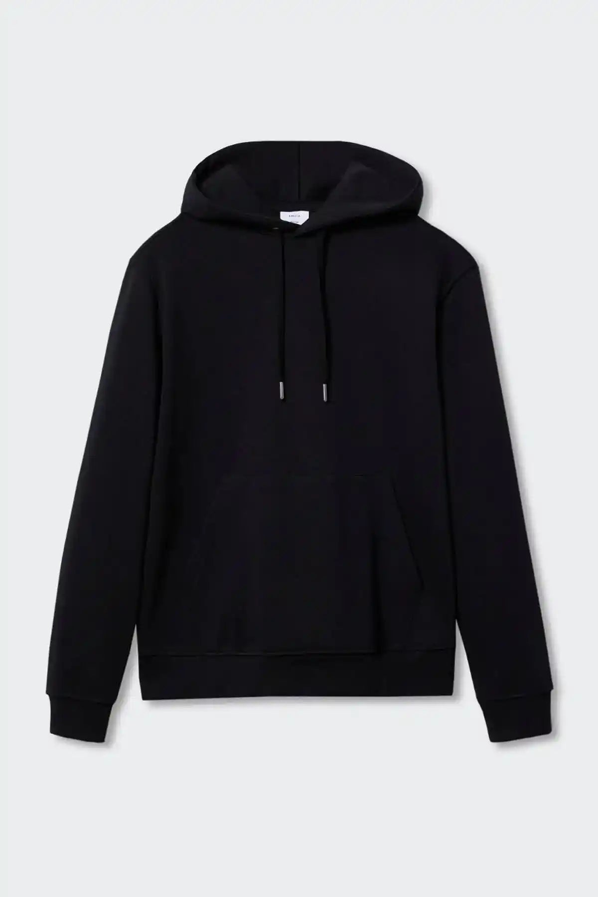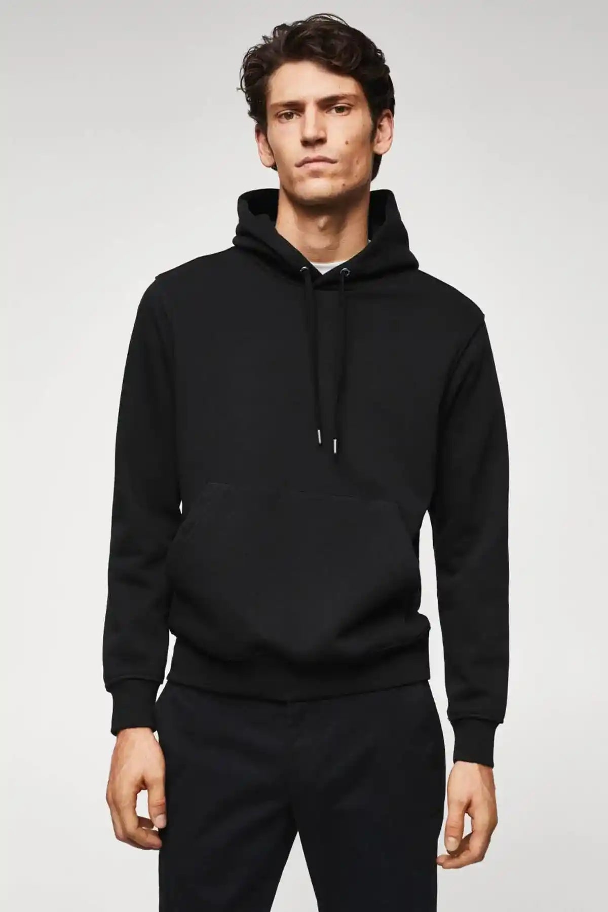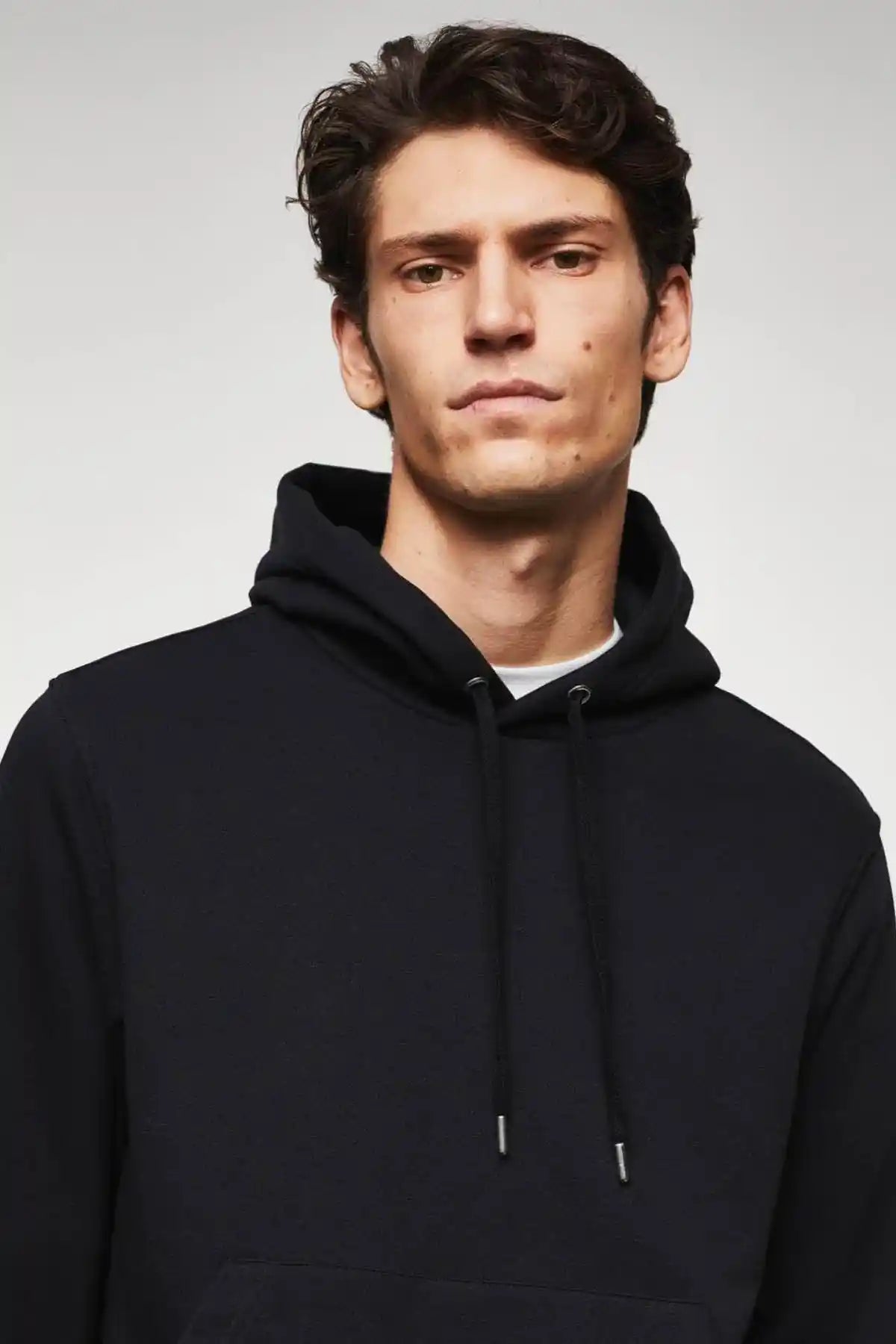 Basics Collection. Regular fit. Sustainable cotton blend fabric. Drawstring hood. Long sleeve. Pouch pocket. Elastic finish. The model is wearing a size M.