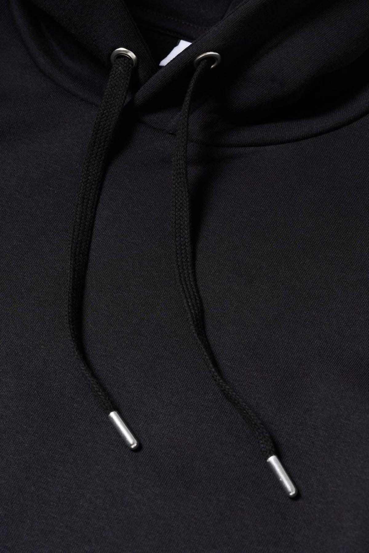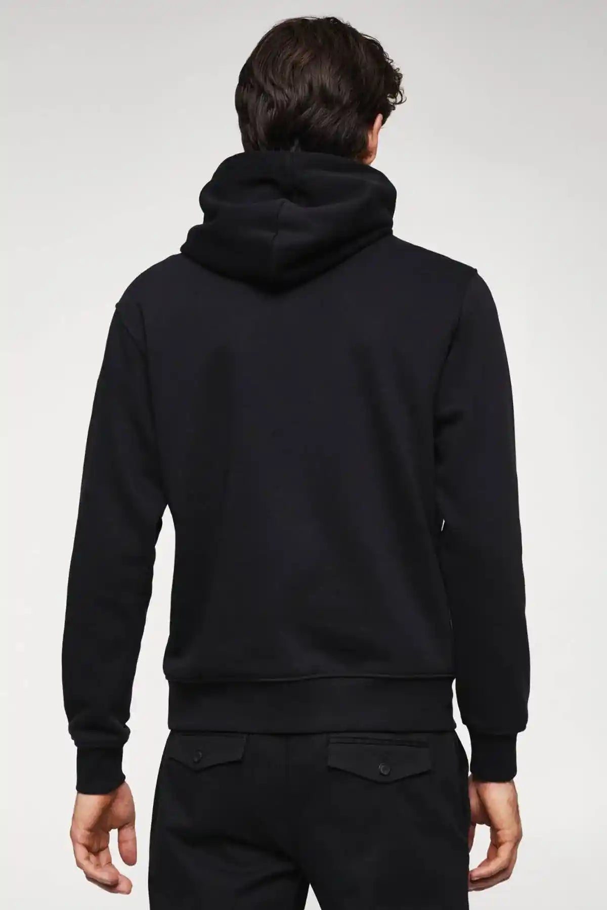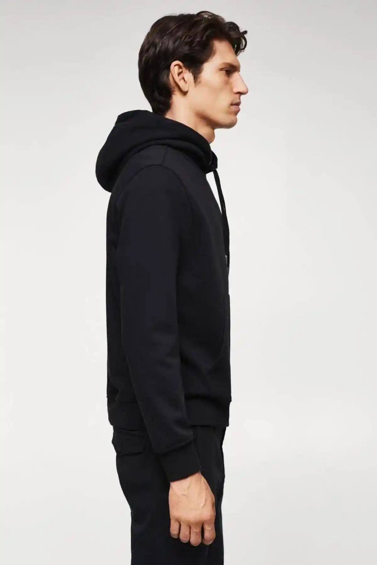 Basics Collection. Regular fit. Sustainable cotton blend fabric. Drawstring hood. Long sleeve. Pouch pocket. Elastic finish. The model is wearing a size M.