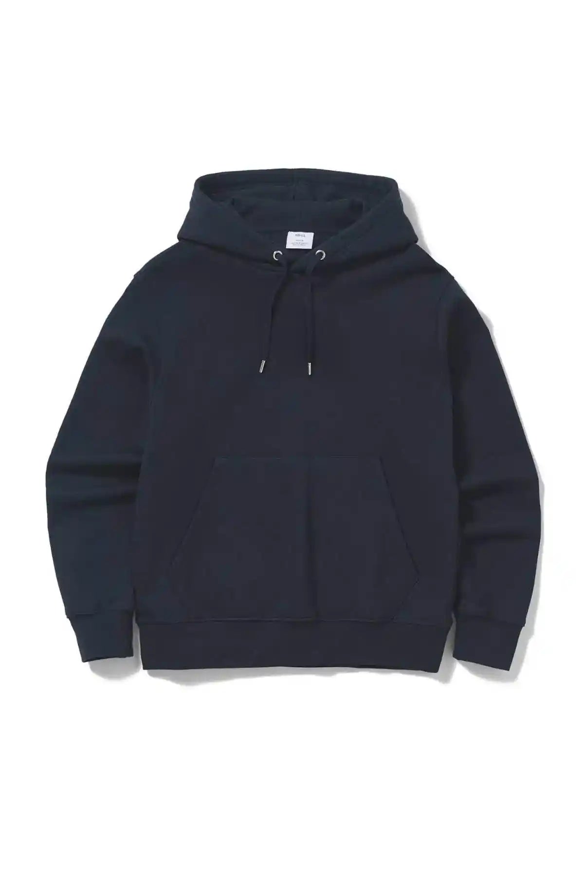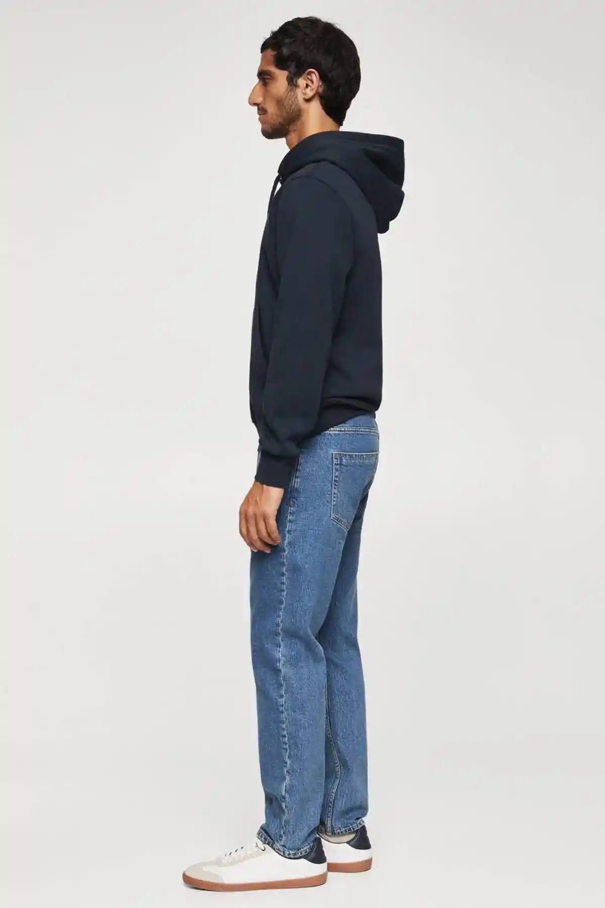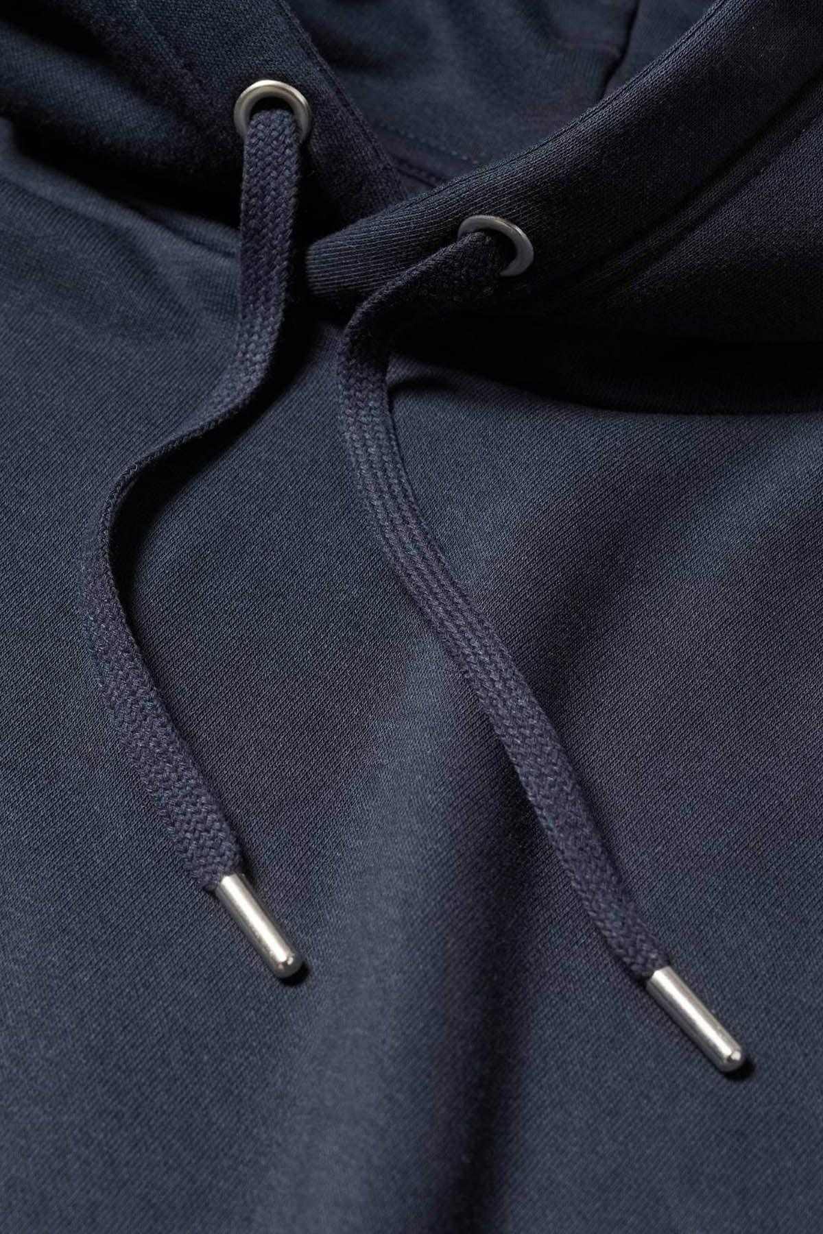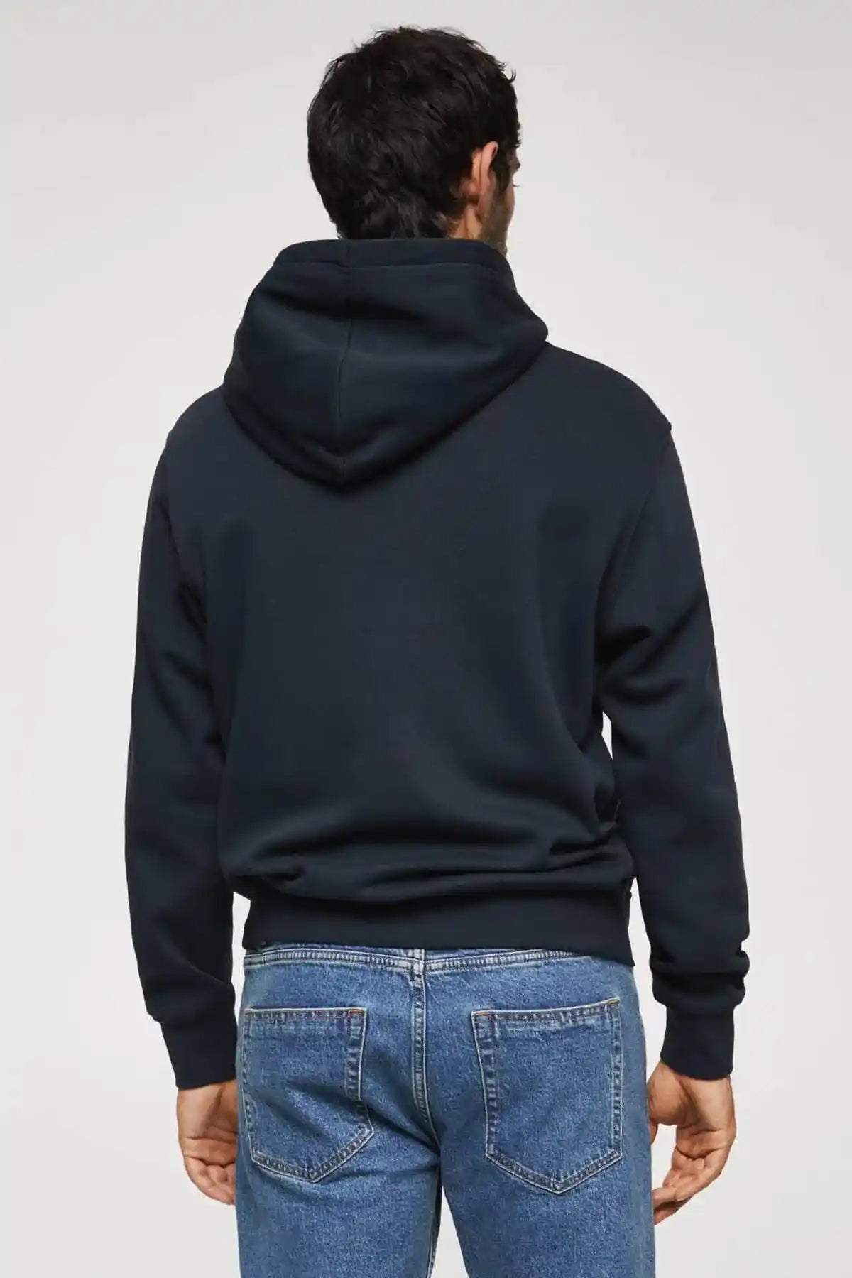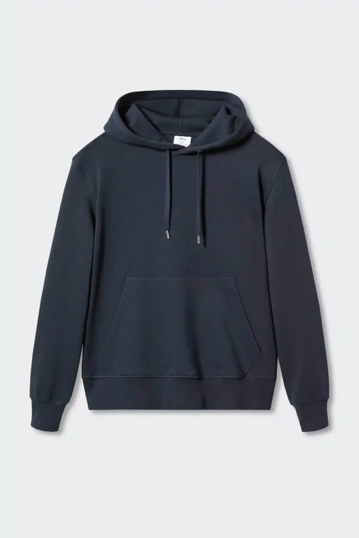 Basics Collection. Regular fit. Sustainable cotton blend fabric. Drawstring hood. Long sleeve. Pouch pocket. Elastic finish. The model is wearing a size M.