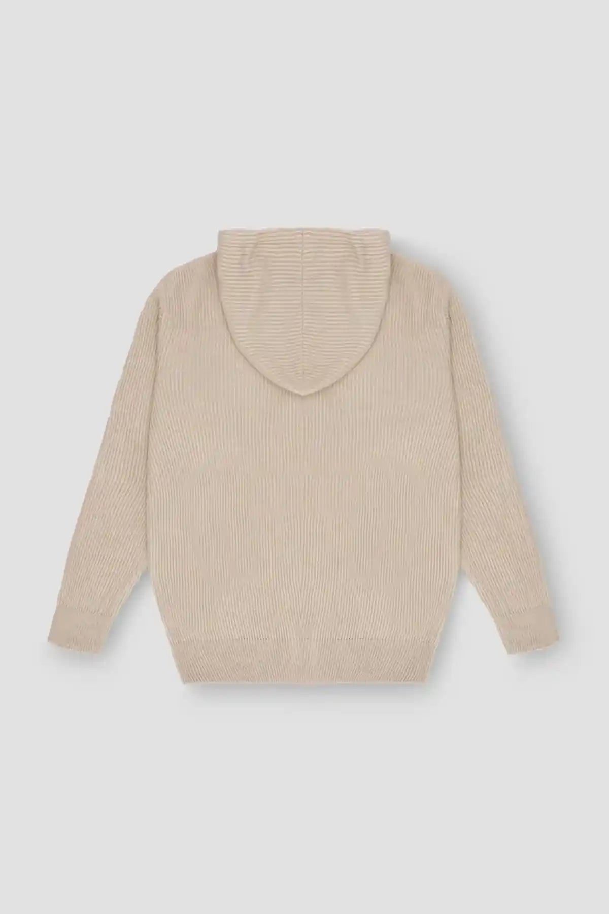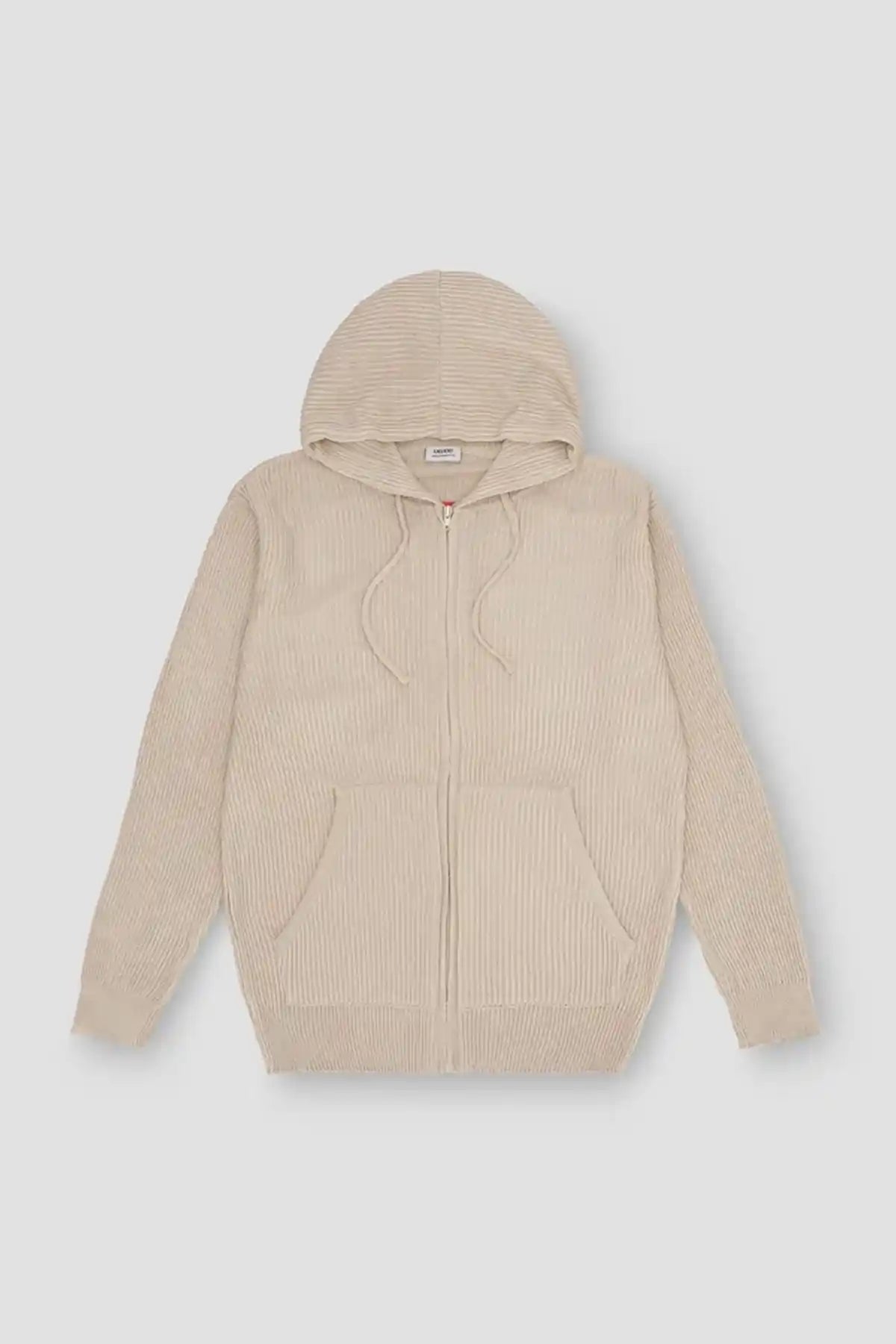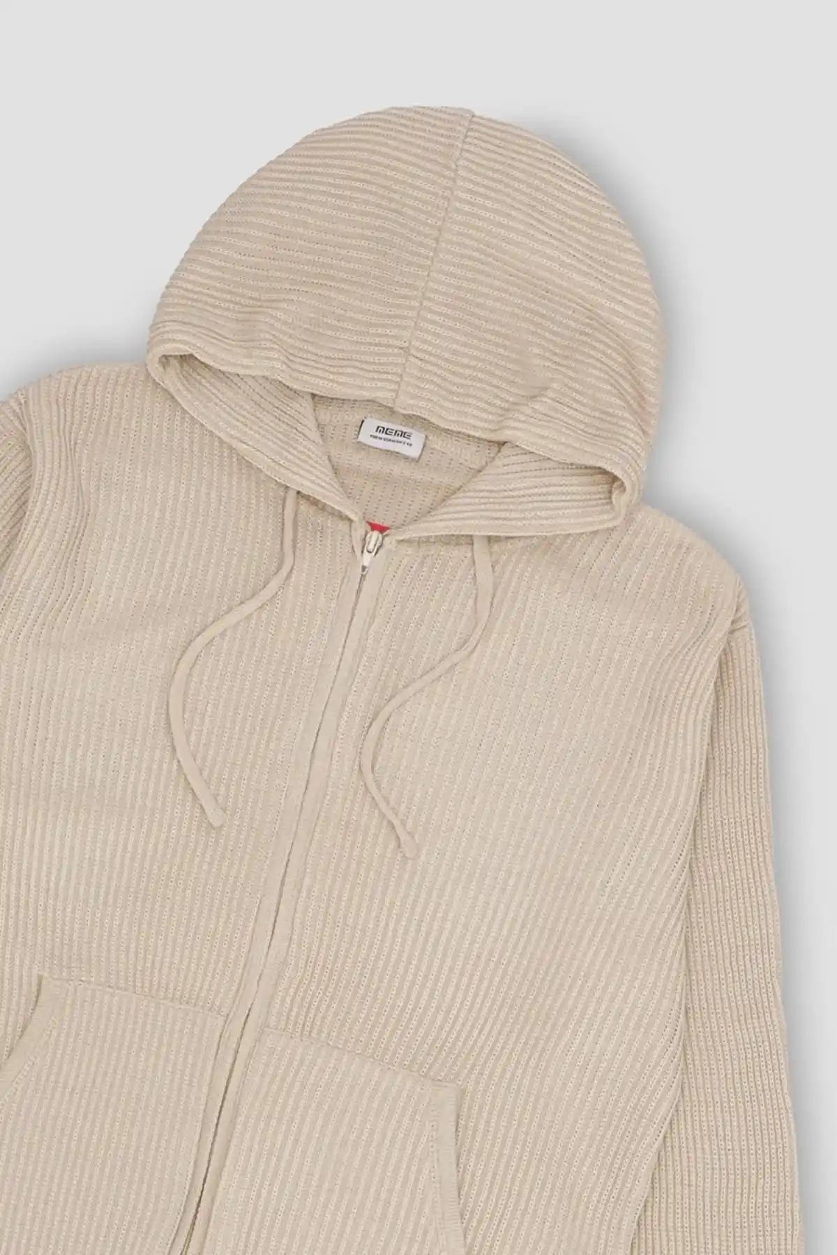 100% Acrylic. Cozy And Comfortable Classical Muted Ribbed Sweater Featuring Centre Front Zipper Closure With Hood And Self Drawstring. Kangaroo Pockets. Long Sleeves.