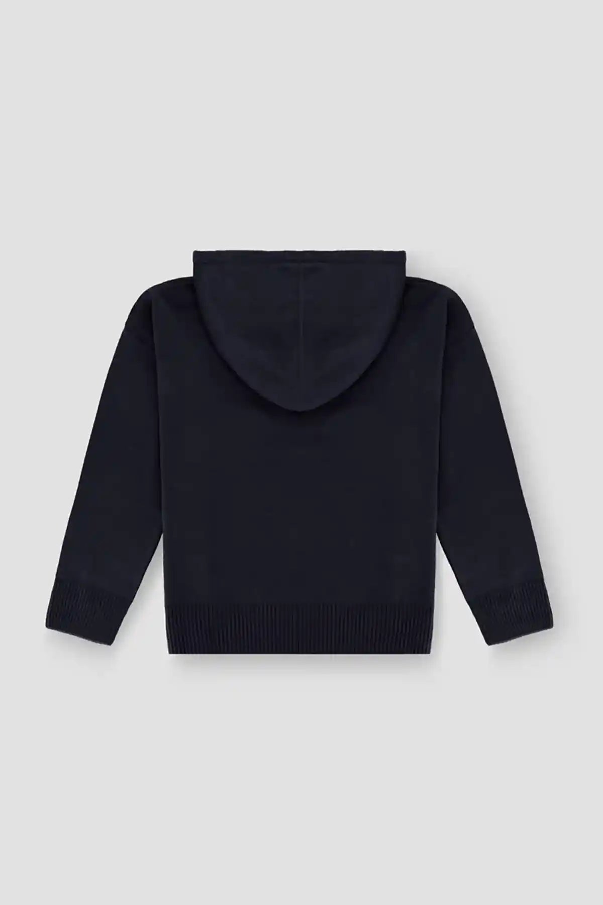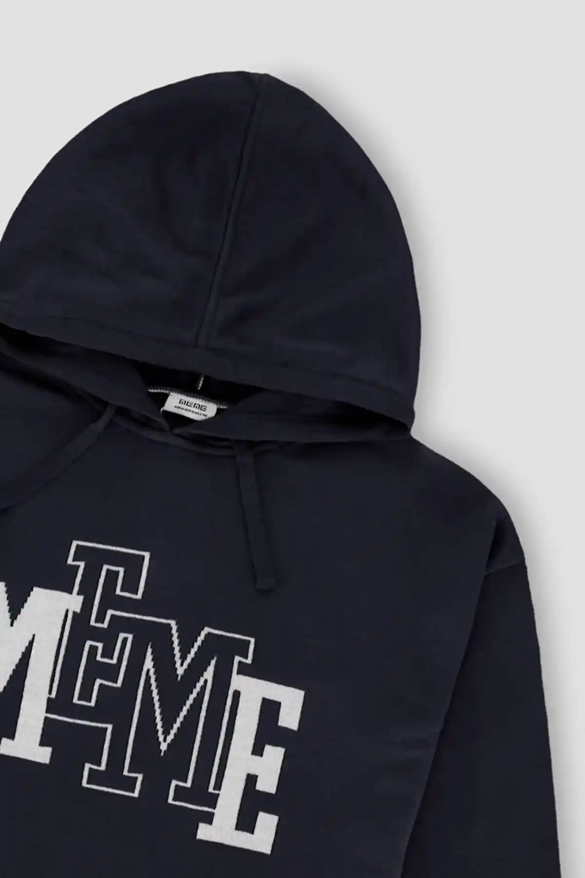 100% Acrylic. Cozy And Comfortable Neutral Front Closed Drop Shoulder Hoodie With Self Drawstring And Hood. Ribbed Long Sleeves. Front Typography. Ribbed Hem