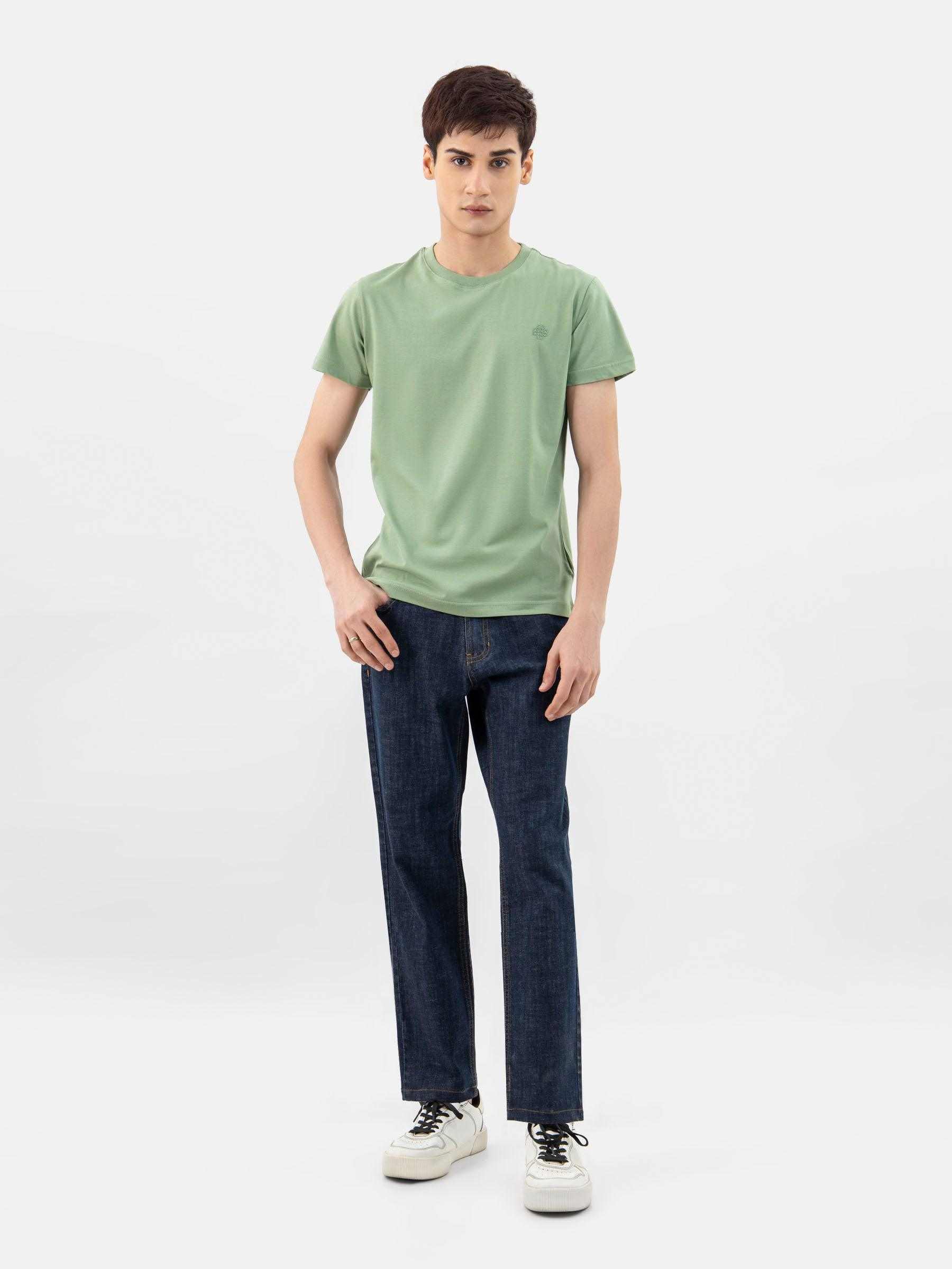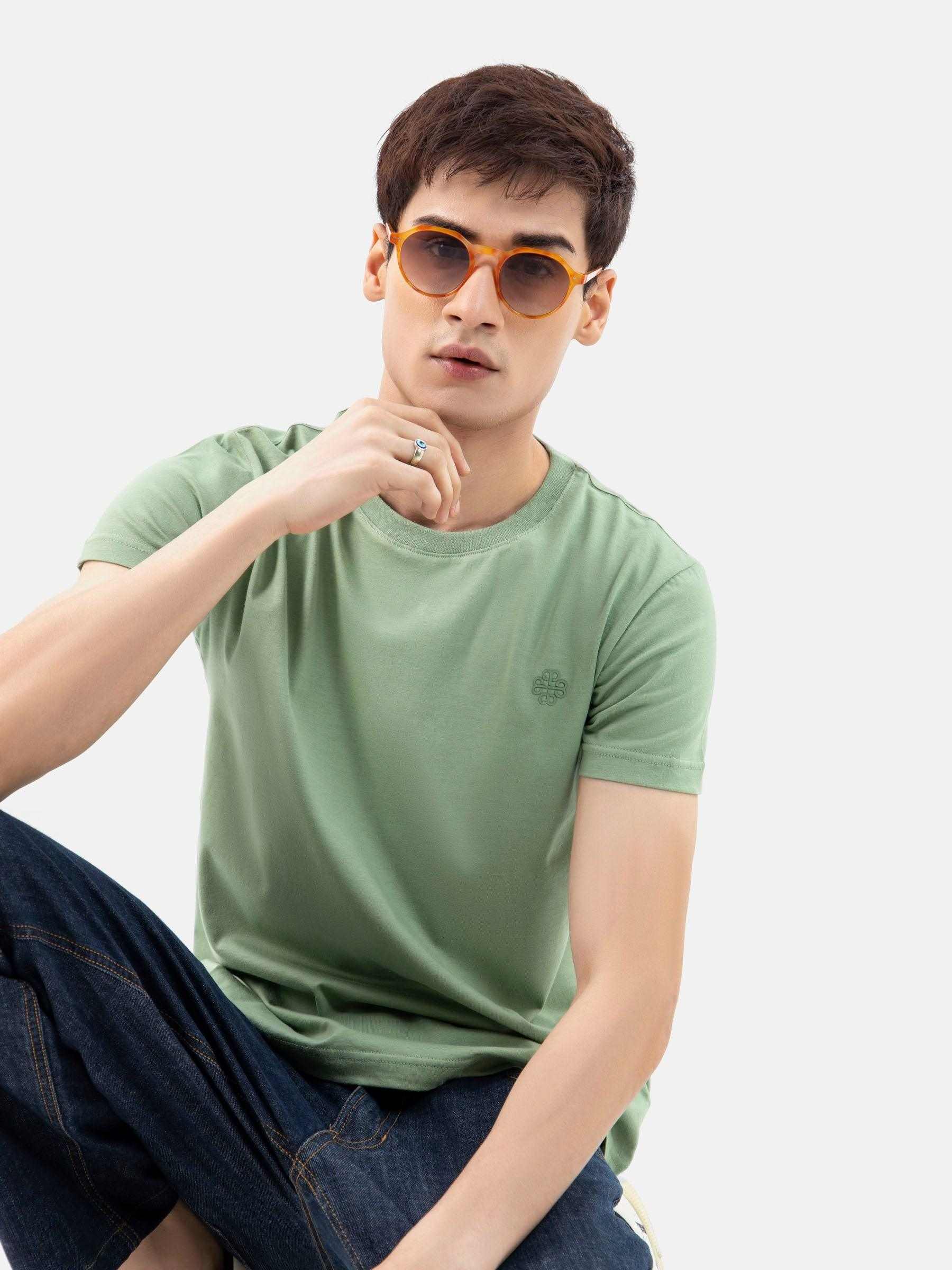 Make a statement with our men's laurel green combed cotton t-shirt. Perfect blend of luxury comfort & style. Featuring ribbed crew neck, short sleeves & branded 3d printed emlem in front. Pair it with blue jeans for a chic look