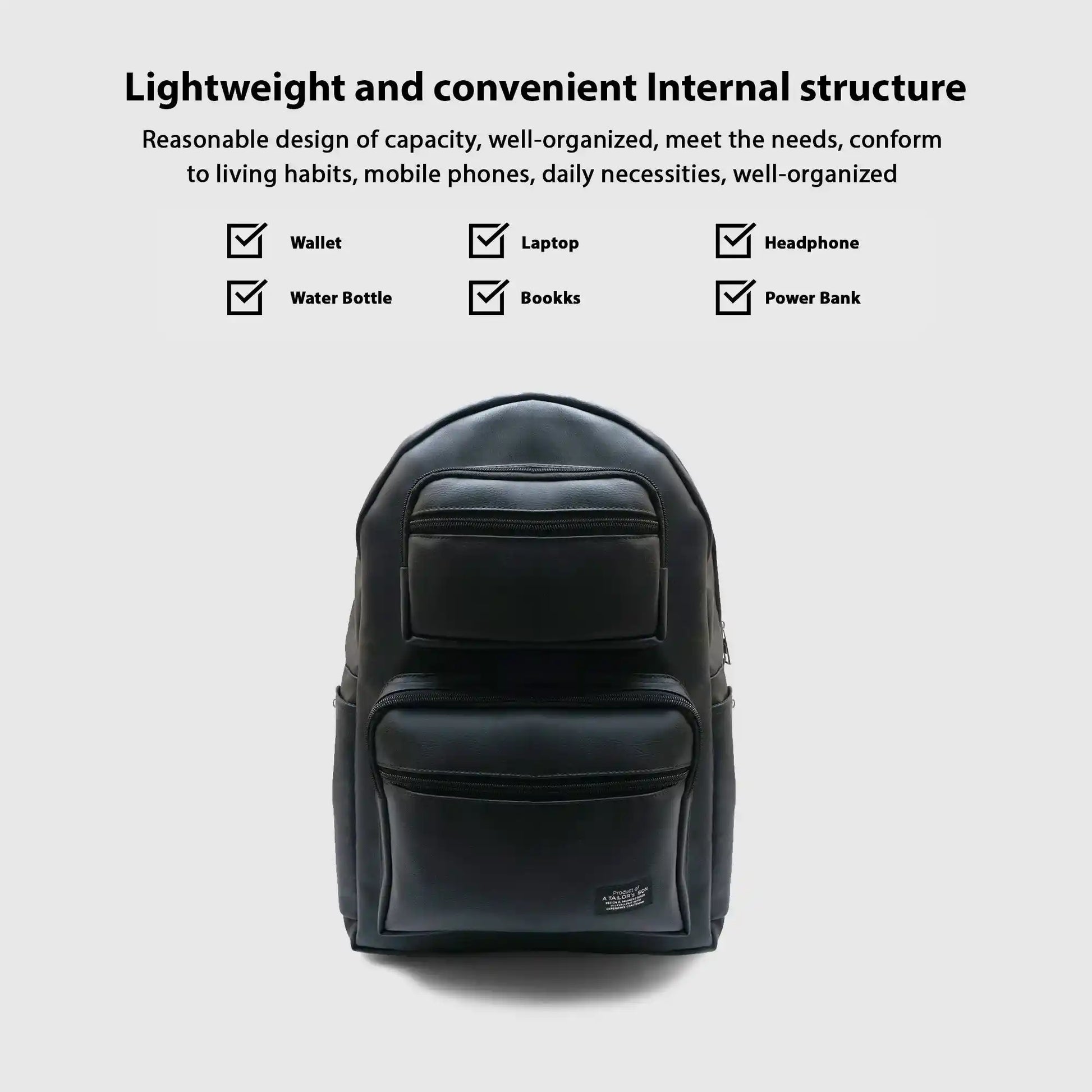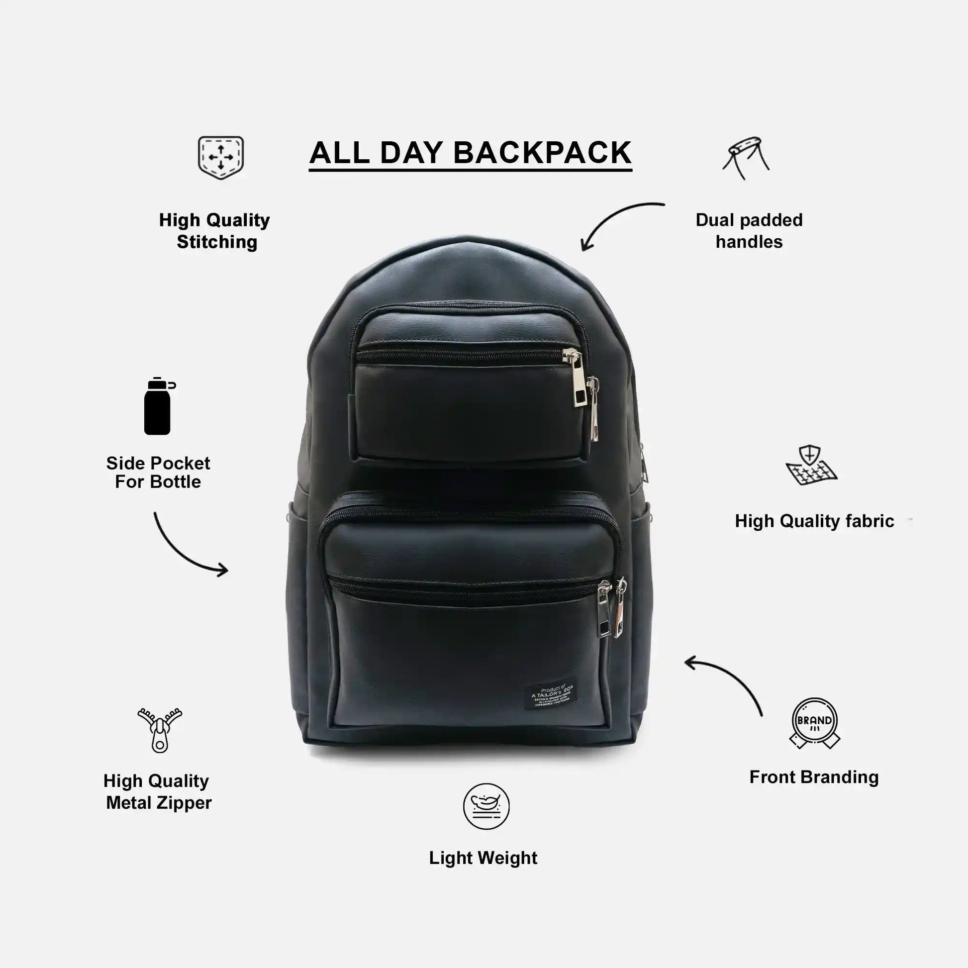 A Tailor son All Day Black backpack is lightweight and hardwearing - a great commuter companion. It's made from synthetic leather and has 1 main compartment, laptop compartment, 4 front zipped pockets, 2 side pockets and internal slip pocket.