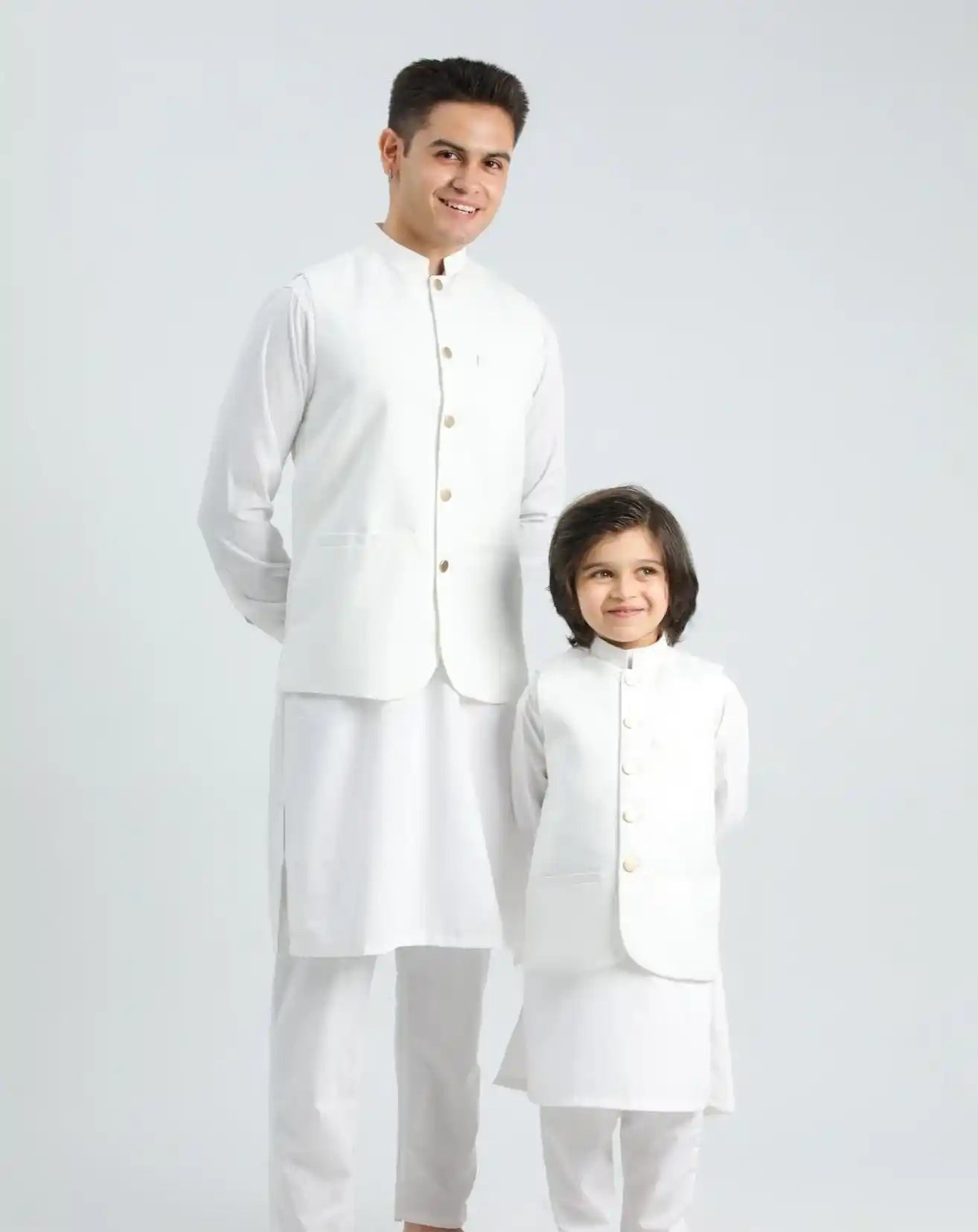 Off White Kameez Shalwar with Suiting Waistcoat - Round Cut - Men