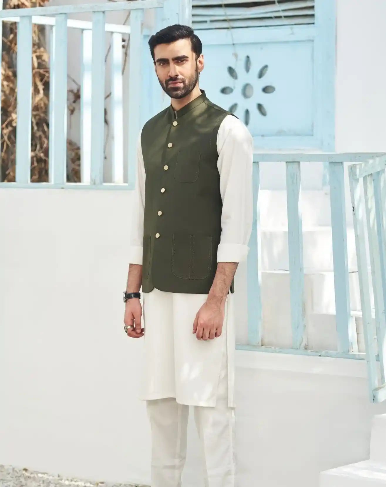 Off White Kurta Trouser with Army Green Suiting Waistcoat - Round Cut - Men