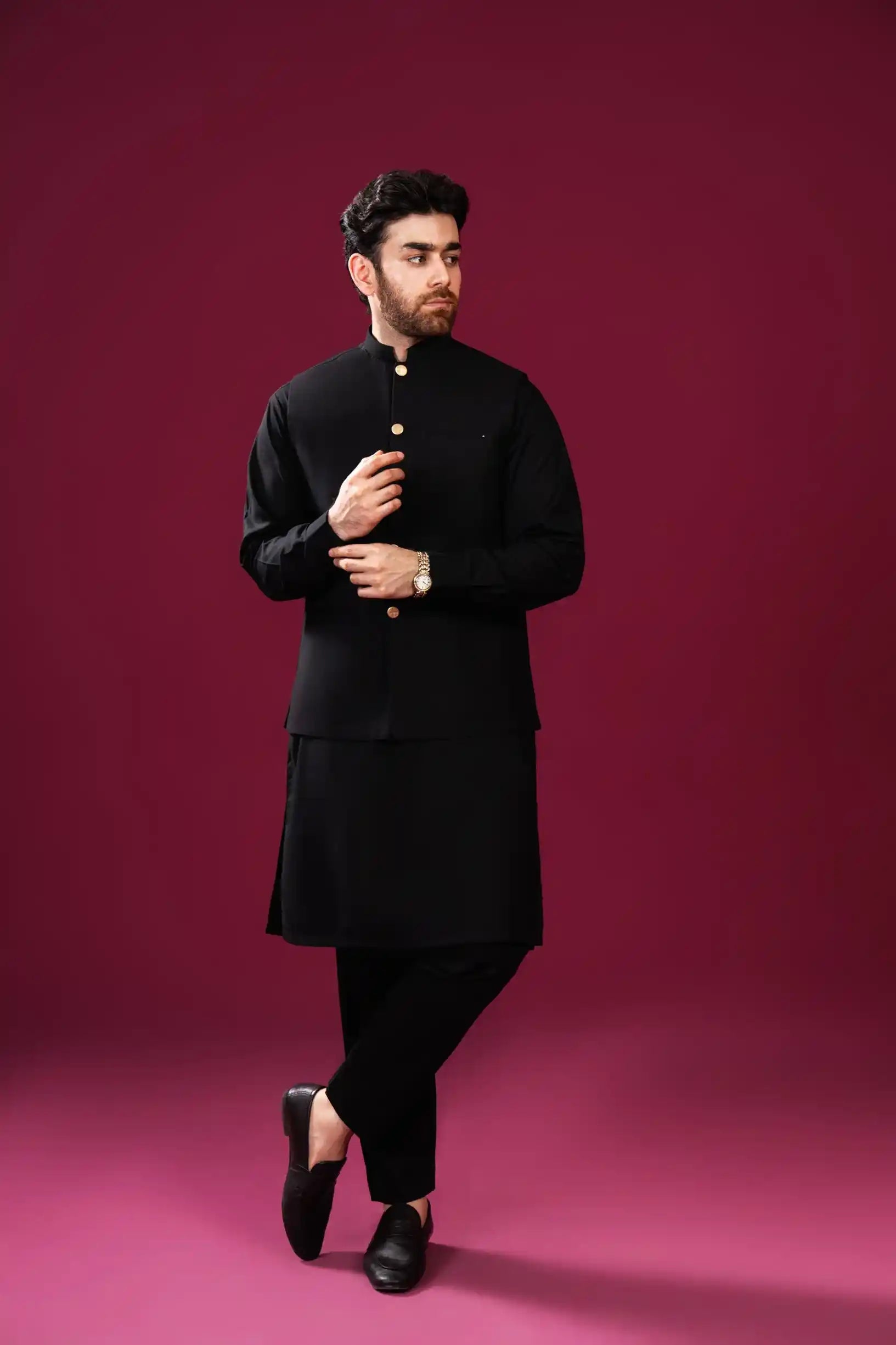 Introducing our Versatile 3PC Black Kameez Shalwar with Blended Waistcoat! This sleek design features a Straight Cut Buttons, giving you aRrefined and Sophisticated look. Made with Premium materials, this ensemble is perfect for any Formal Occasion.