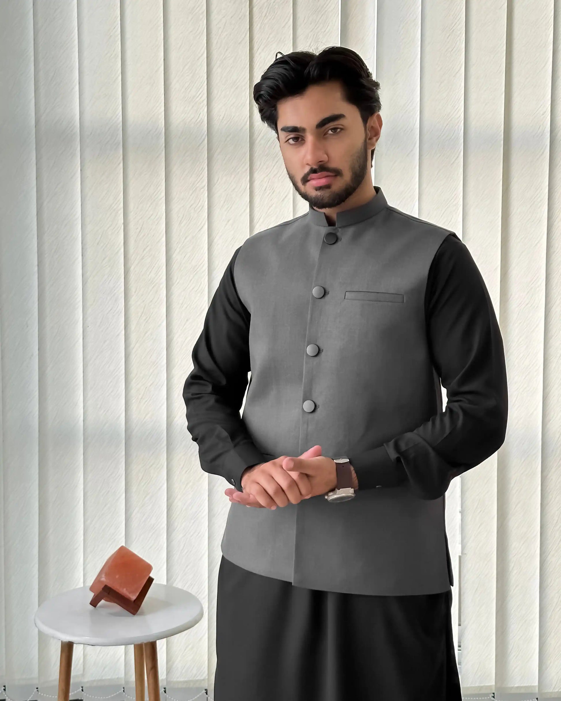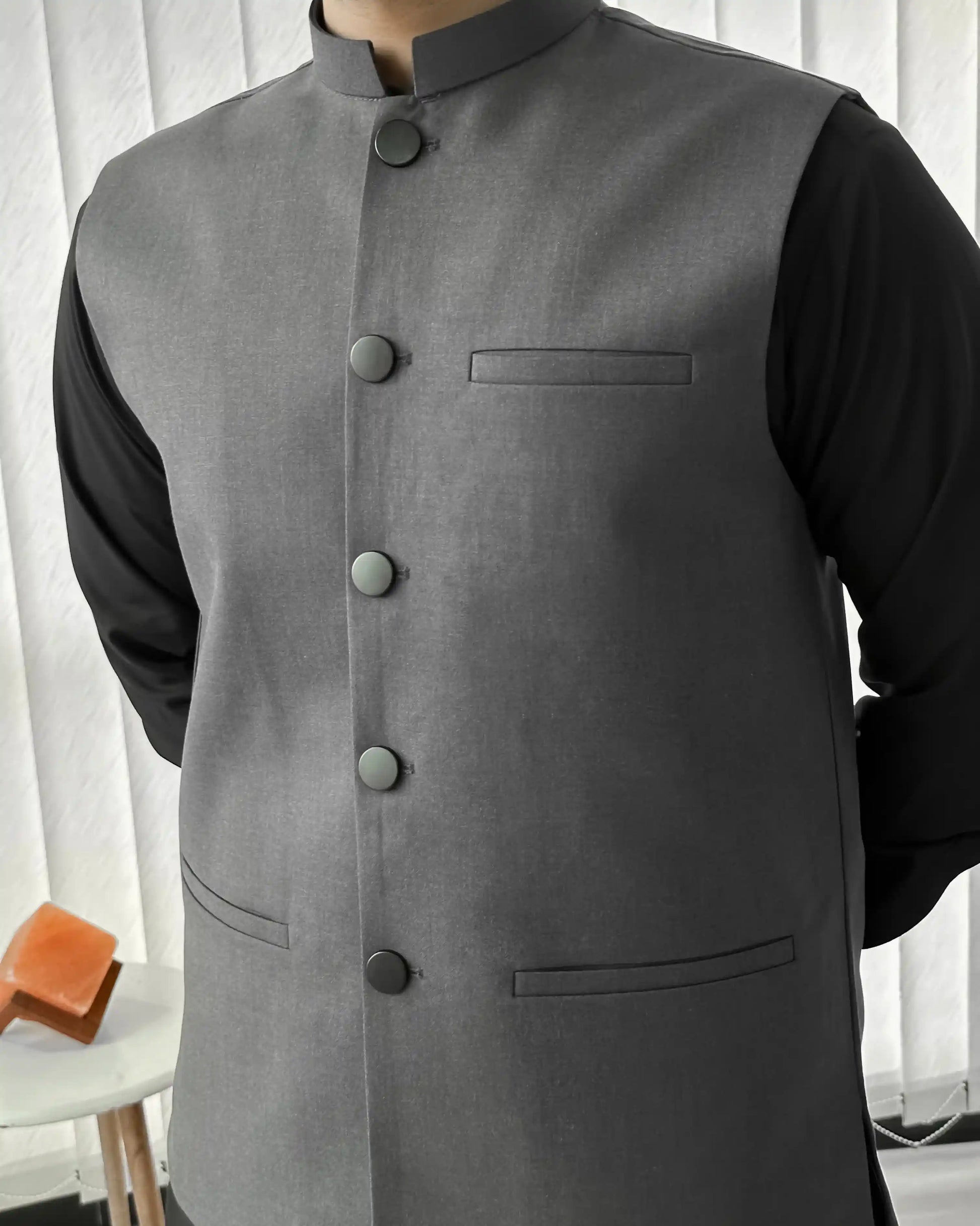 Black Kurta Shalwar with Gray Suiting Waistcoat - Straight Cut - Men