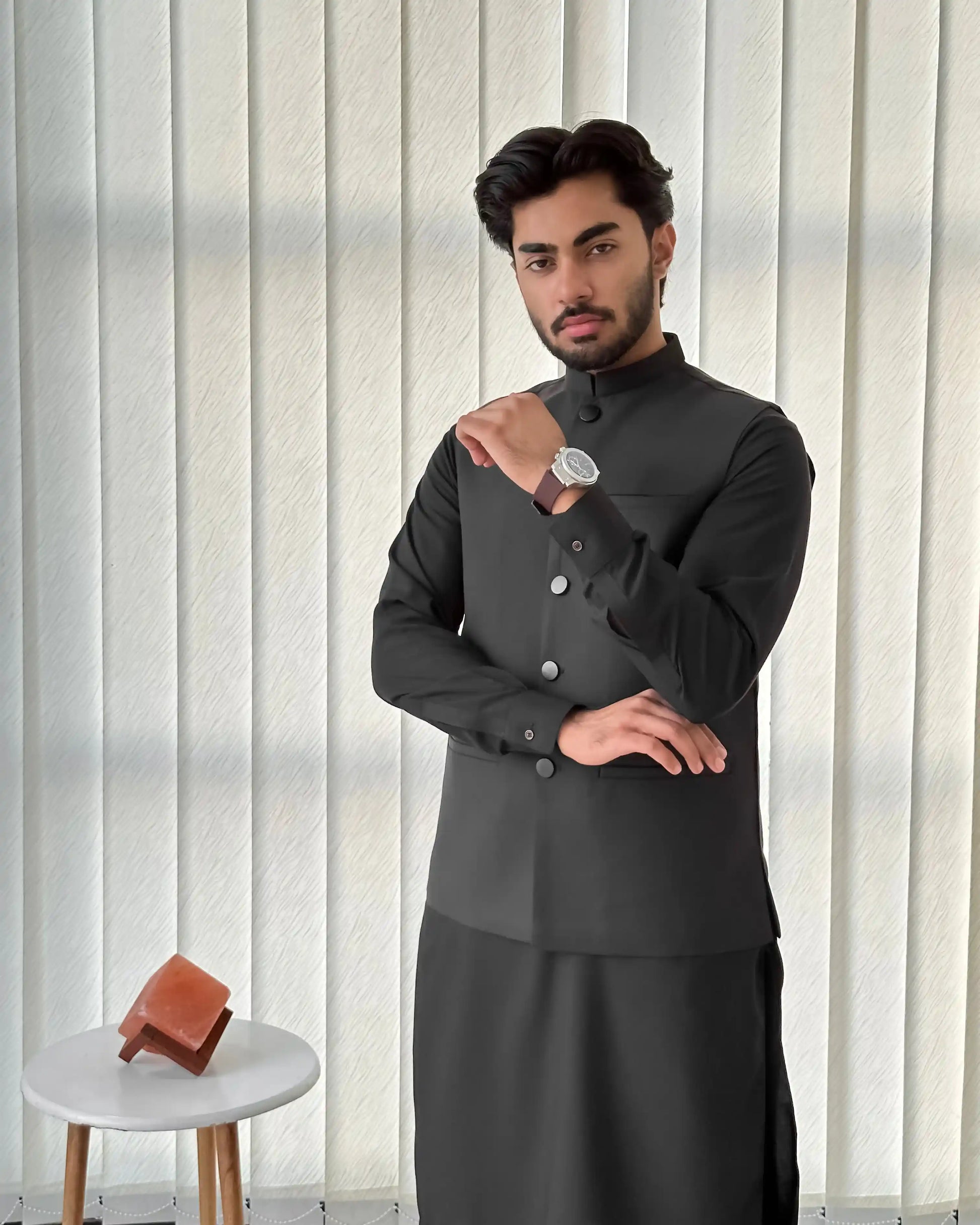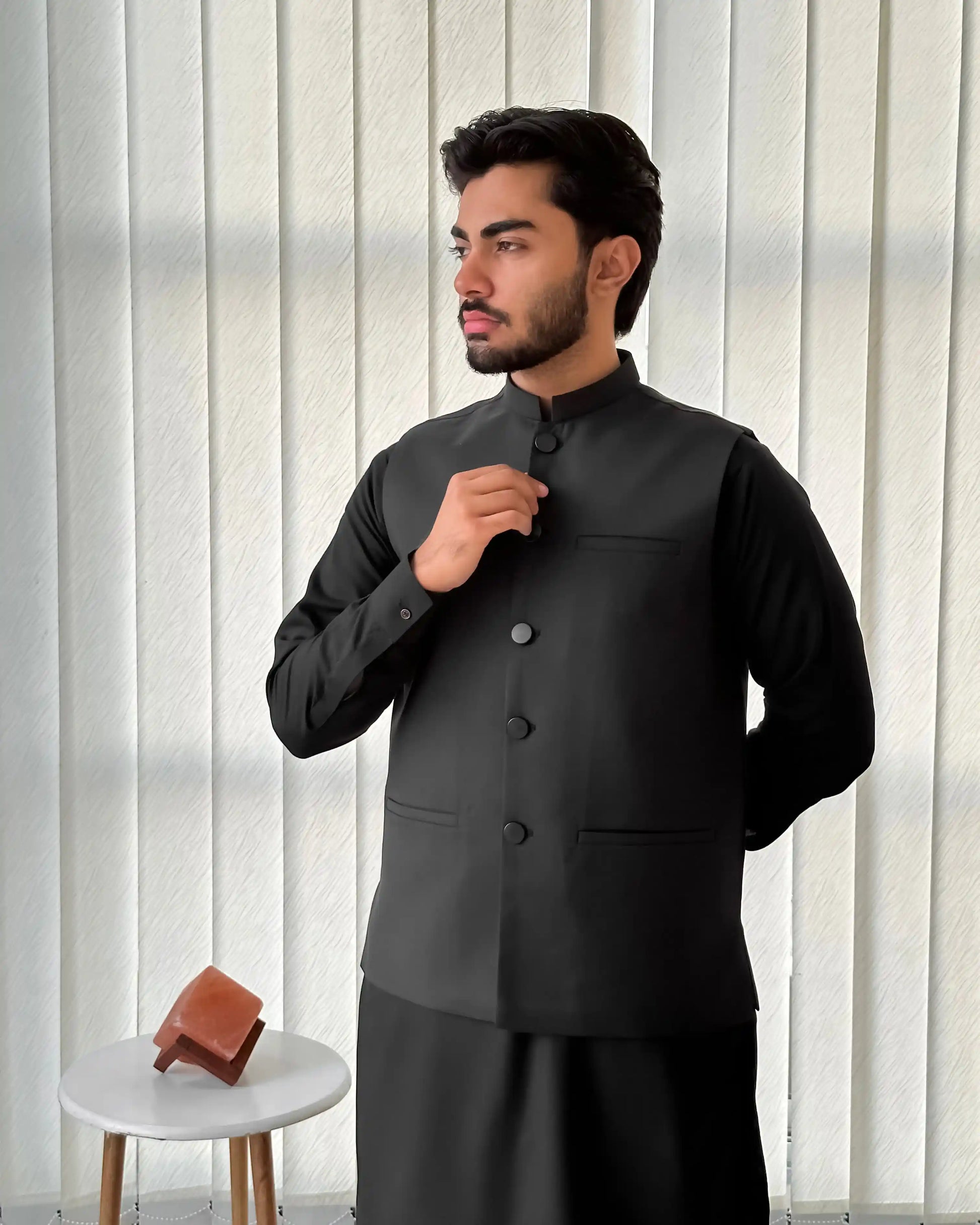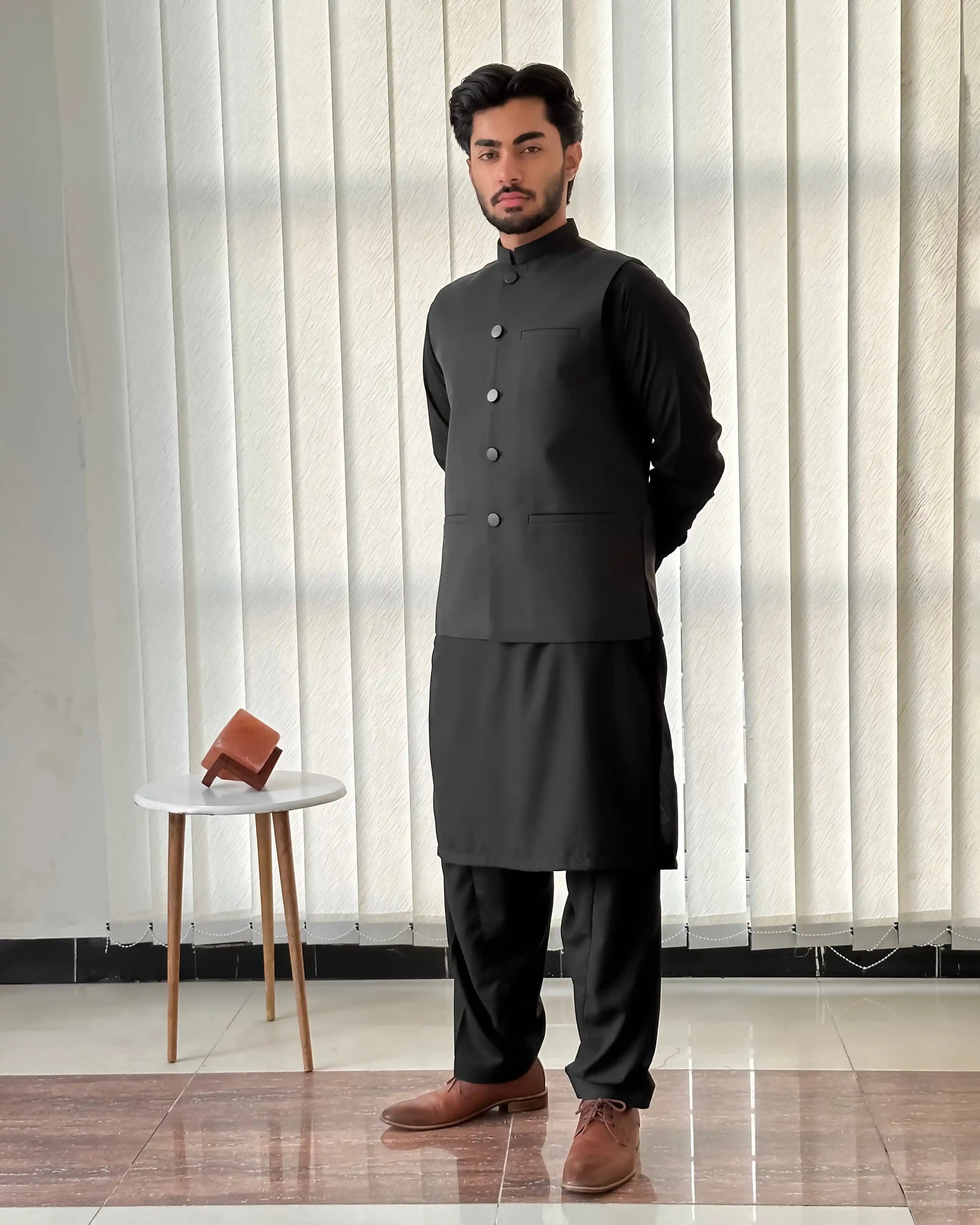 Black Kurta Shalwar with Suiting Waistcoat - Straight Cut - Men